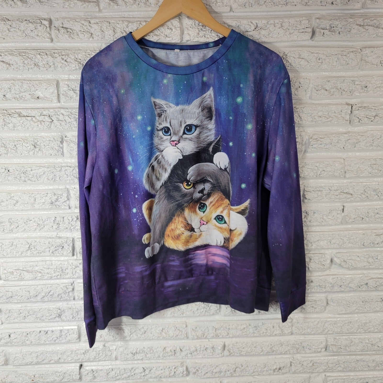 Cats Kittens Womens Top 1XL Plus Tee Long Sleeve Blue Comfy Poly Blend Crew