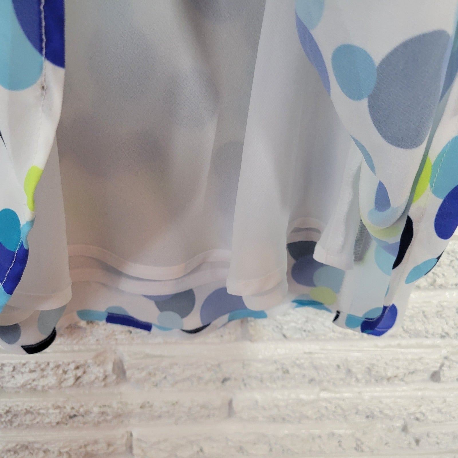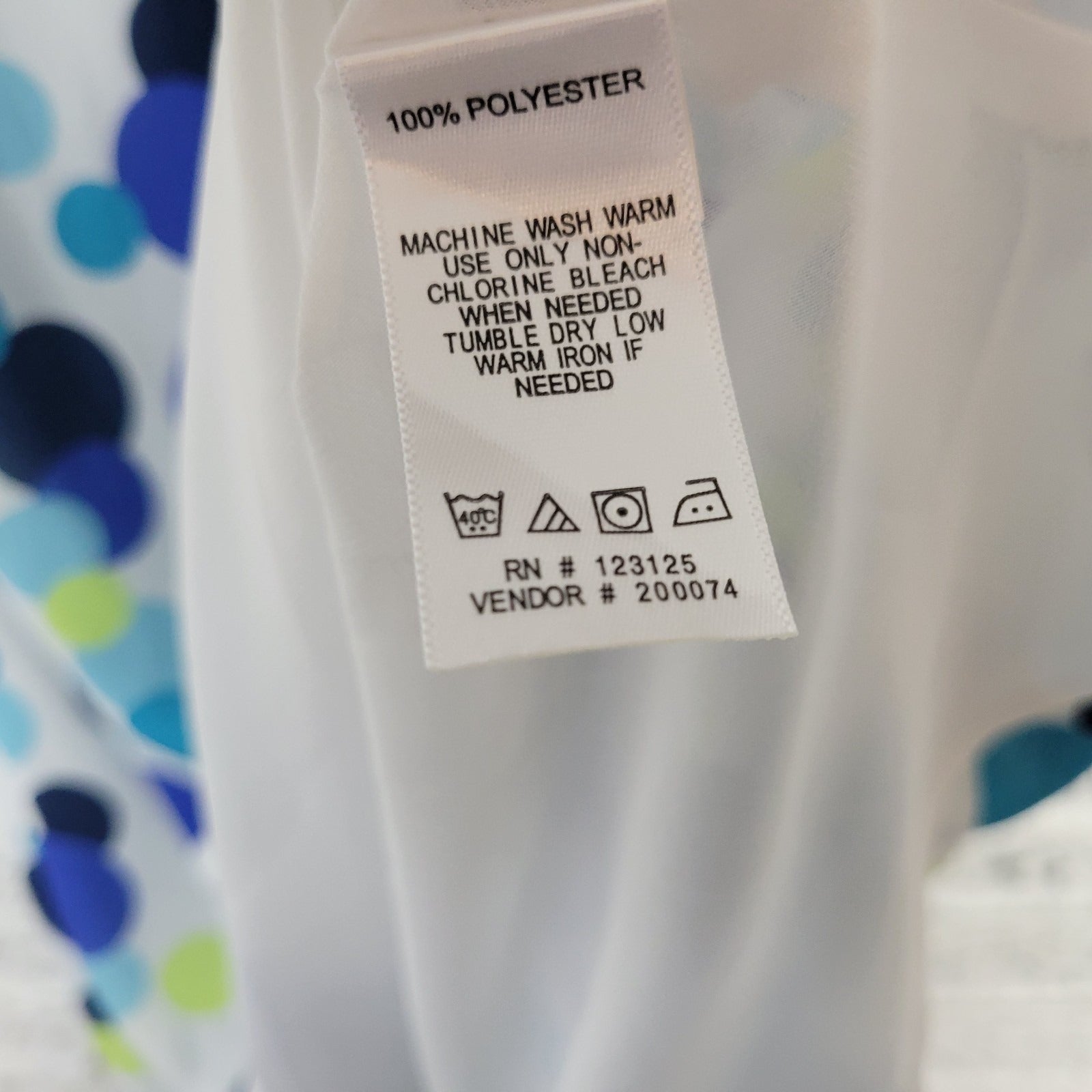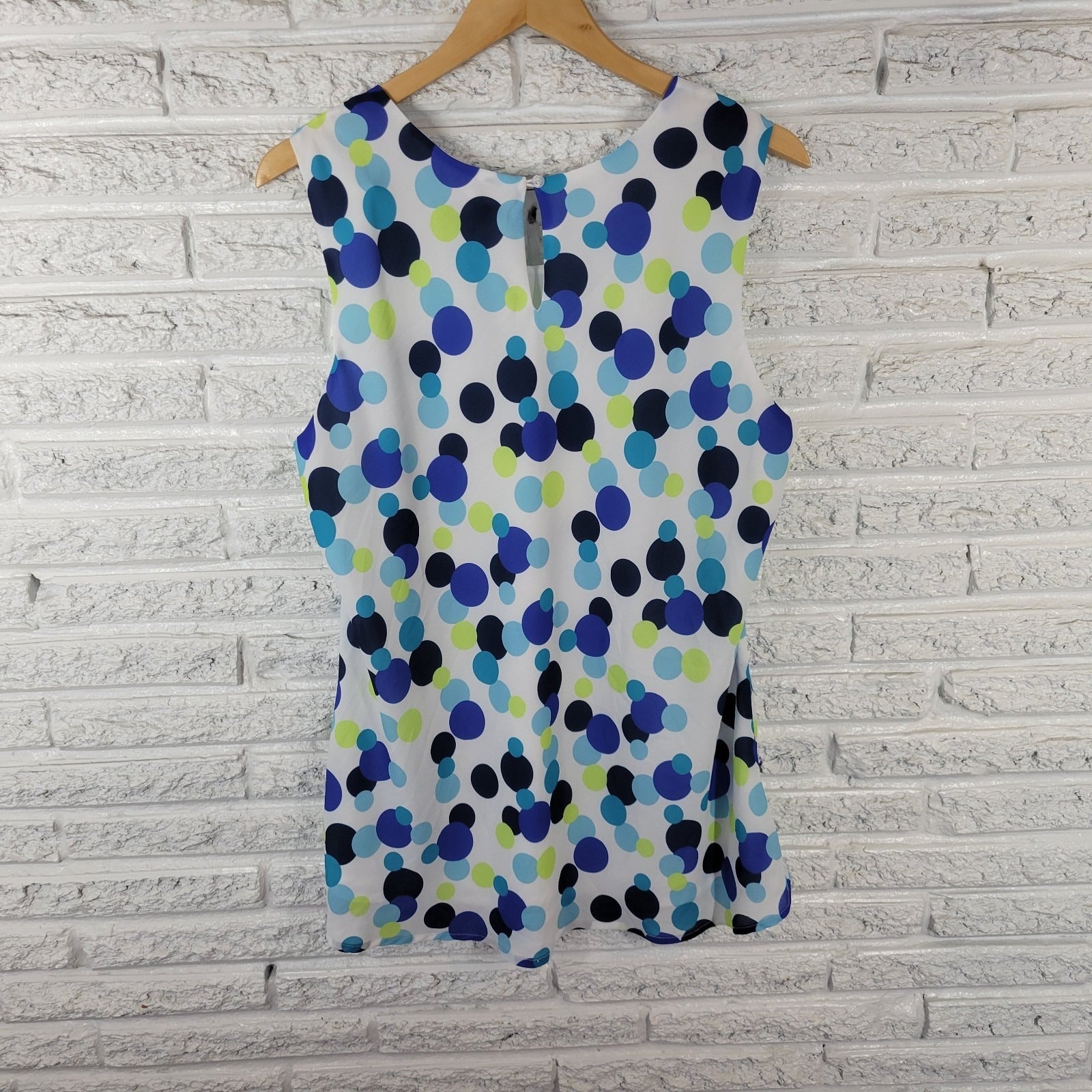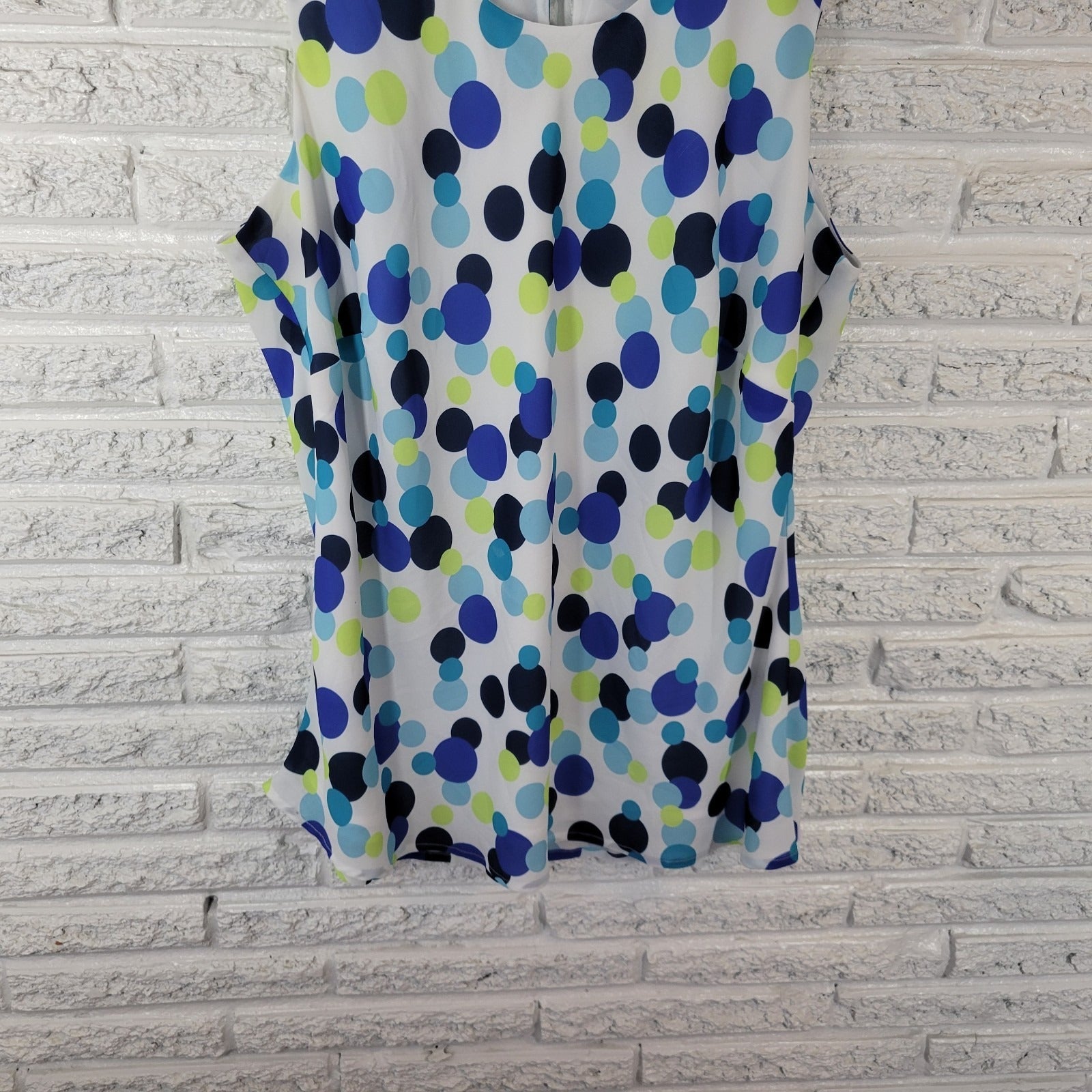 The product is a Chadwicks women's top in size 1X, featuring a blue and green polka dot pattern on a sleeveless tank top. It has a pullover closure and is made of polyester material. The top is lined and has a keyhole back detail, making it suitable for various occasions such as travel, casual, and business. With a regular fit and all-season features, this tank top offers comfort and style for any wardrobe.