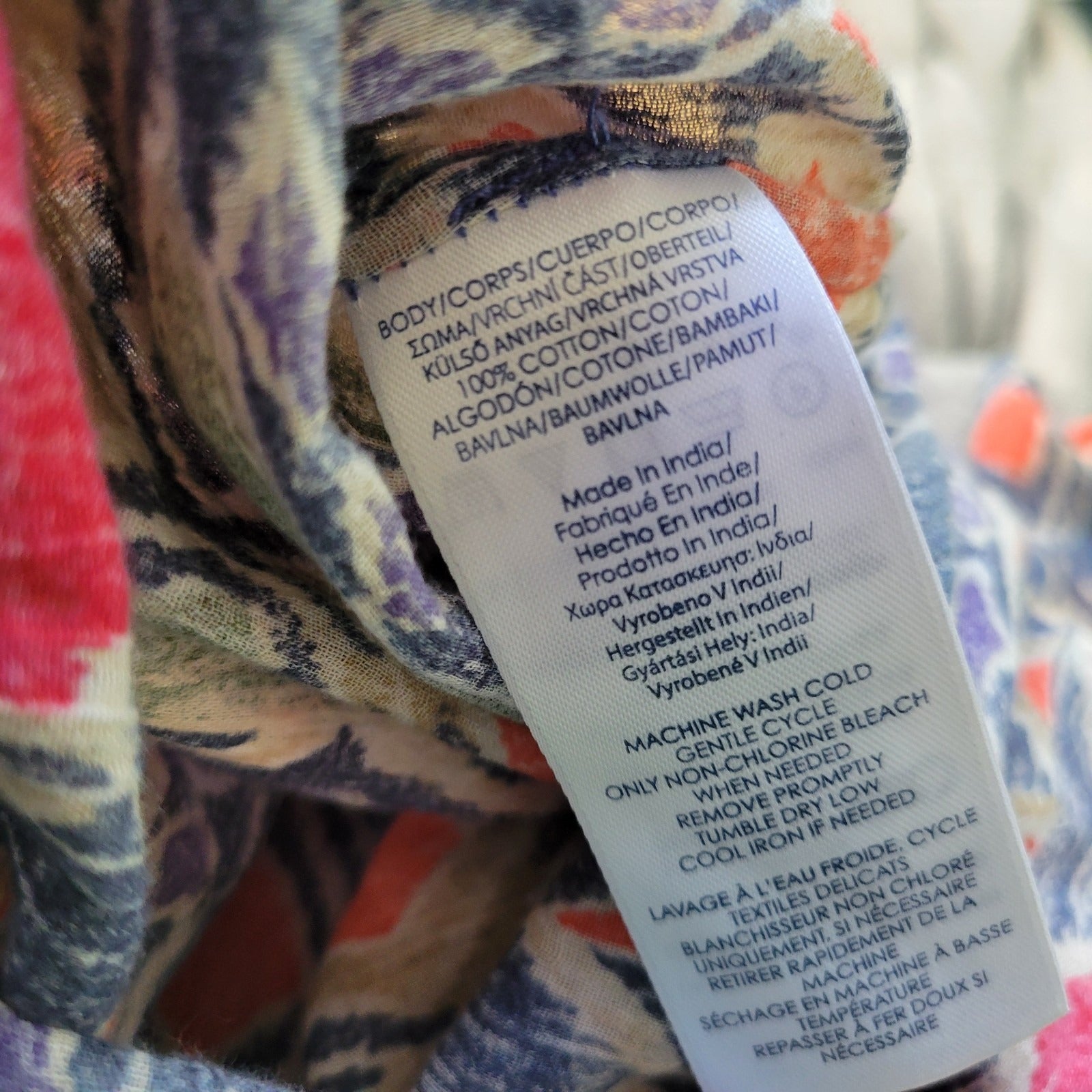 The Chaps Women's Top in size 1X Plus is a stylish and versatile tunic top made from 100% cotton. This blue/red geometric blouse features 3/4 sleeves and an on/off shoulder design, making it perfect for casual or travel occasions. The pullover closure and regular fit ensure comfort and ease of wear. Easy to care for with machine washable instructions, this lightweight top is suitable for all seasons and is a great addition to any wardrobe. Made in India, this Chaps blouse combines quality craftsmanship with a fashionable design.