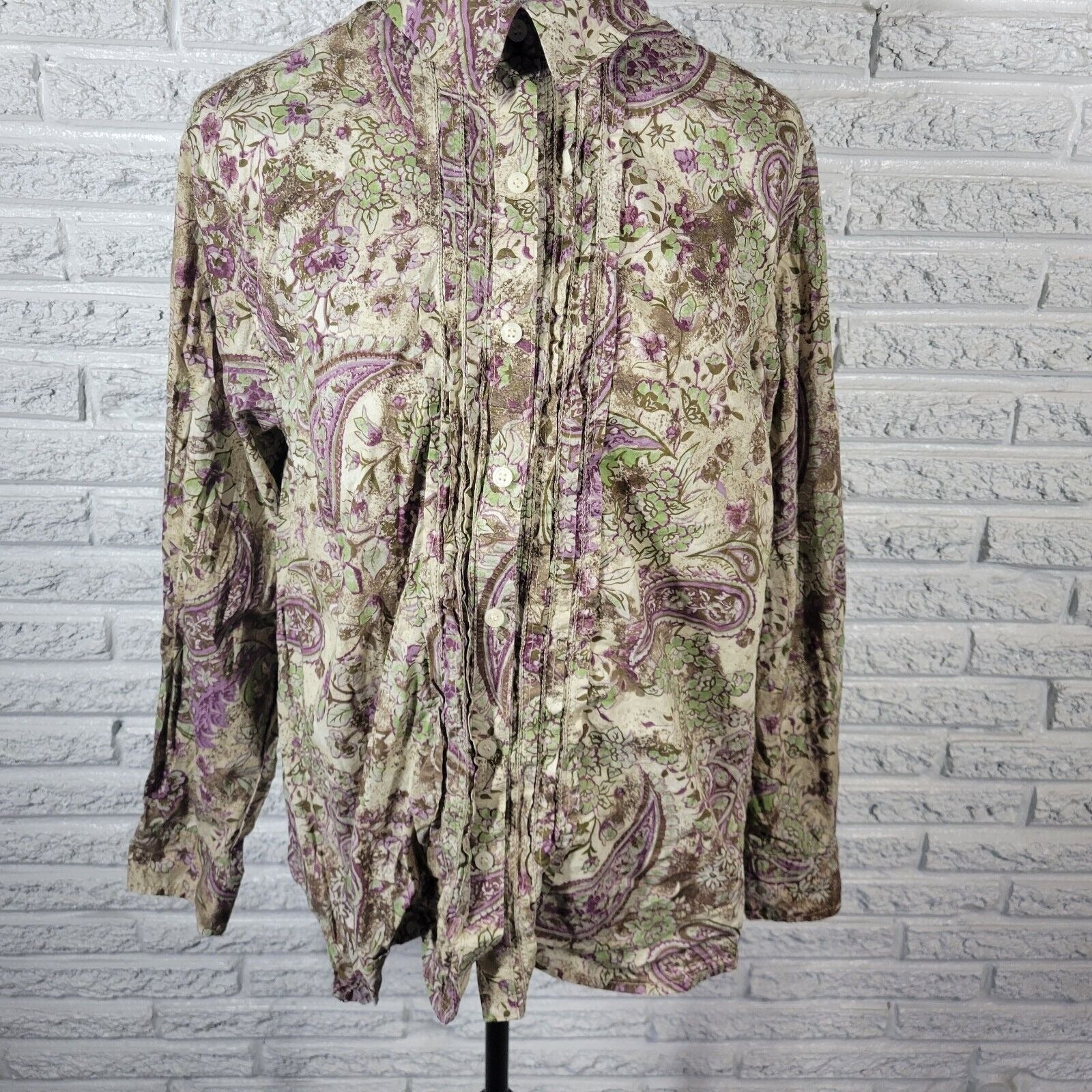 Charter Club Womens Top 20W Plus Long Sleeve Green Paisley Floral Pintuck Cotton