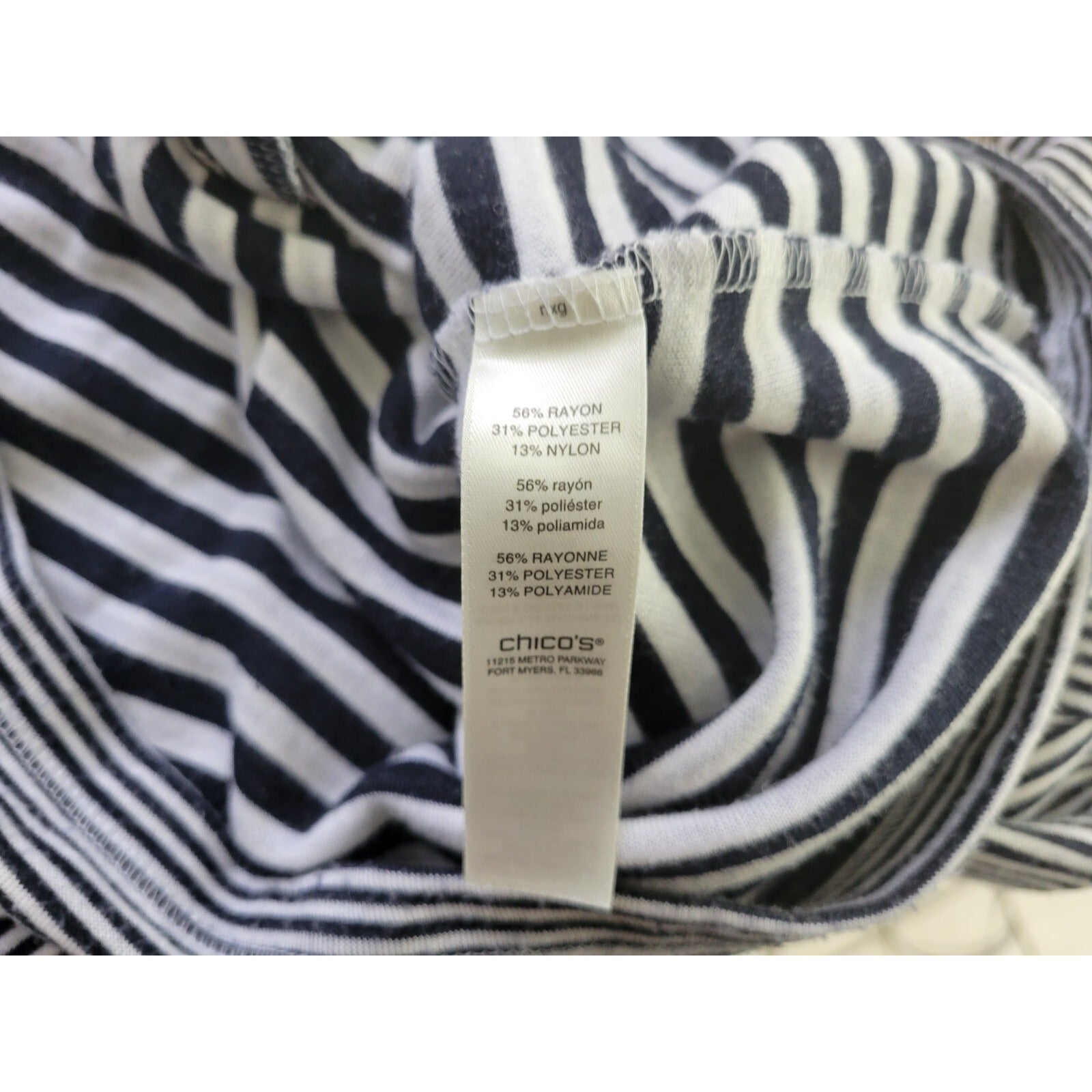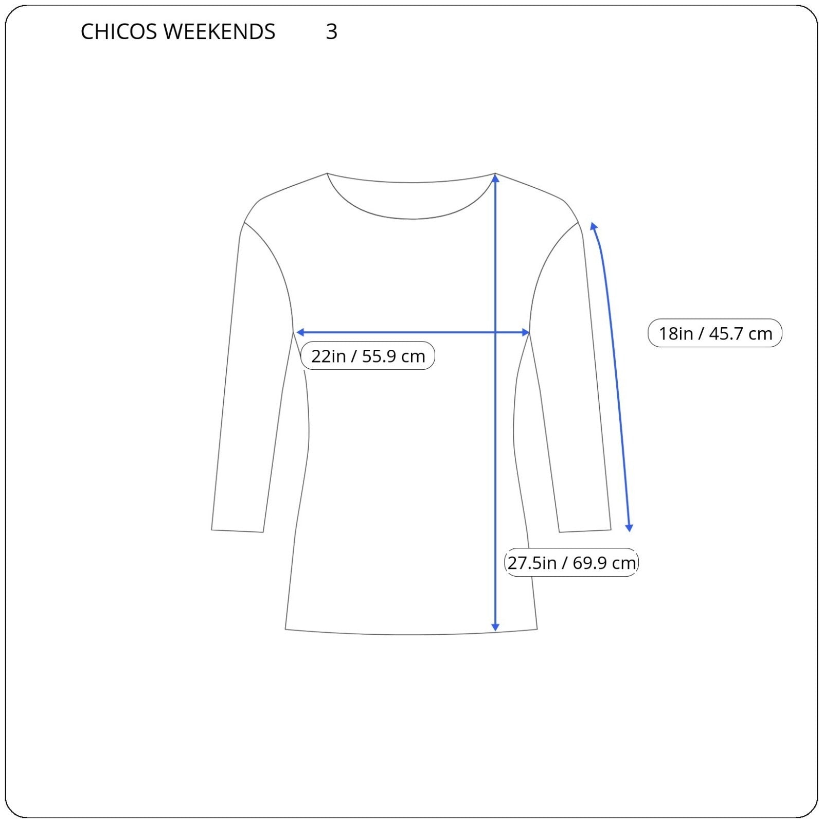 This Chico's Weekends blouse is a stylish addition to any wardrobe. The black striped pattern adds a touch of sophistication, while the 3/4 sleeves and V-neckline make it suitable for casual occasions. The pullover closure and pockets make it convenient and practical. Made from a knit fabric consisting of polyester, nylon, and rayon, this blouse is machine washable and suitable for all seasons. The regular fit and size type of regular ensure a comfortable and flattering fit, while the XL size and black color provide a versatile and timeless option. This blouse is perfect for women who want a basic yet stylish top for their wardrobe.