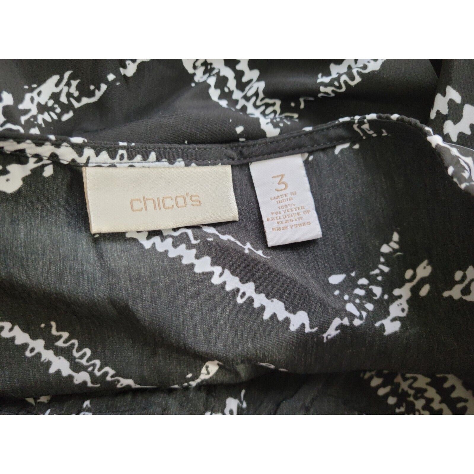 This Chicos Women Top in size 3 Standard Extra Large XL features a stylish design with 3/4 sleeves and a round neckline. Made from polyester in a watercolor black shade, this pullover blouse is perfect for casual, business, or travel occasions. The regular fit and elastic waist make it comfortable for all seasons, while the machine washable fabric ensures easy care. Perfect for any season, this basic yet versatile top by Chico's is a must-have for any woman's wardrobe.