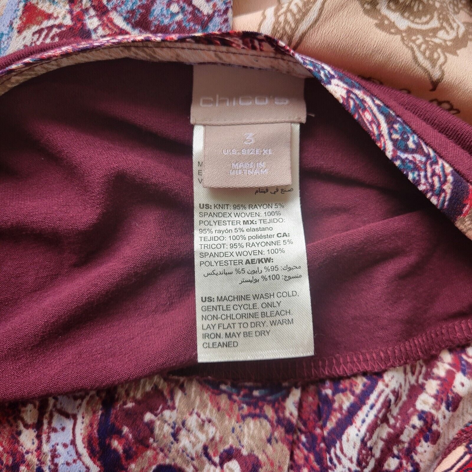 Elevate your everyday style with the Chico's Women's Top. Designed in vibrant purple/burgundy with a captivating geometric mandala pattern, this tee is sure to make a statement. The long sleeves and V-neck cut offer a comfortable and flattering fit for everyone in size XL, thanks to its regular sizing. Crafted from a soft blend of rayon and spandex, this T-shirt is lightweight and stretch-friendly, making it ideal for any season. Whether you're out for a casual stroll or enjoying a weekend getaway, this top with its convenient pocket detail is a versatile addition to your wardrobe, ready for both travel and everyday wear. Machine washable for easy care, it's a piece that combines convenience with effortless style.