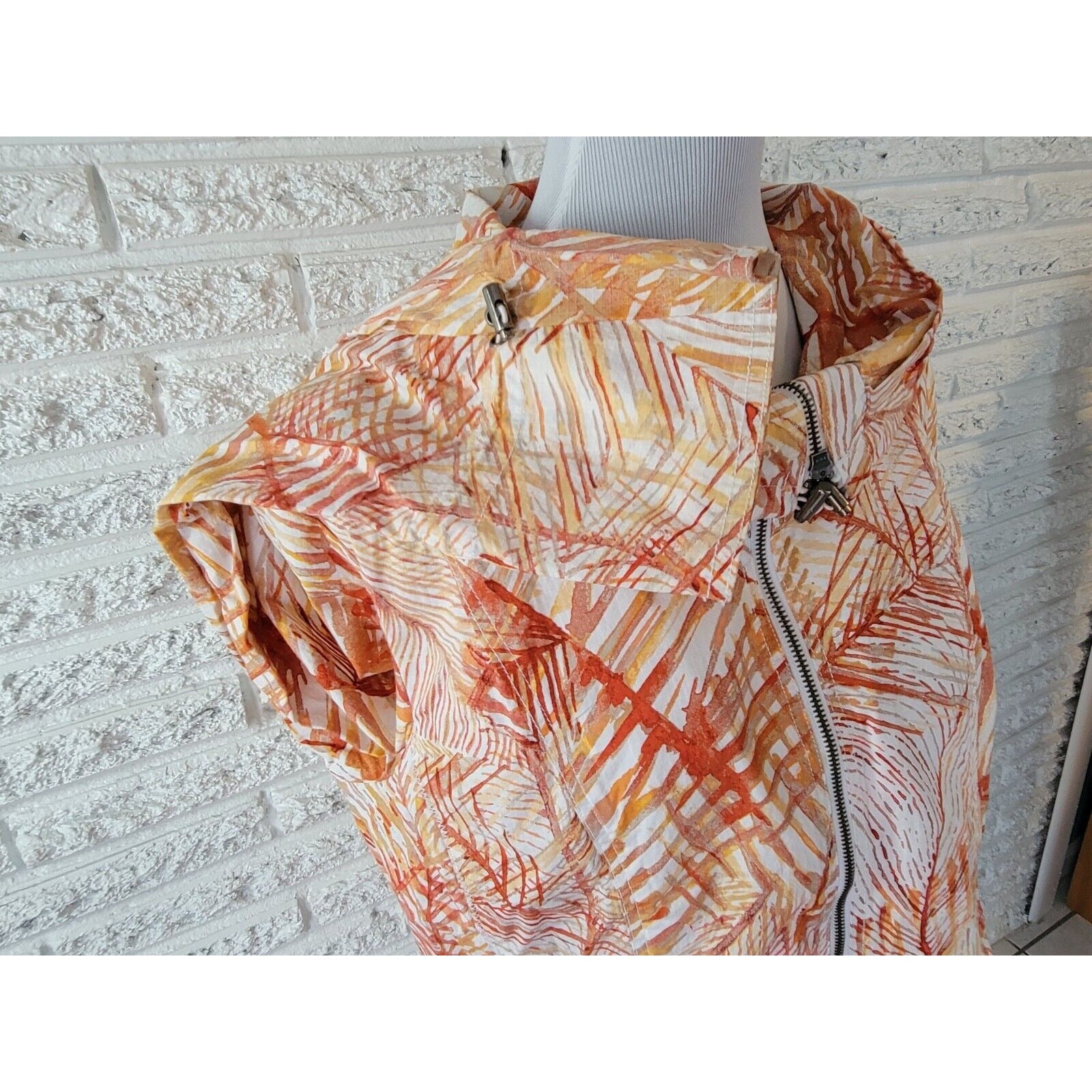 Elevate your casual look with this Chico's gold/orange watercolor shacket jacket. The collared neckline and classic/fitted sleeves provide a stylish and comfortable fit, while the zip closure adds an extra touch of convenience. Made from a comfortable cotton blend material with stretch, this button-up shirt is perfect for all seasons and occasions. This XL-sized shirt is machine washable for easy maintenance and comes from a well-known brand. The beautiful gold watercolor design adds a pop of color to your wardrobe. Whether you're dressing up or down, this shirt will complement your style effortlessly.