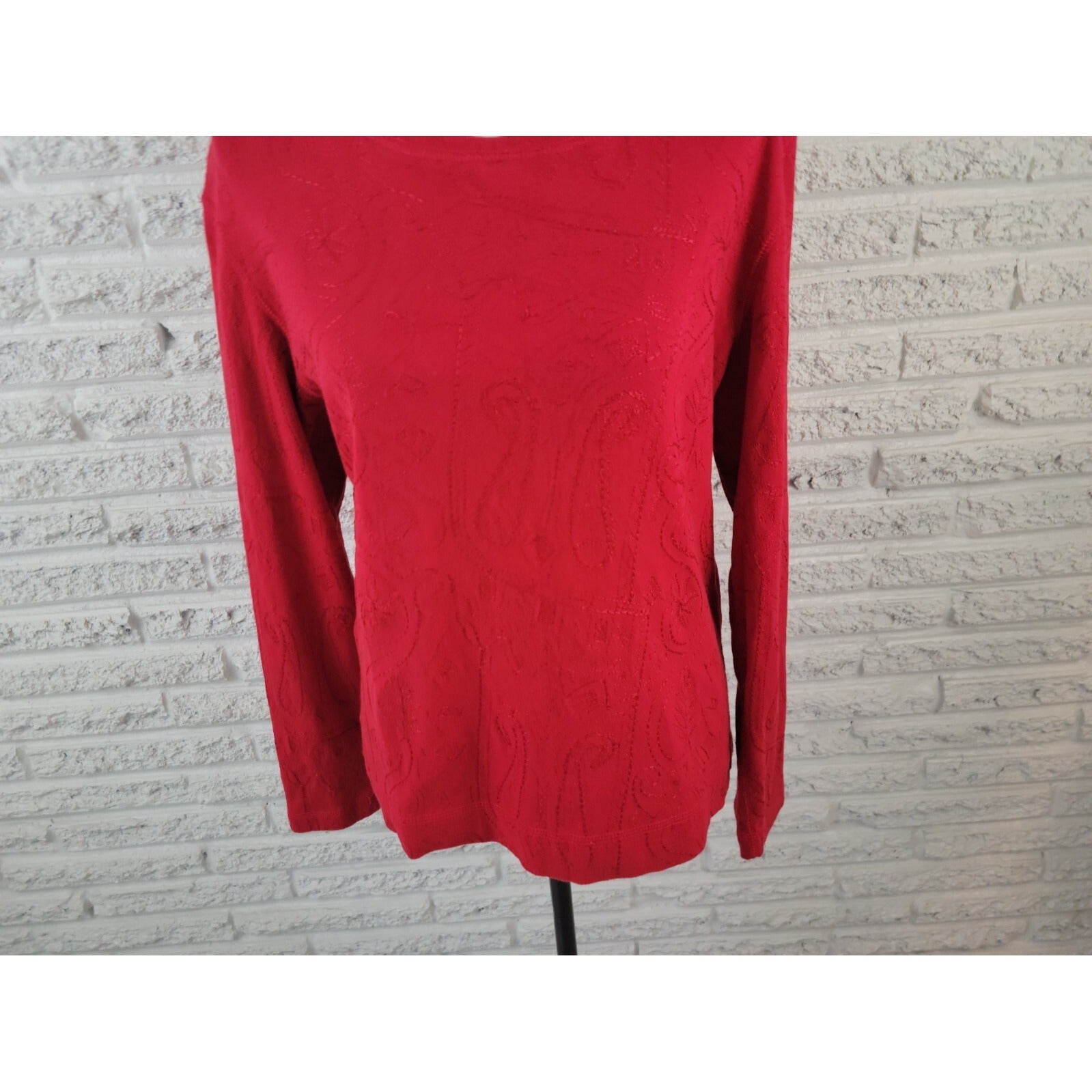 This Chico's women's top is a classic addition to your wardrobe. With a boat neck and long sleeves, it is perfect for both casual and business occasions. The pullover closure and stretchy cotton material make it comfortable and easy to wear. The red color and embroidered accents add a touch of elegance to this basic blouse. It is machine washable and suitable for all seasons. This top is available in size XL and has a regular fit. Whether you are dressing up or down, this Chico's women's top is a versatile piece that will complete any outfit.