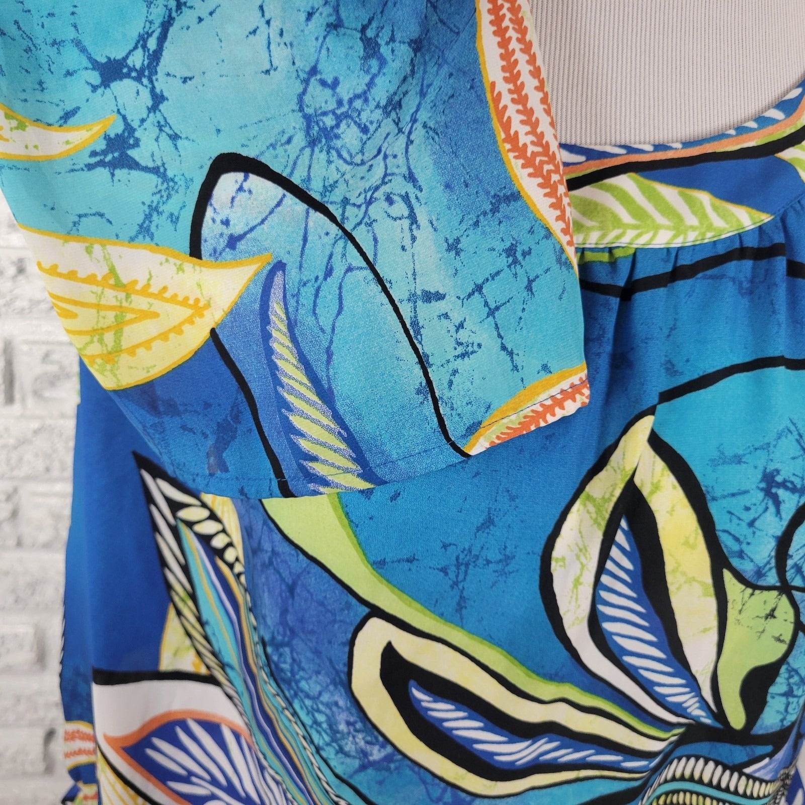 This Chico's women's top in size XL features a blue/yellow floral pattern on a 3/4 sleeve top with an elastic waist for a comfortable and casual fit. Made of polyester, this pullover top is machine washable and perfect for travel or everyday wear. The regular fit and basic style make it suitable for all seasons, from winter to summer. This top is a versatile addition to any wardrobe, offering a relaxed and stylish option for any occasion.