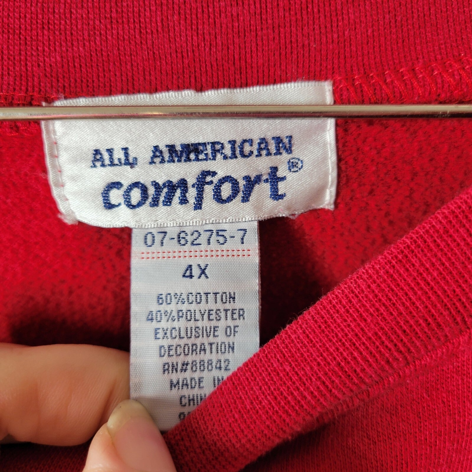 Get ready for the holiday season with this festive Christmas All American Comfort women's sweatshirt in a vibrant red color. The pullover style features a crew neckline and long sleeves, perfect for keeping you cozy during travel, activewear, or casual occasions. Made of a comfortable cotton blend material, this sweatshirt is machine washable for easy care.  The sweatshirt is designed with a cute and playful theme of Christmas, featuring adorable red kittens on the front. The stretchy and all-season features make it a great addition to your wardrobe, perfect for winter, summer, fall, or spring. This sweatshirt is available in a size 4X, and is a regular fit for plus-sized women. This sweatshirt is a great gift option for any woman who loves to show off her love for the holidays.