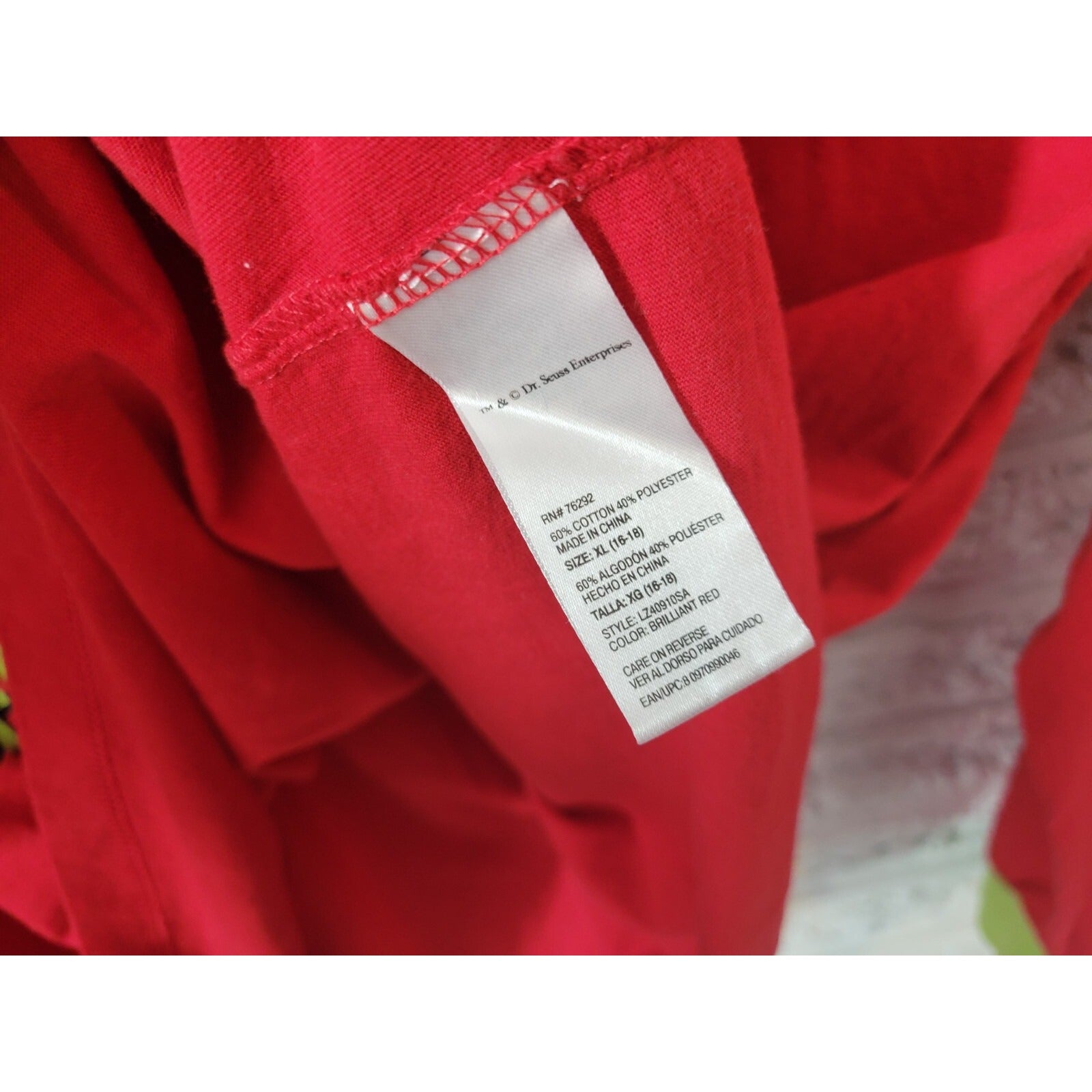 Get into the Christmas spirit with this festive Dr. Seuss Grinch women's pajama top in size XL. The vibrant red color and graphic print of the top will make you stand out in the best way possible. The long sleeves and crew neck design provide comfort and warmth during the chilly winter season, while also being lightweight and breathable for year-round wear. The cotton blend material is machine washable for easy care and maintenance. This pajama top is perfect for any Christmas-themed event or just for lounging around in the comfort of your own home. Add this to your collection of holiday sweaters and enjoy the cozy and fun holidays in style.