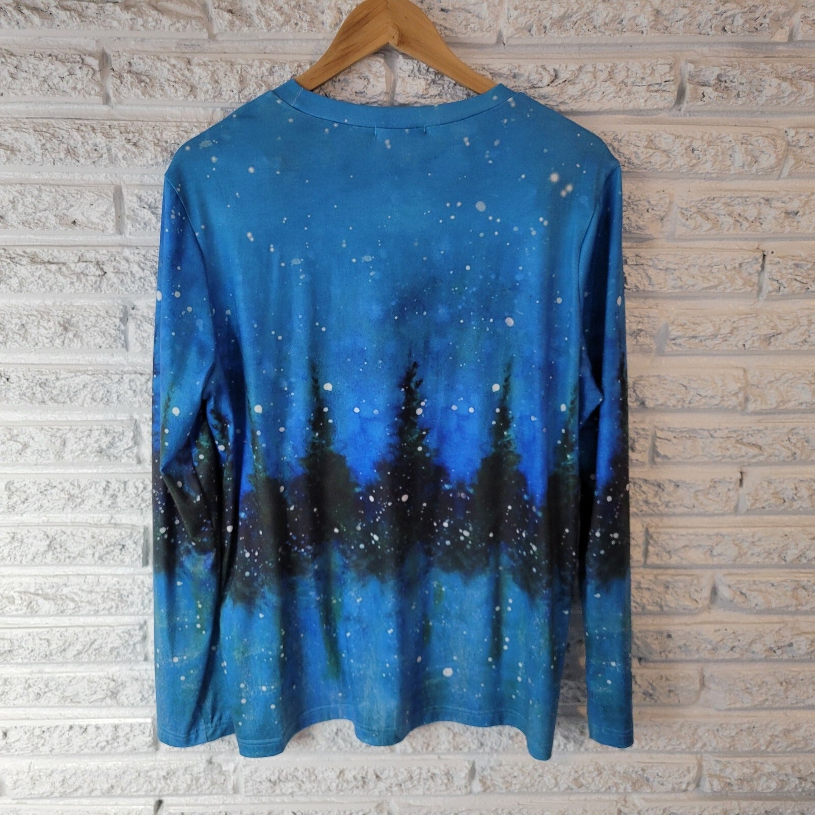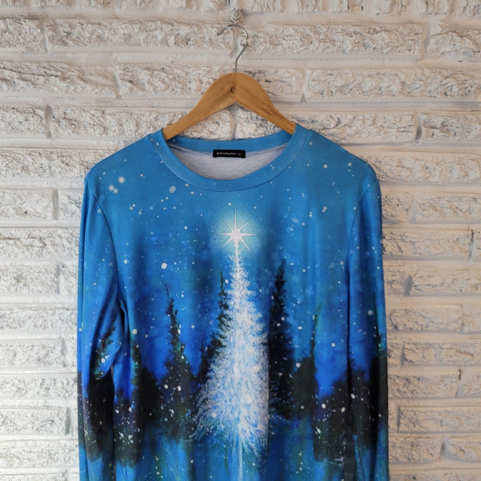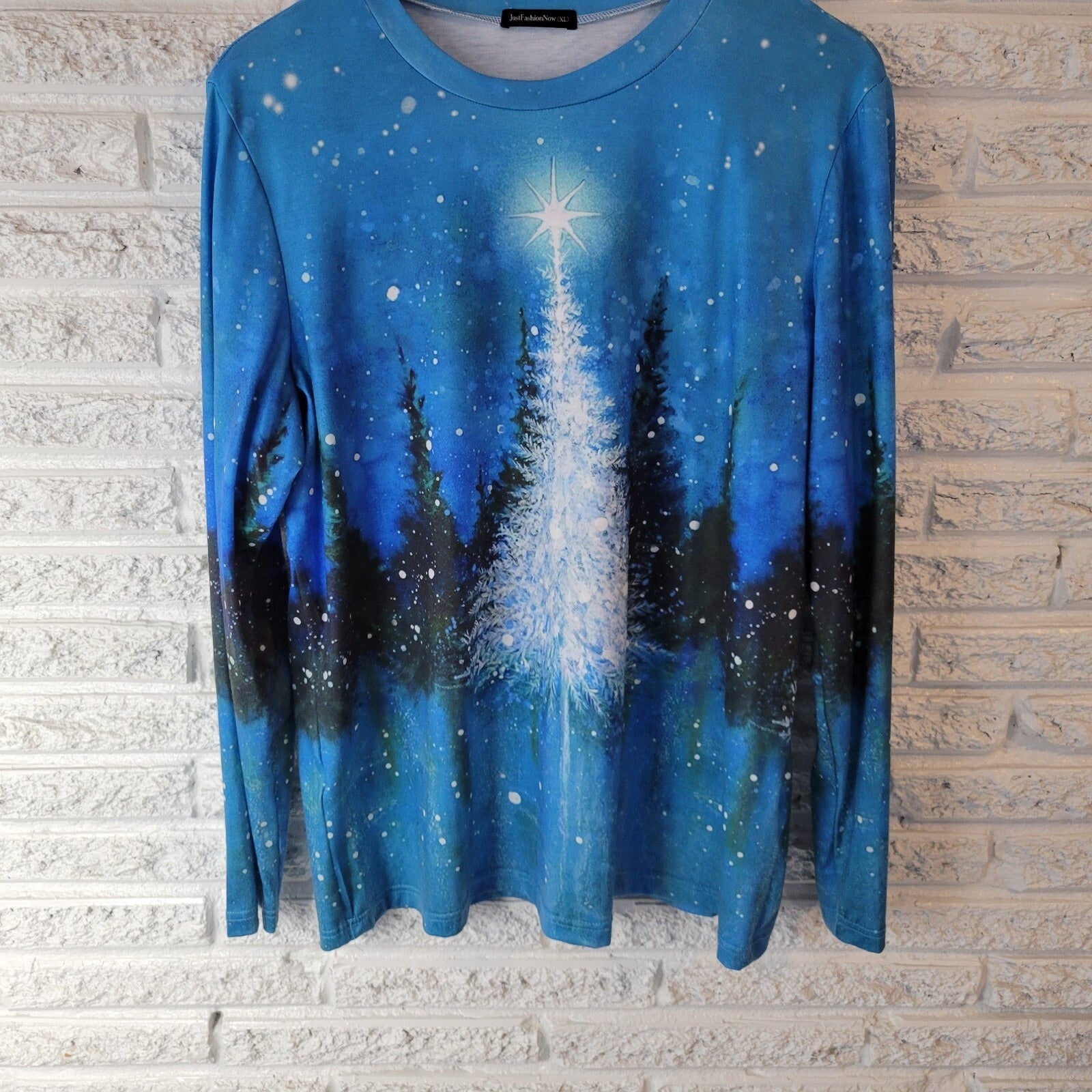 Christmas Just Fashion Now Womens Top XL Tee Long Sleeve Trees Blue Holiday