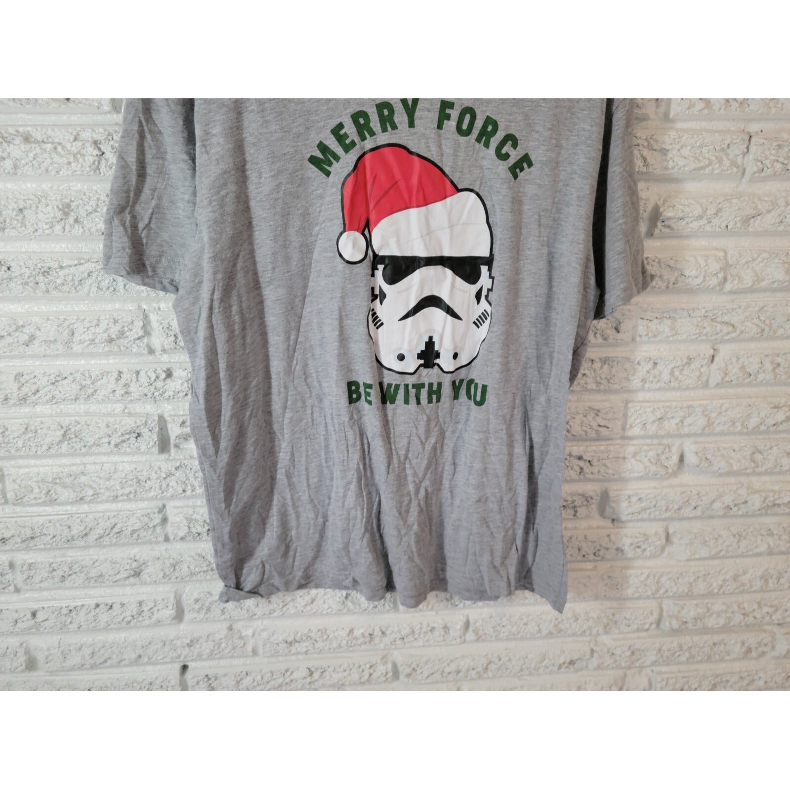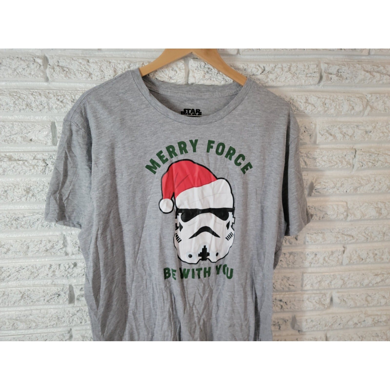 Celebrate this Christmas season in style with this Star Wars-themed unisex top. The gray crew neck tee features a Stormtrooper character design, perfect for casual occasions. The shirt is made from a comfortable cotton blend material with a jersey fabric type, ensuring a regular fit for all body types.  This T-shirt is machine washable and comes in an XL size, making it a great gift for any Star Wars fan. The short-sleeved tee with casual sleeve type and stretch features can be worn in any season, be it winter, summer, fall, or spring. Get this Christmas-themed top and may the Merry Force Be With You.
