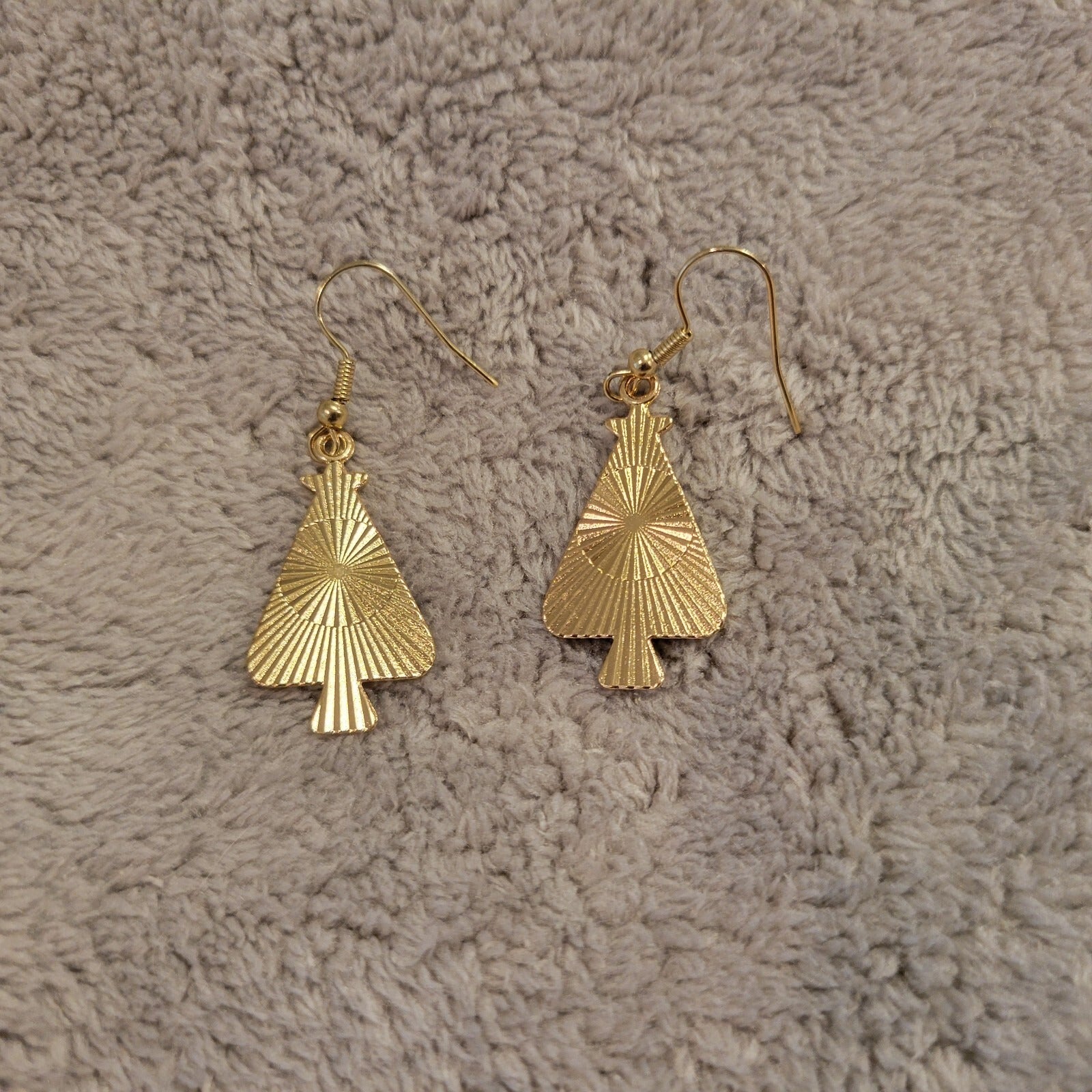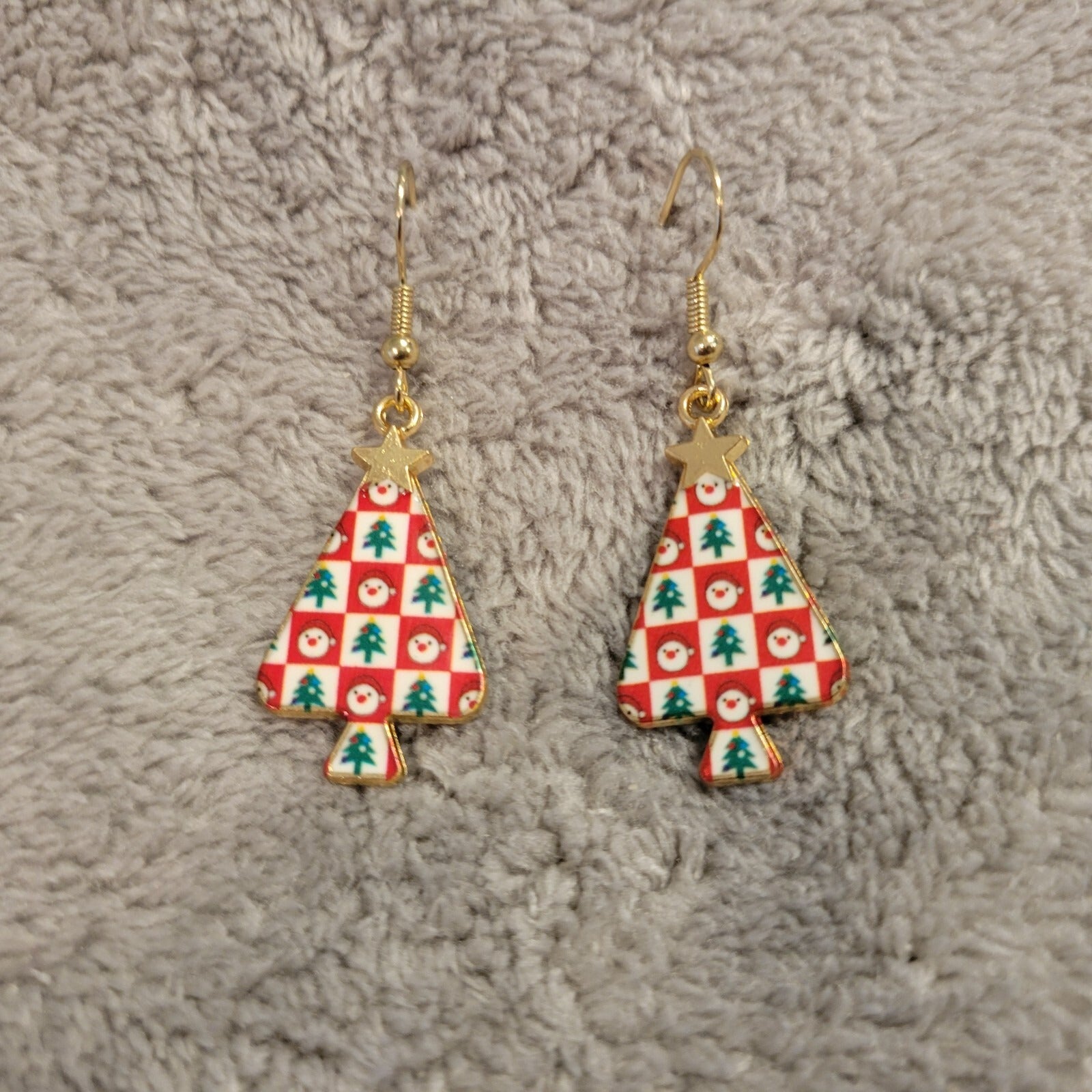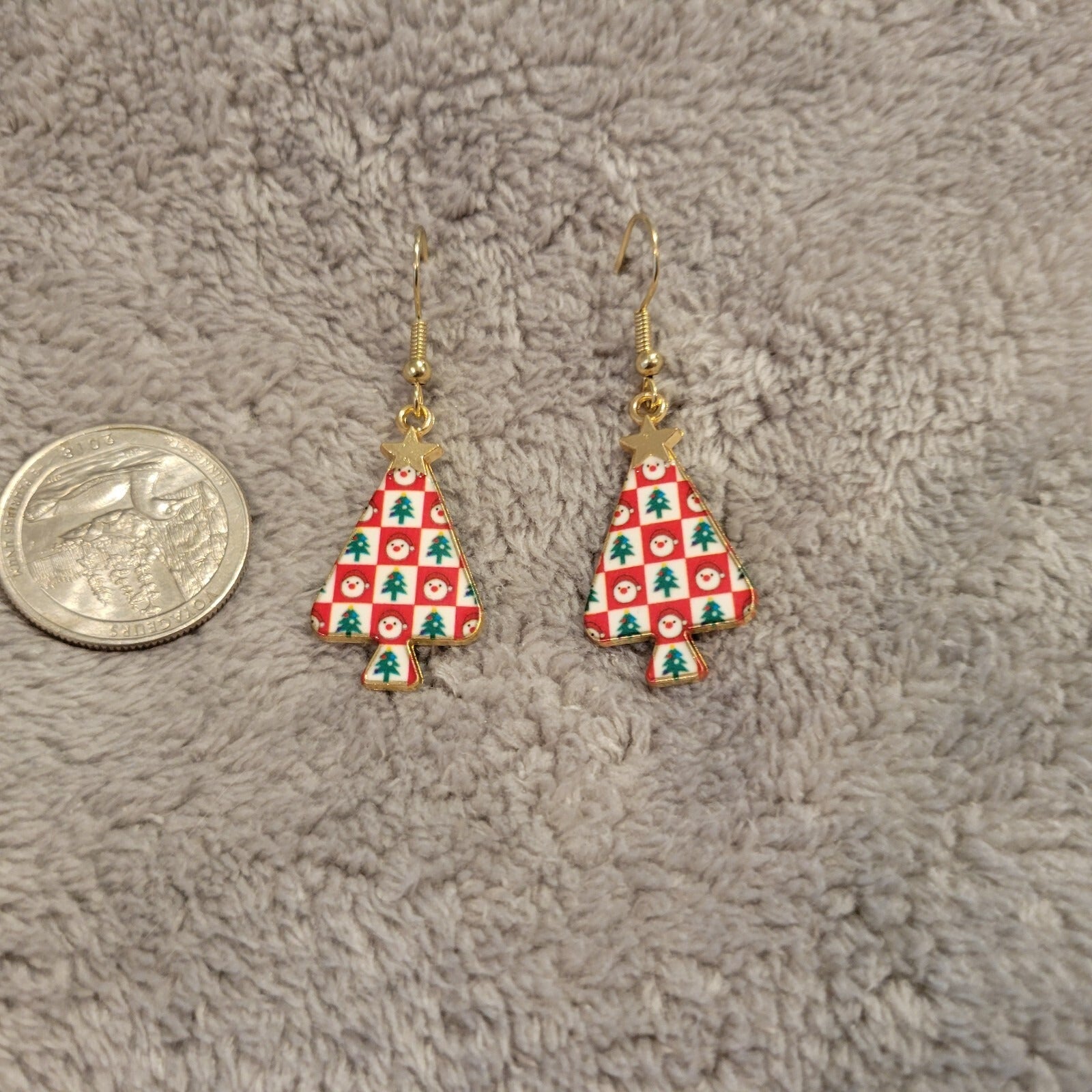 Christmas Trees #1 Womens Earrings One Pair Hanging Red Green Gold Tone Holiday