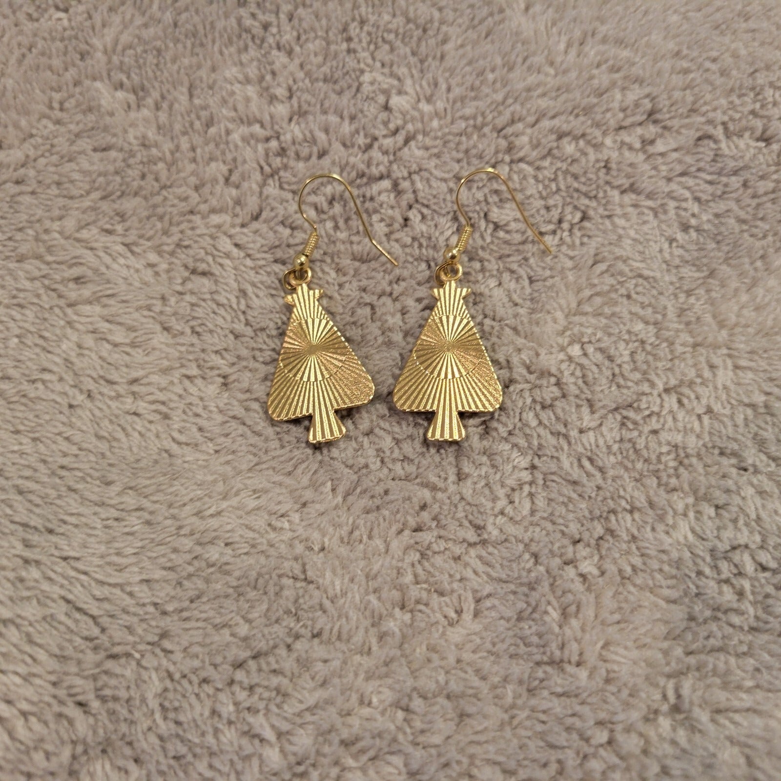 Christmas Trees #6 Womens Earrings One Pair Green Red Hanging Gold Tone Holiday