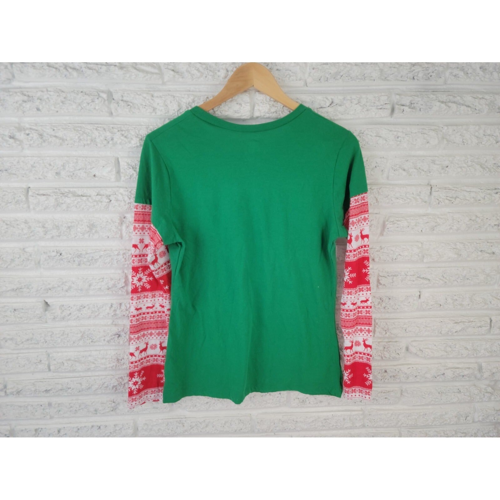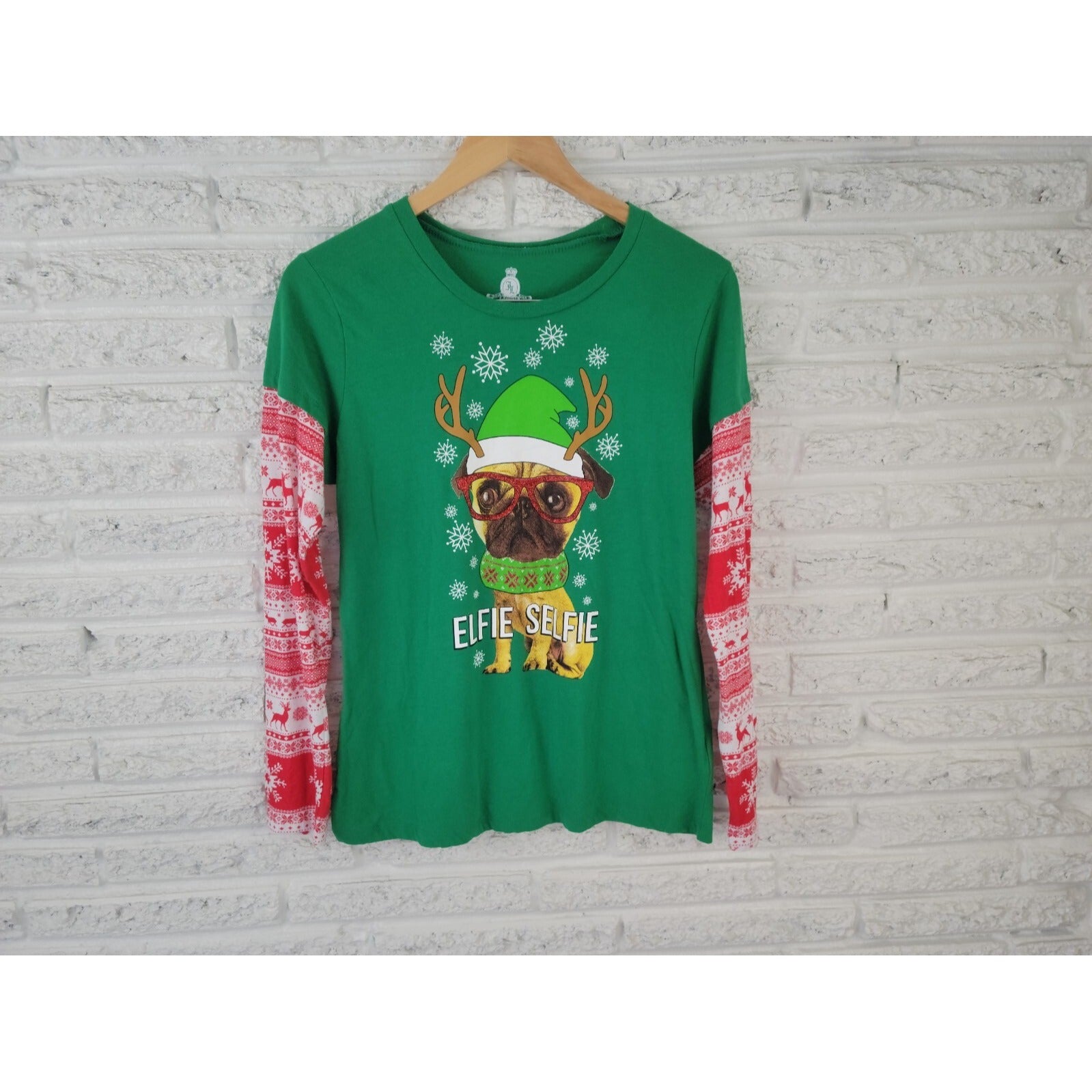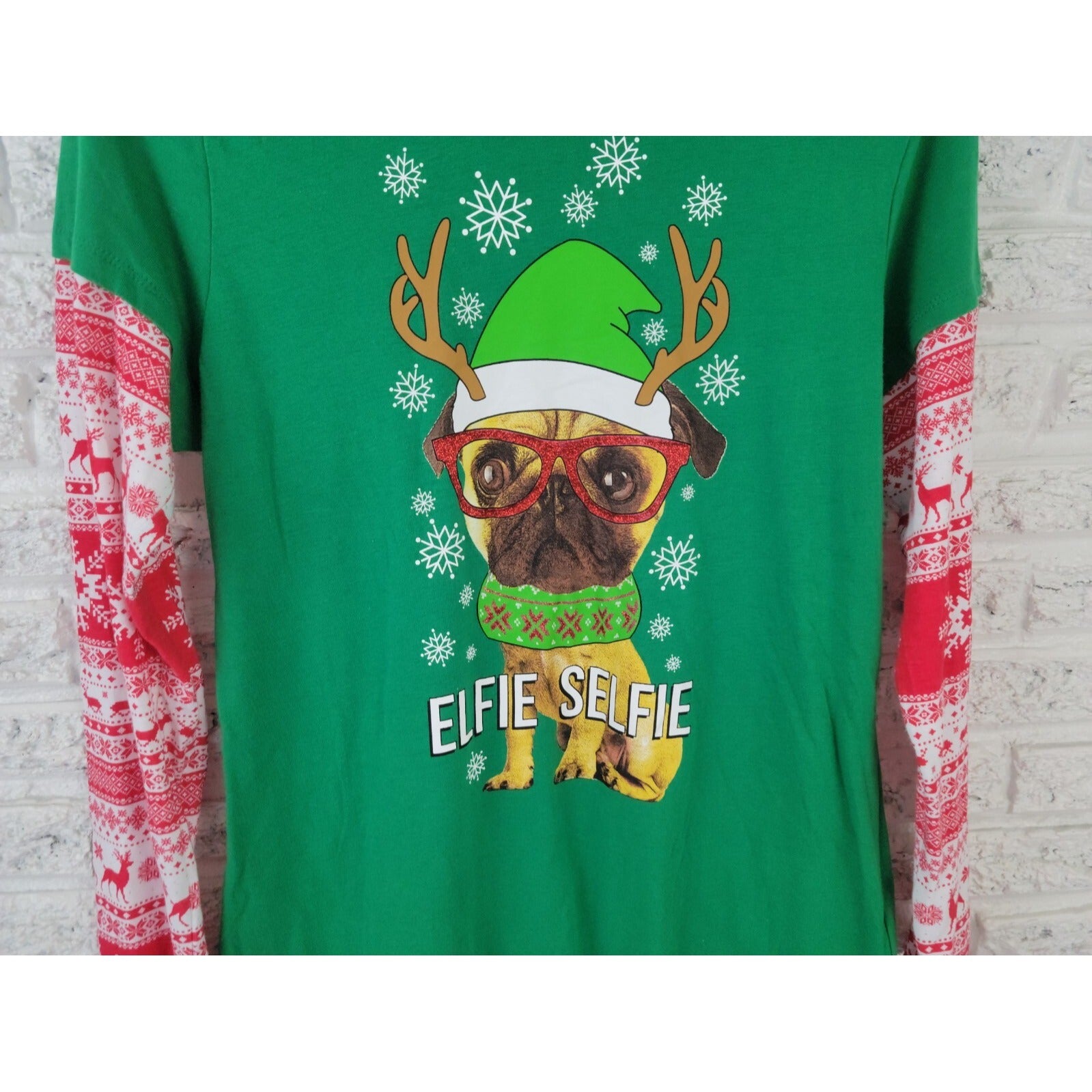 Christmas Women Shirt Extra Large XL Tee Long Sleeve Bull Dog Elfie Selfie Green