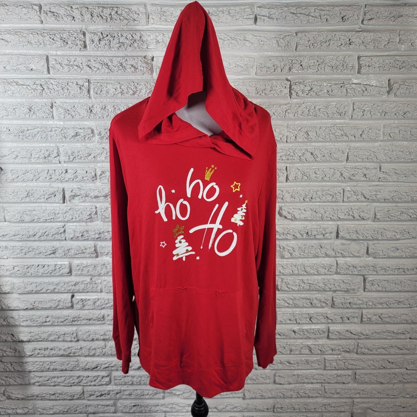 Embrace the festive spirit with the Holiday Time Women's XXL Red Ho Ho Ho Lightweight Hoodie. This comfortable pullover features a high neck and long sleeves, perfect for layering during the cooler months or wearing solo on milder days. Its polyester blend fabric ensures a soft touch with just the right amount of stretch for all-day comfort. The hoodie comes in a vibrant red, adorned with a playful 'Ho Ho Ho' graphic that captures the joy of the holiday season. Designed with a regular fit, it's suitable for any casual occasion or when you're out traveling. The jersey fabric type offers a classic look and feel, while the machine-washable garment is easy to care for, ensuring this piece becomes a cherished part of your holiday wardrobe for years to come.