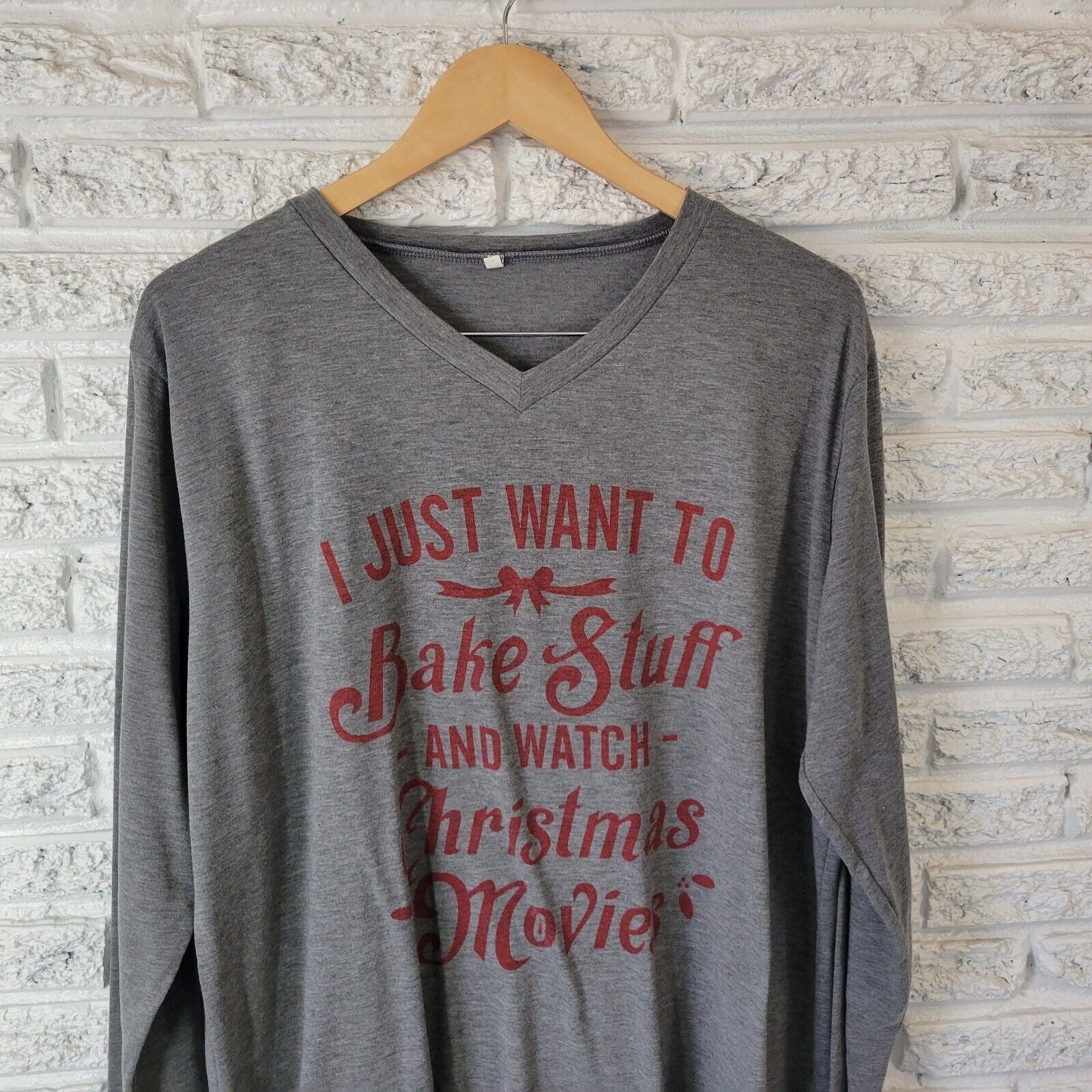 Christmas Womens Top 3XL Plus Tee Long Sleeve Gray Christmas Movies Bake Stuff