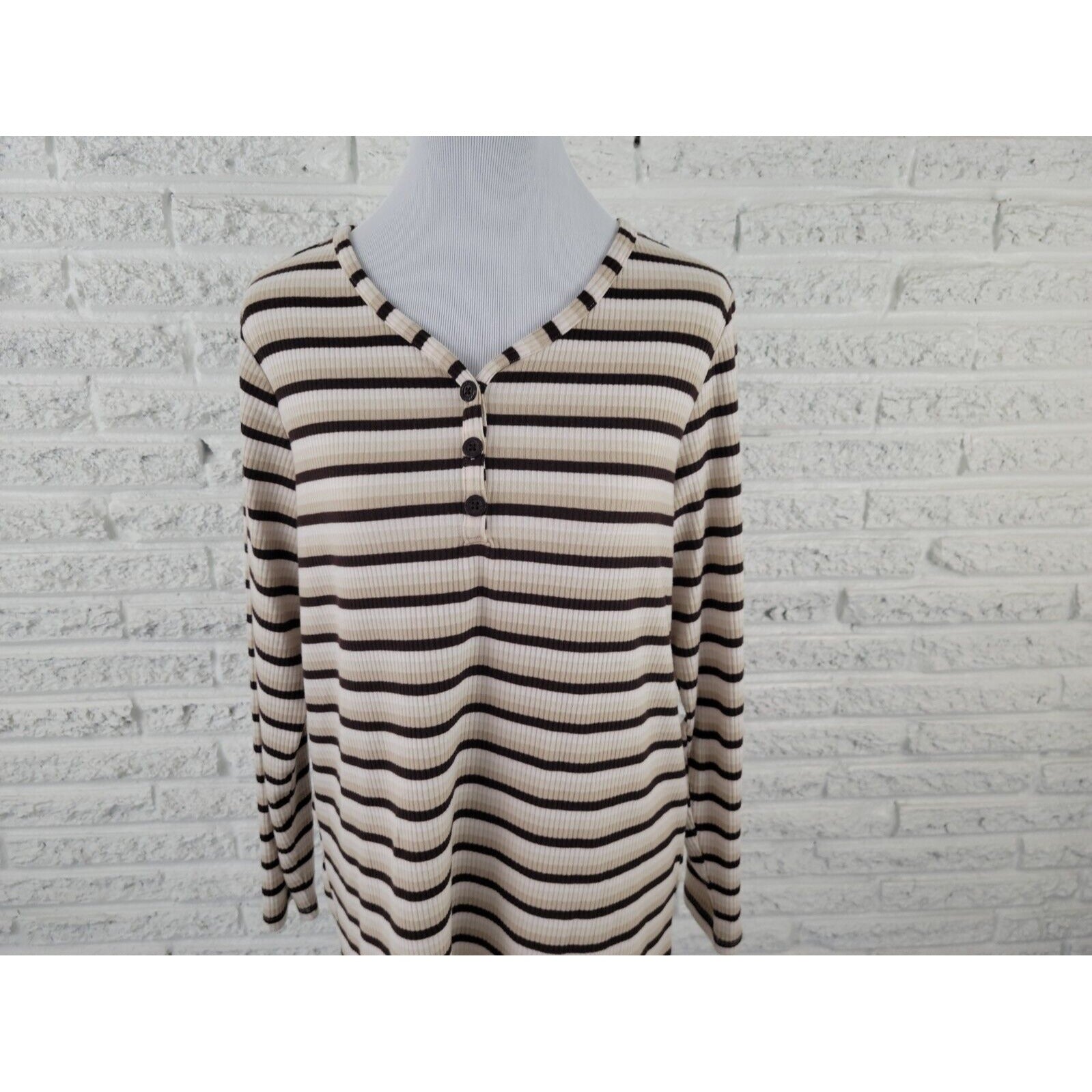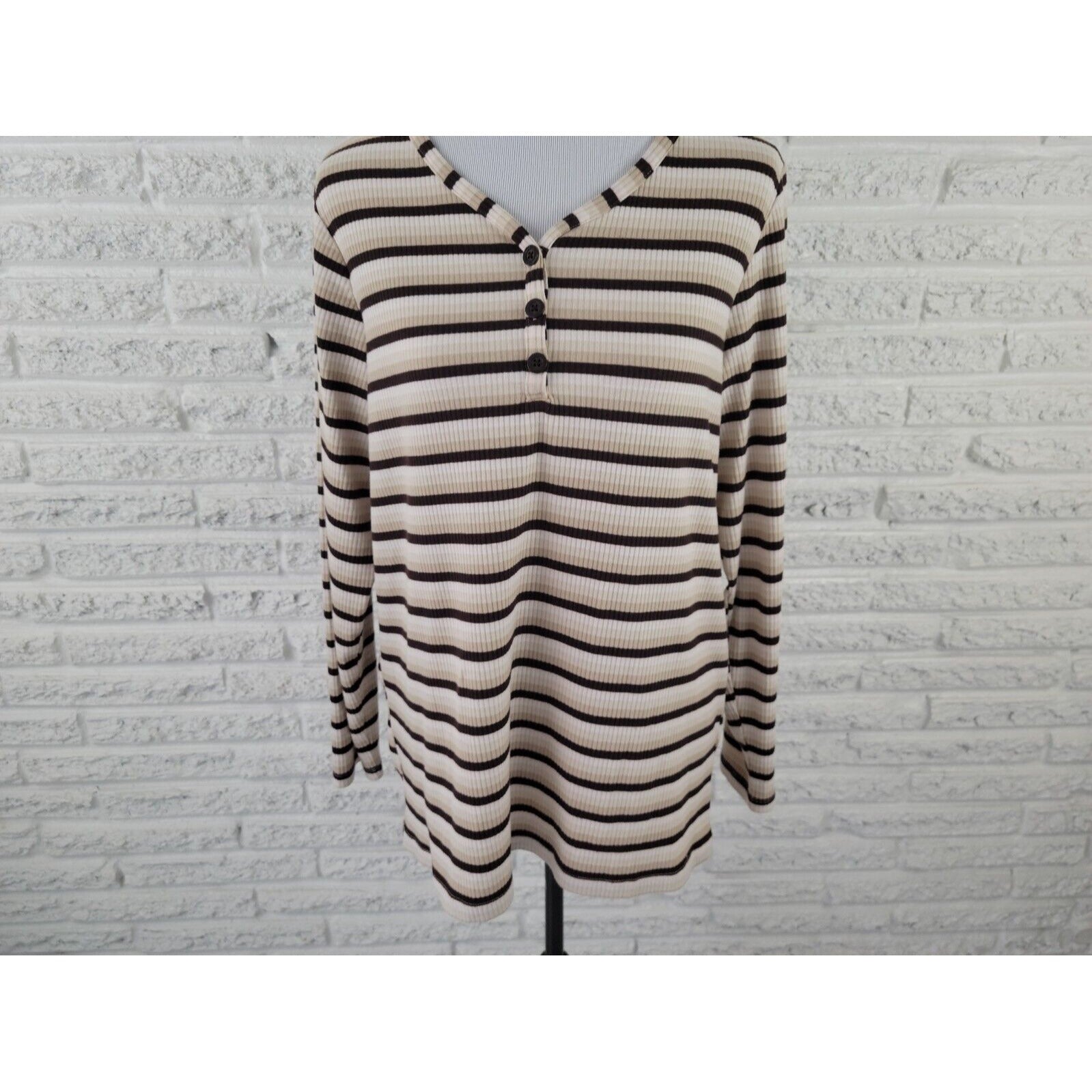 CJ Banks Women Top X Extra Large XL Knit 1/4 Button Brown Stripe Comfy Casual