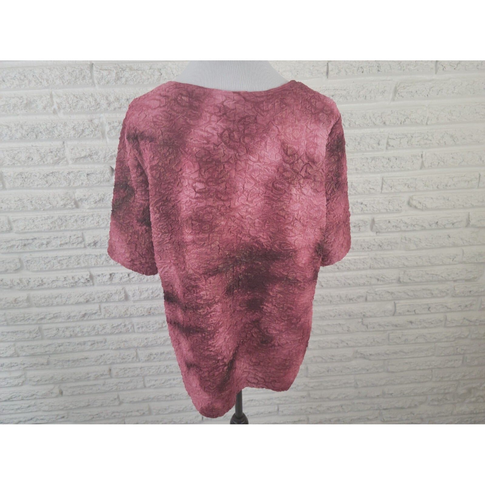 This Christopher & Banks women's blouse is perfect for both casual and business occasions. The burgundy tie-dye pattern adds a touch of style to the polyester blend material, which is machine washable for easy care. The short sleeves and boat neckline make it a versatile piece for any season. The blouse is available in size 1X, which fits regular plus-size women. It features a pullover closure and stretch for added comfort. This top is a great addition to any wardrobe, suitable for office wear or a casual day out.