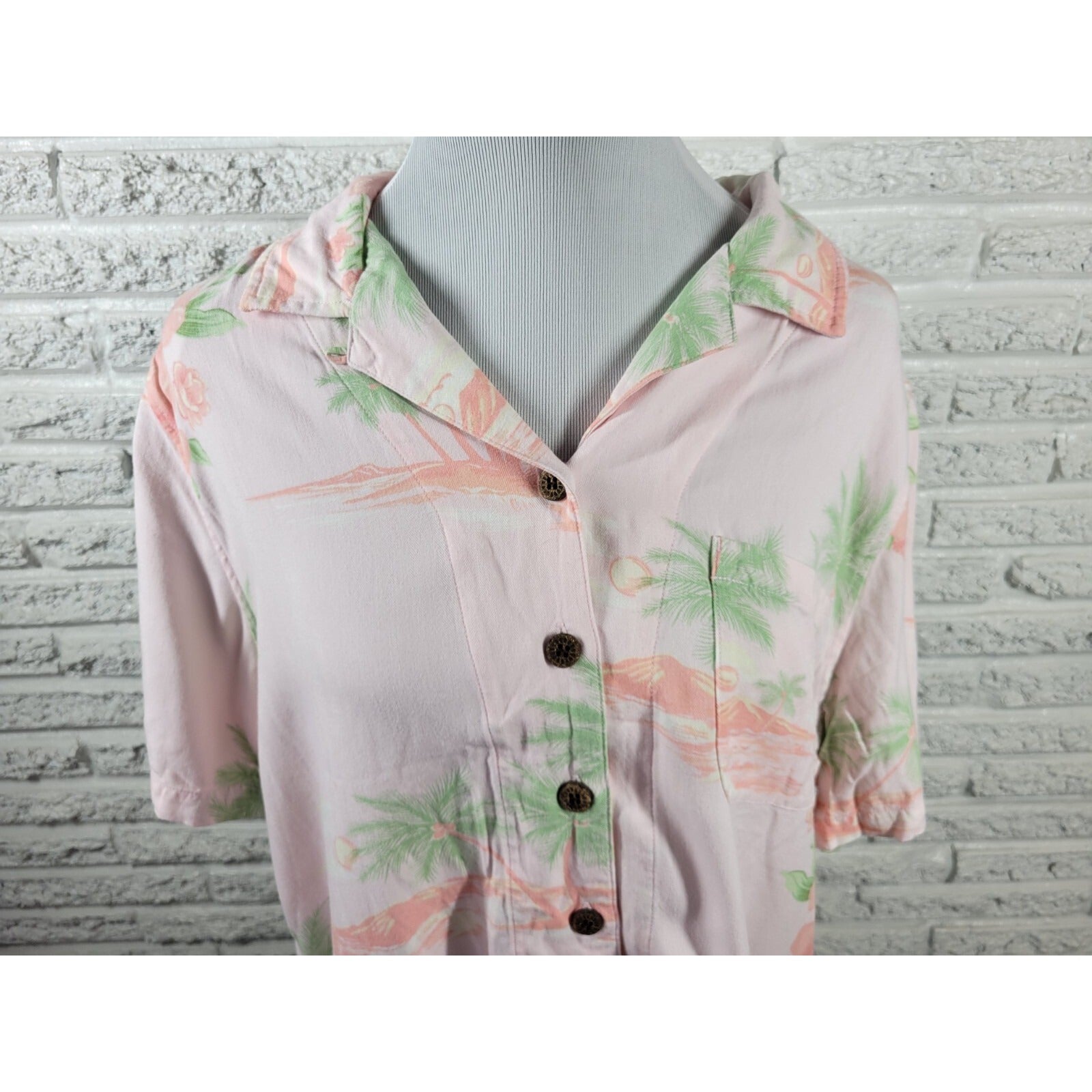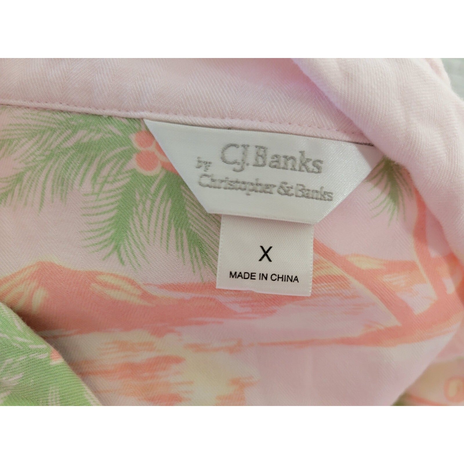 CJ Banks Womens Top X Short Sleeve Pink Tropical Rayon Collar Casual Button Up