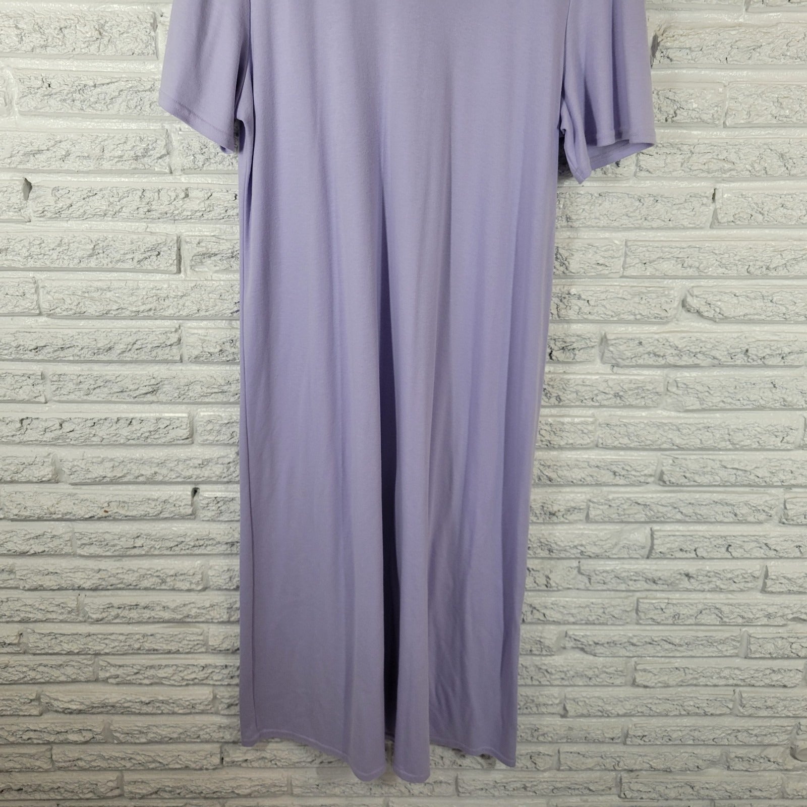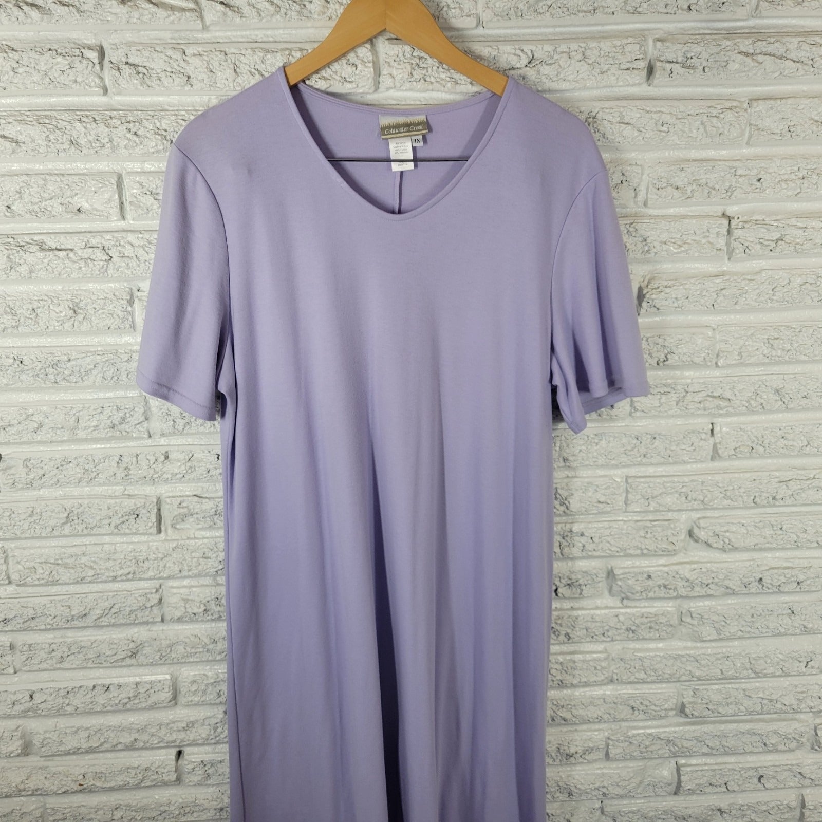The Coldwater Creek Women's Dress in size 1X Plus features a solid lavender color, short sleeves, and a round neckline. Made from a comfortable cotton blend material, this midi-length dress is perfect for travel or casual occasions. The pullover closure and stretch feature make it easy to wear for all-day comfort. This T-shirt dress style from Coldwater Creek is designed to be machine washable and is ideal for wearing in all seasons. Made in the United States, this plus-size dress is a versatile addition to any woman's wardrobe.