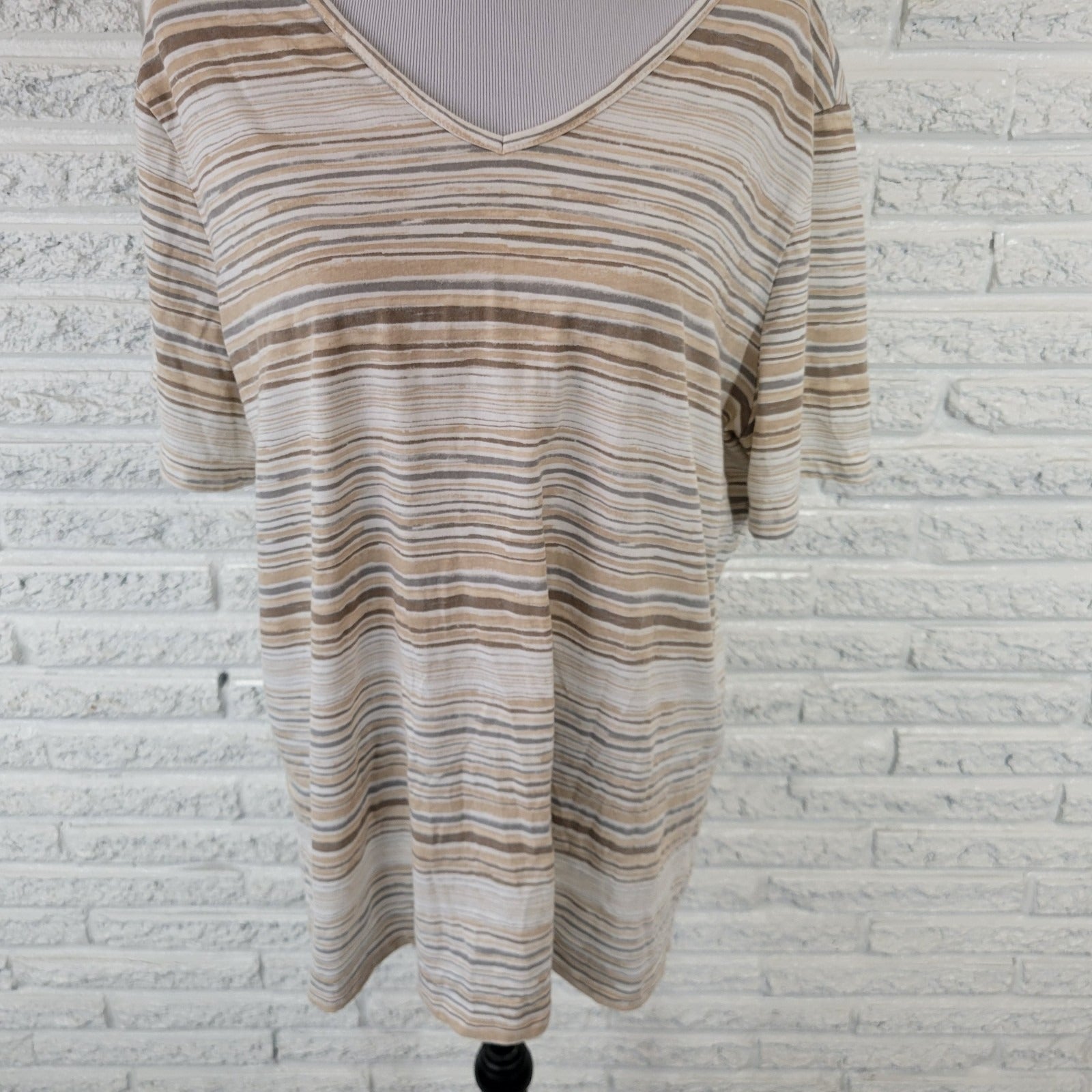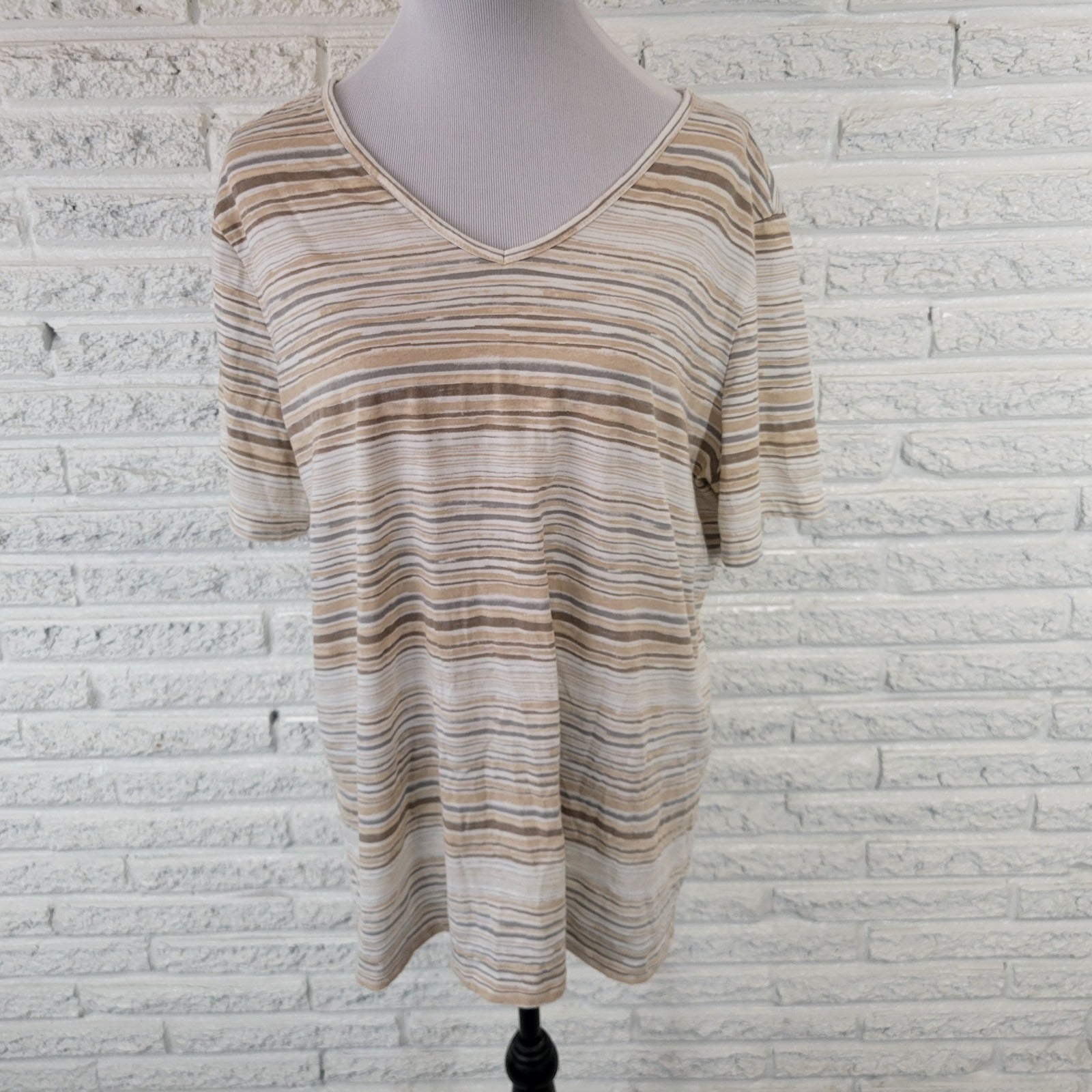 The Coral Bay Women's Top in 1X Plus size is a beige/ tan striped tee made from a comfortable cotton blend fabric. This short sleeve, v-neck shirt features a pullover closure and is machine washable for easy care. Ideal for casual or travel occasions, this basic tee offers a regular fit and stretch, making it suitable for all seasons. Perfect for layering in winter or wearing on its own in the summer, this versatile top from Coral Bay is a stylish and practical addition to any wardrobe.