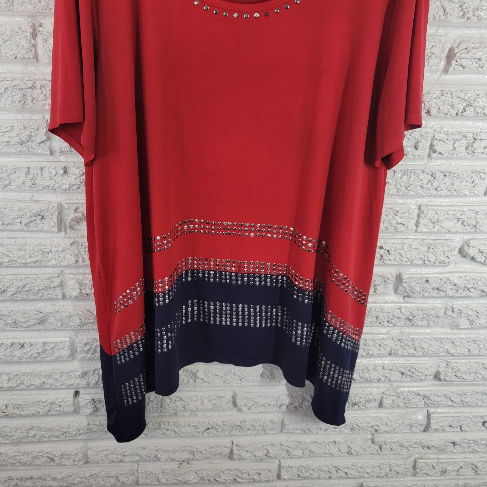 The Coral Bay Women's Top in size 2X Plus is a comfortable and stylish red/blue t-shirt with short sleeves and a round neckline. Made from a stretchy polyester blend jersey fabric, this pullover tee is perfect for casual or travel occasions during all seasons. The studded accents add a trendy touch, while the regular fit ensures a comfortable and flattering silhouette. Easy to care for with machine washable instructions, this versatile top is a basic yet chic addition to any woman's wardrobe.