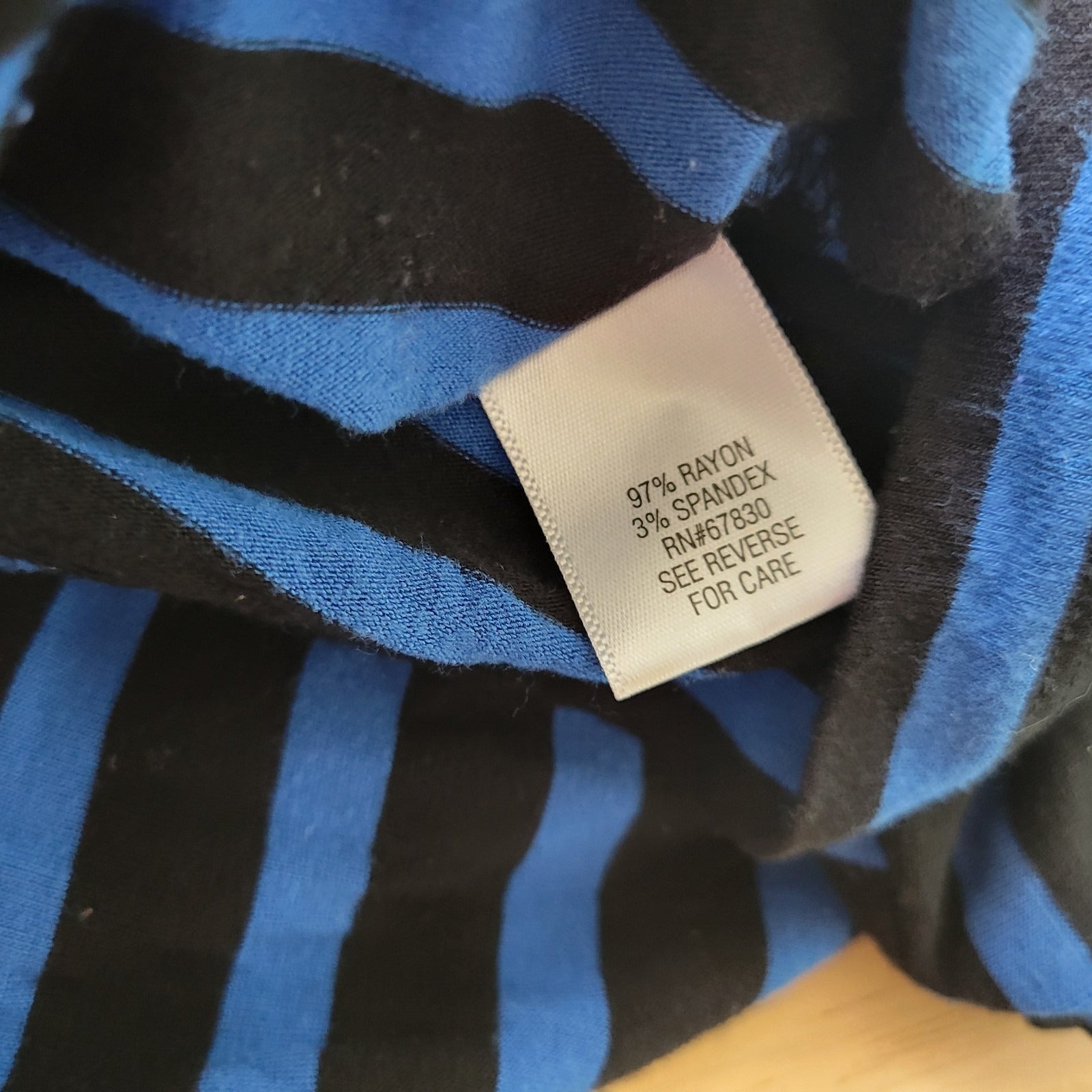The Croft Barrow Women's Top in size 1X Plus is a comfortable and casual blouse perfect for everyday wear. Made from a rayon blend with a touch of spandex for stretch, this blue/black striped top features a boat neckline and 3/4 sleeves. The pullover closure and regular fit make it easy to wear for various occasions such as travel or casual outings. Machine washable and suitable for all seasons, this basic style top from Croft & Barrow is a versatile addition to any woman's wardrobe.
