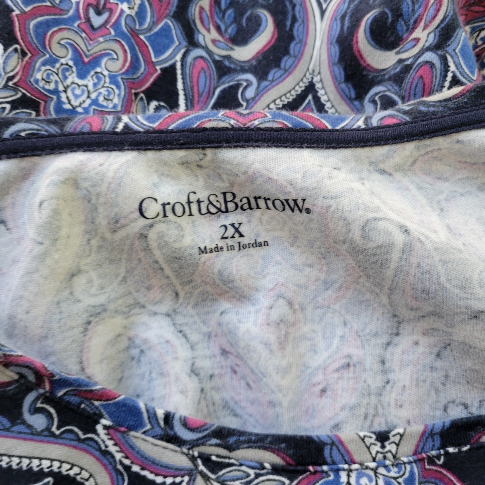 The Croft & Barrow Women's Top in size 2X is a comfortable and casual long sleeve tee made from 100% cotton jersey fabric. The geometric purple/blue pattern and round neckline with a pullover closure make it perfect for travel and everyday wear. The regular fit and stretch features ensure a comfortable and stylish look for any season. Easy to care for with machine washable instructions, this basic tee is a versatile addition to any woman's wardrobe.