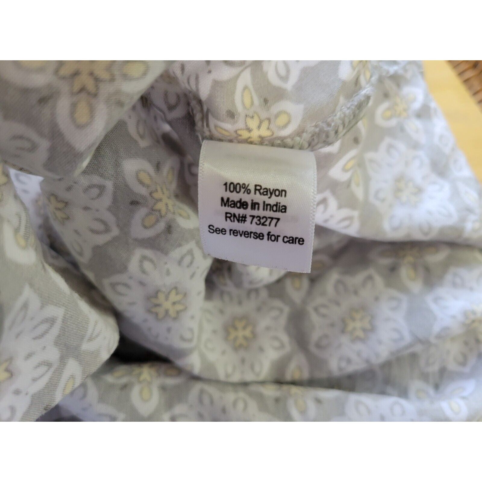 This Croft & Barrow button-up top is a must-have for any woman's wardrobe. The gray floral pattern on this top is perfect for any casual occasion. The 3/4 classic/fitted sleeves and V-neckline add a touch of elegance to this lightweight, all-season top. Made of rayon and woven fabric, this top is easy to care for and machine washable. The quarter button closure and XL size make it easy to wear and comfortable for all-day wear. This top is perfect for winter, summer, fall, and spring. Made in India, this top is a great addition to any woman's wardrobe.