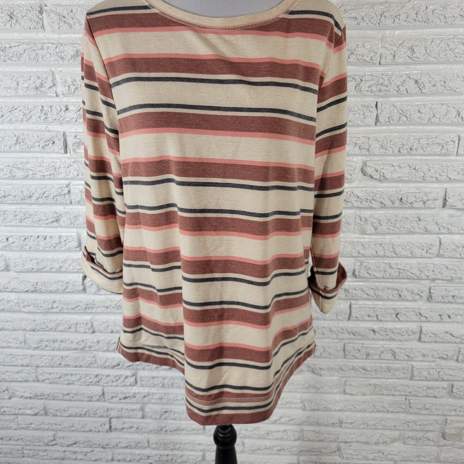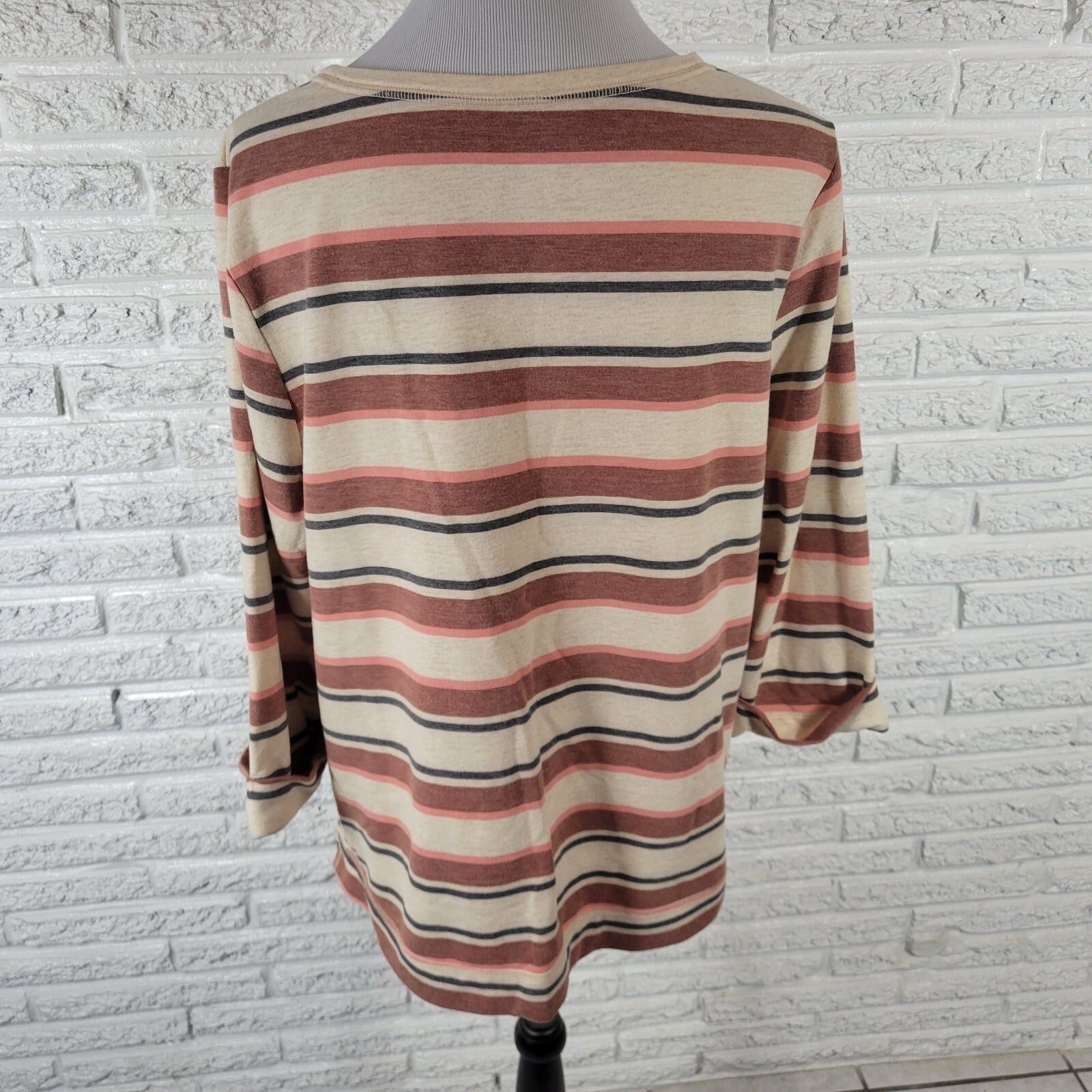 Croft Barrow Womens Top Extra Large Tee 3/4 Cuff Sleeve Comfy Brown Pink Stripe