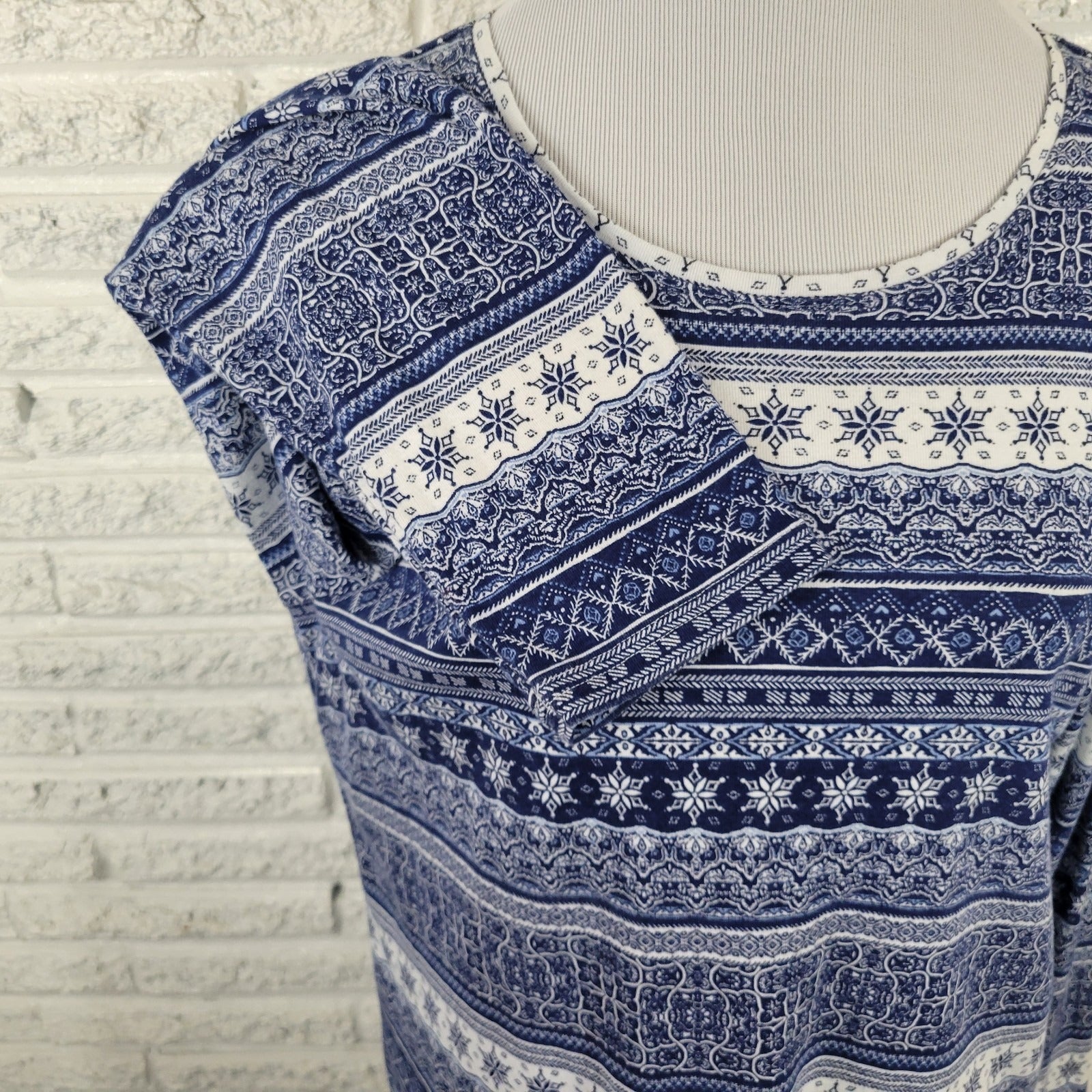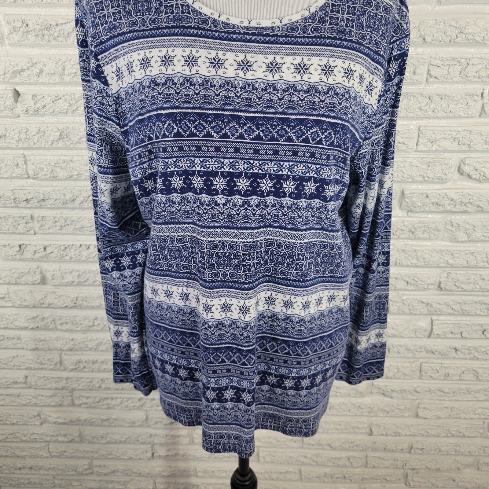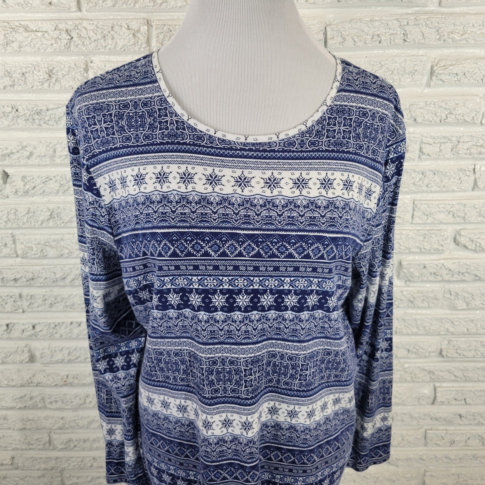 Croft Barrow Womens Top XXL Tee Classic Long Sleeve Blue Geometric Cotton Comfy