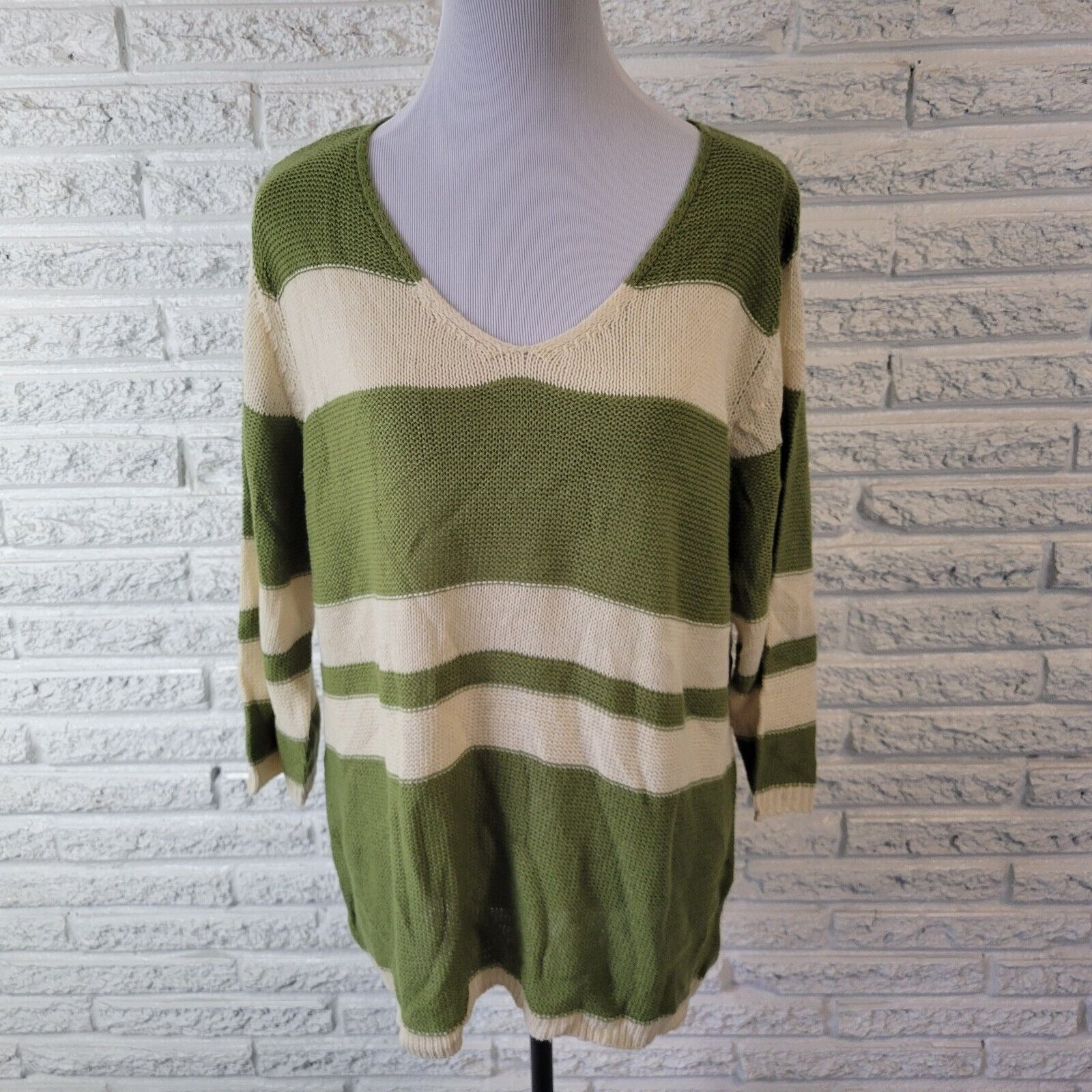 CW Classics Womens Sweater 1X 3/4 Sleeve Green Stripe Soft Lightweight Casual