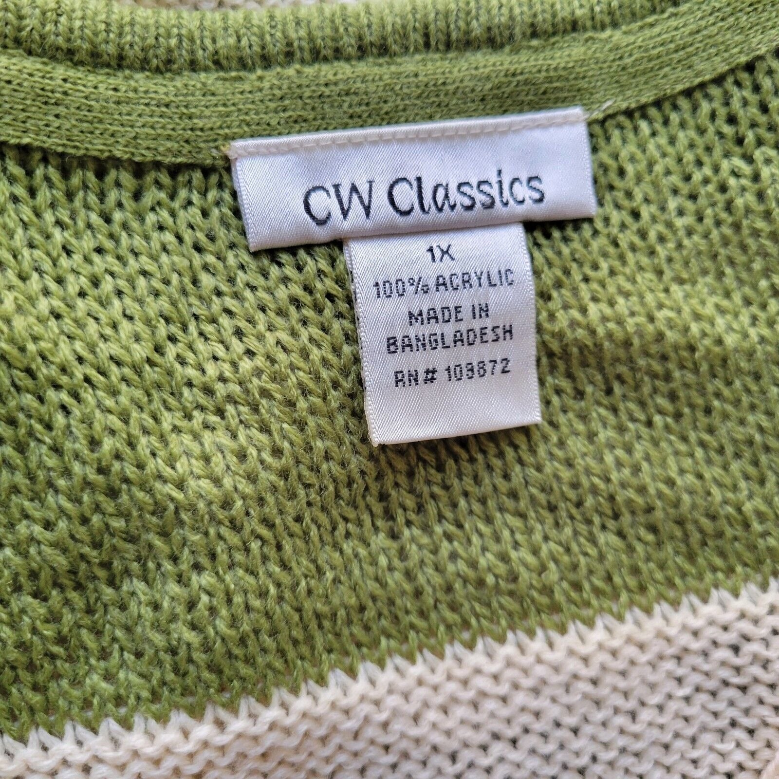 The CW Classics Women's Sweater in size 1X features a green/white stripe design with a V-neckline and 3/4 sleeves, making it a casual yet stylish addition to your wardrobe. Made from a soft and lightweight knit fabric, this sweater is perfect for travel or everyday wear. With a regular fit and stretchy material, it offers comfort and flexibility for all seasons. Easy to care for with machine washable instructions, this versatile sweater by CW Classics is a must-have for any woman looking for a timeless and classic piece to add to her closet.