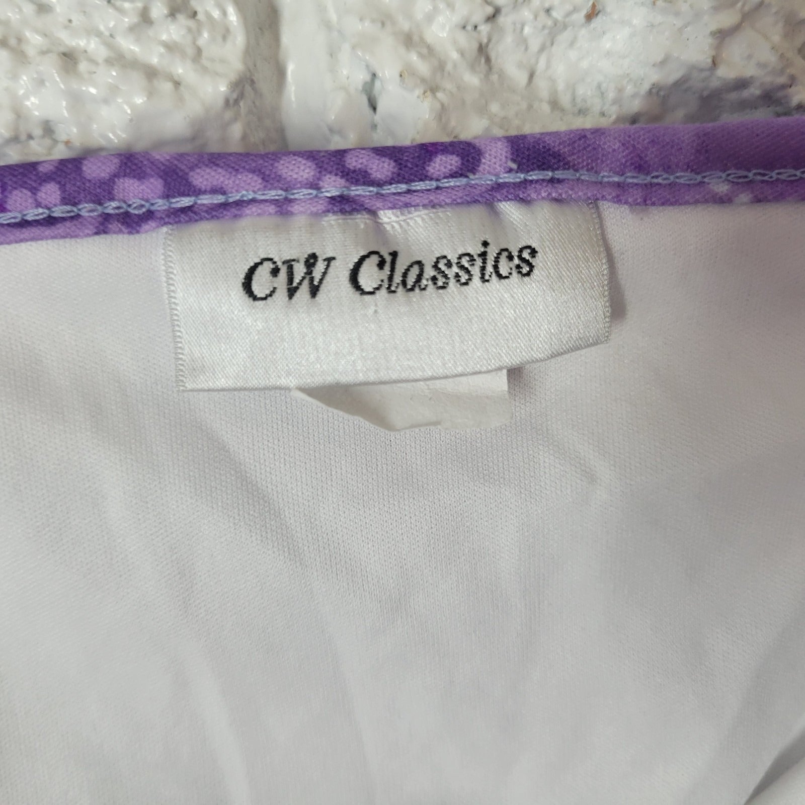 The CW Classics Women's Top in size 2X Plus features a stylish purple floral pattern, wide straps, and a square neckline. Made of lightweight polyester material, this casual top is perfect for travel and everyday wear. With a pullover closure and regular fit, this sleeveless top offers comfort and stretch for all seasons. Machine washable and in a basic style, the CW Classics top is a versatile addition to any woman's wardrobe.