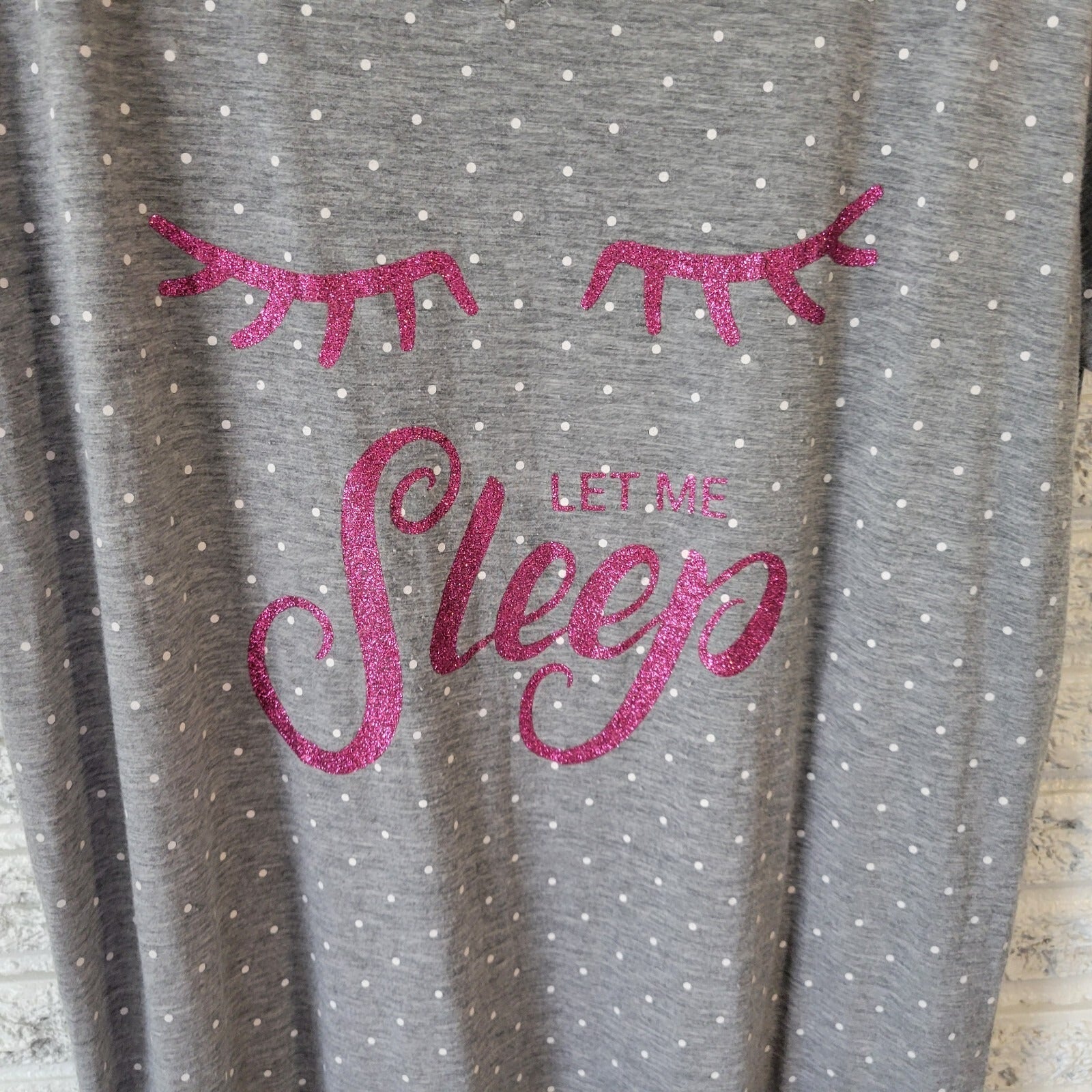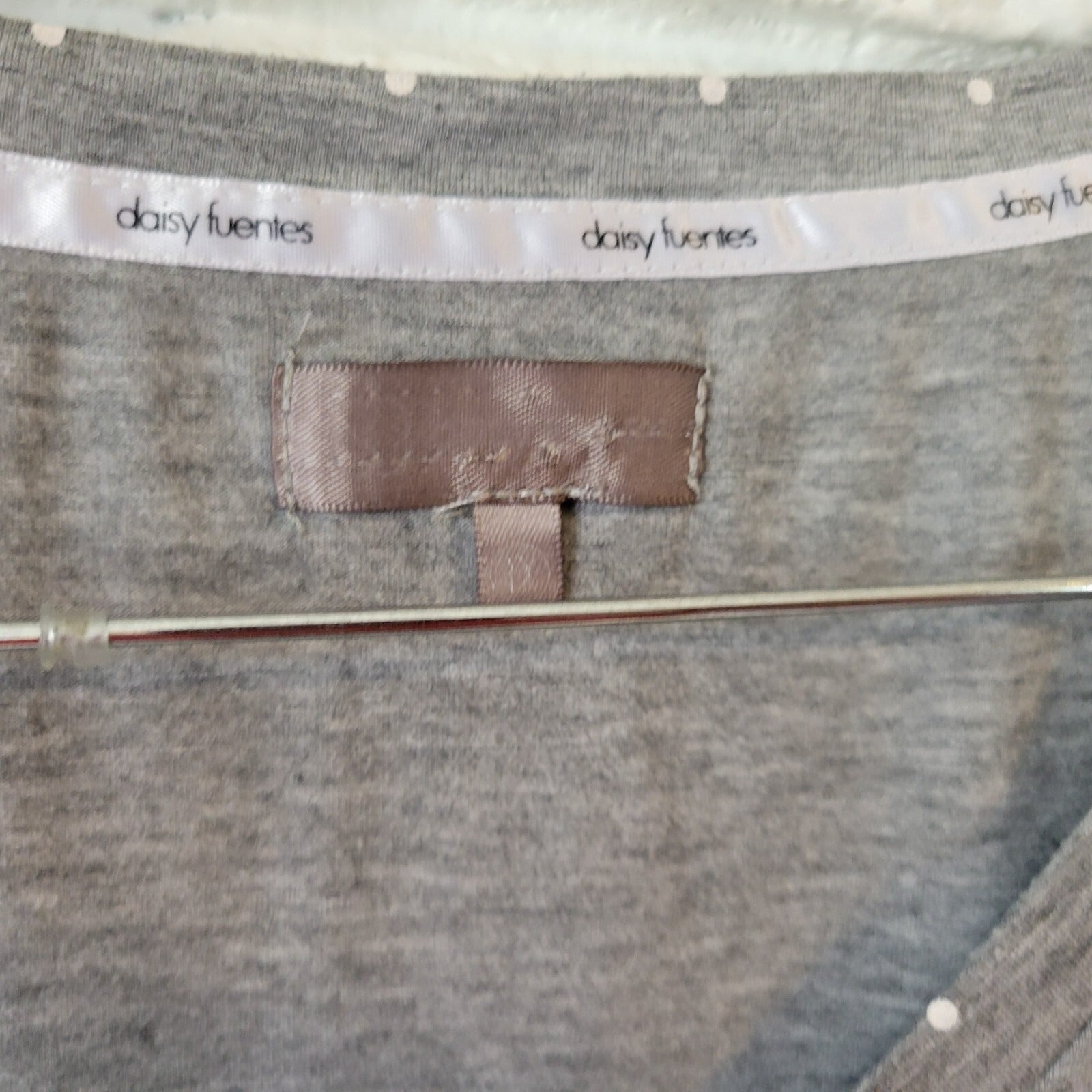 The Daisy Fuentes Women's Nightgown in size 1X is a stylish and comfortable sleep pajama top in a flattering gray color with glitter accents. Made from a lightweight blend of spandex and viscose, this garment is machine washable and perfect for all seasons. This plus-size top features short sleeves and is adorned with the brand's signature Daisy Fuentes design, offering a touch of elegance to your bedtime routine. Perfect for lounging or sleeping, this pajama top is a versatile addition to any woman's wardrobe.