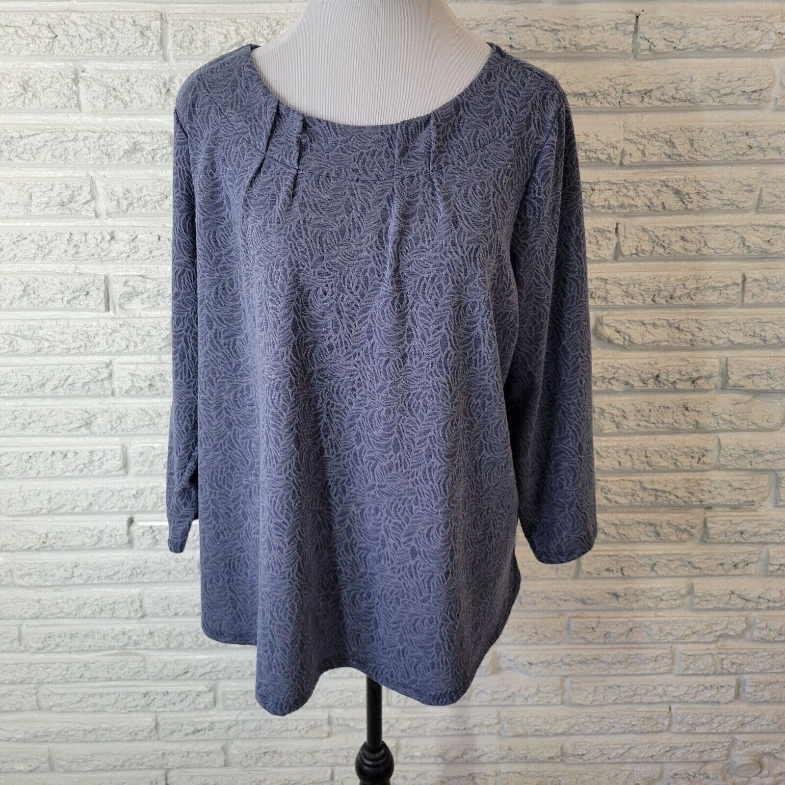 Dana Buchman Womens Top XXL Plus 3/4 Sleeve Blue Leaves Pleated Poly Blend Comfy