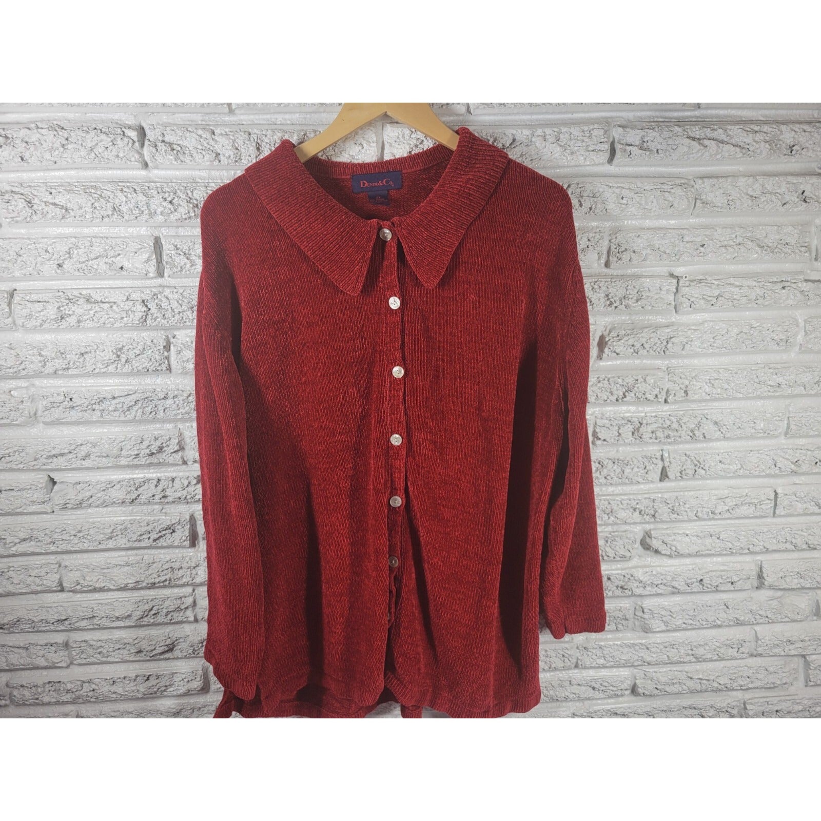 This Denim & Co. women's sweater is a perfect addition to your casual wardrobe. With a solid pattern and tight-knit fabric, this red sweater features a collared neckline, long sleeves, and button closure. It is made of soft acrylic material and can be worn in any season.   The sweater is available in size 2X and has a regular fit. It is suitable for plus-size women and can be hand-washed easily. This cardigan-style sweater is stretchy and comfortable, making it ideal for winter, summer, fall, and spring. It is a great choice for any casual occasion and is perfect for women who love to stay stylish and comfortable.