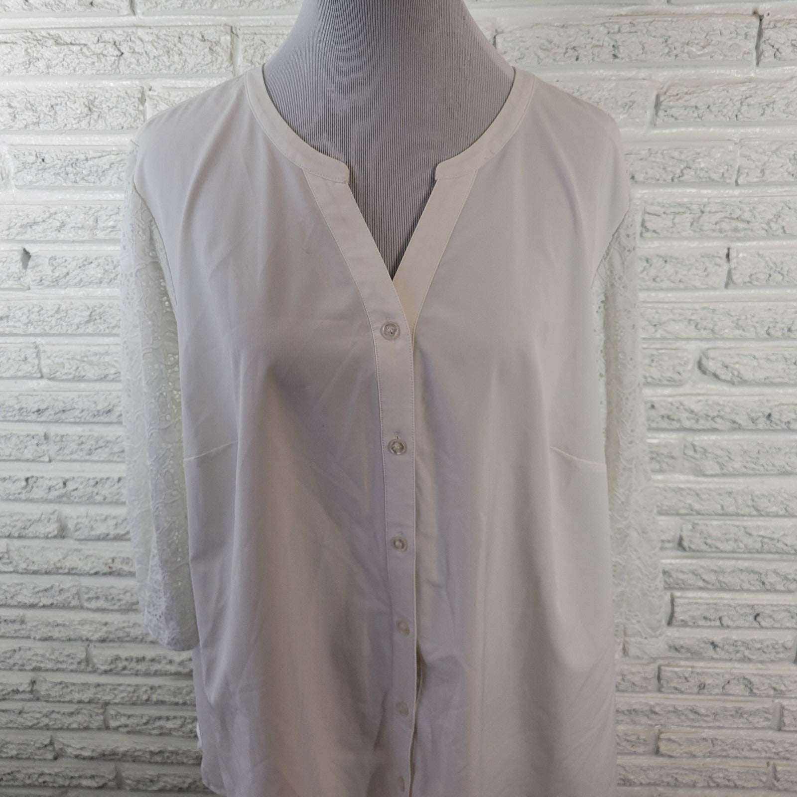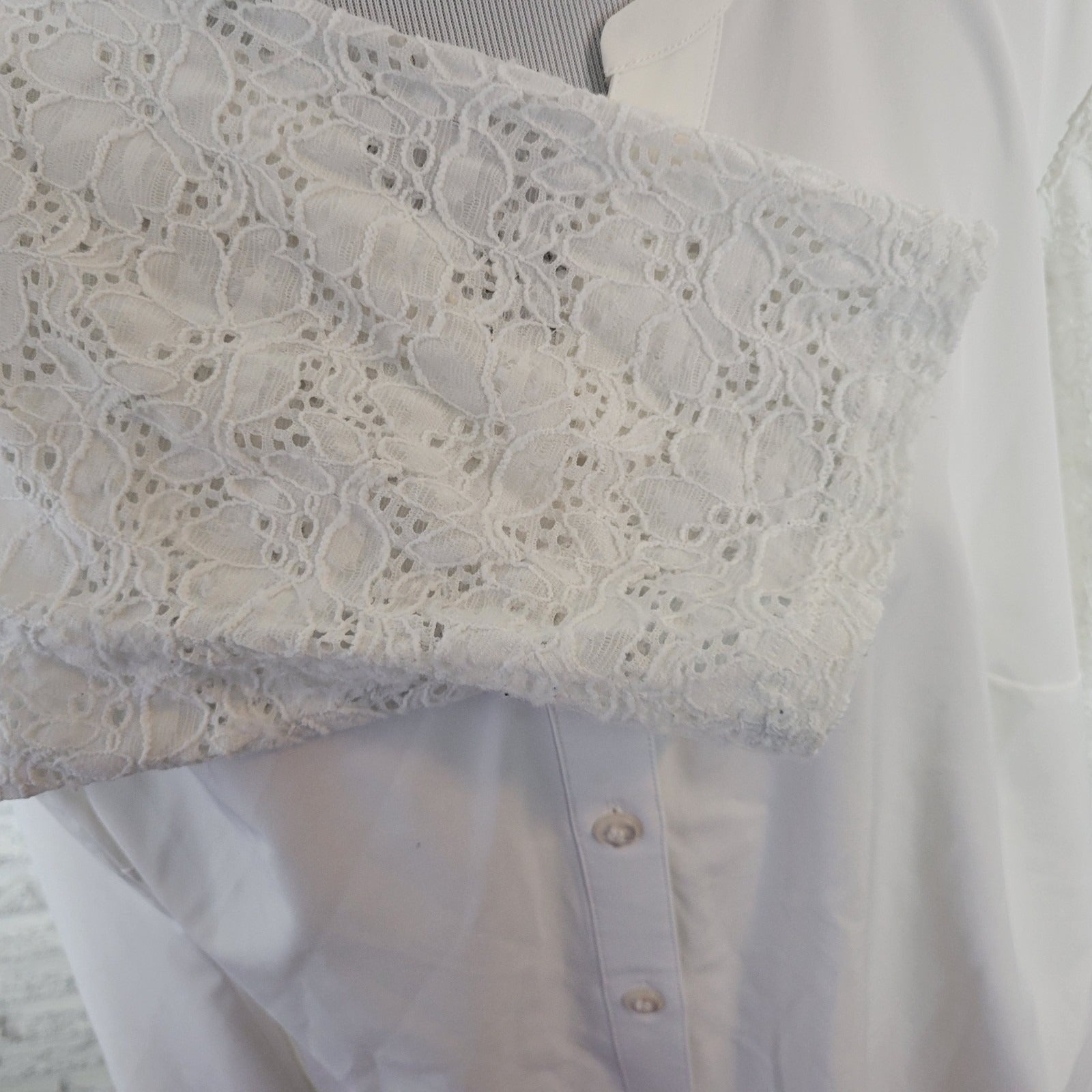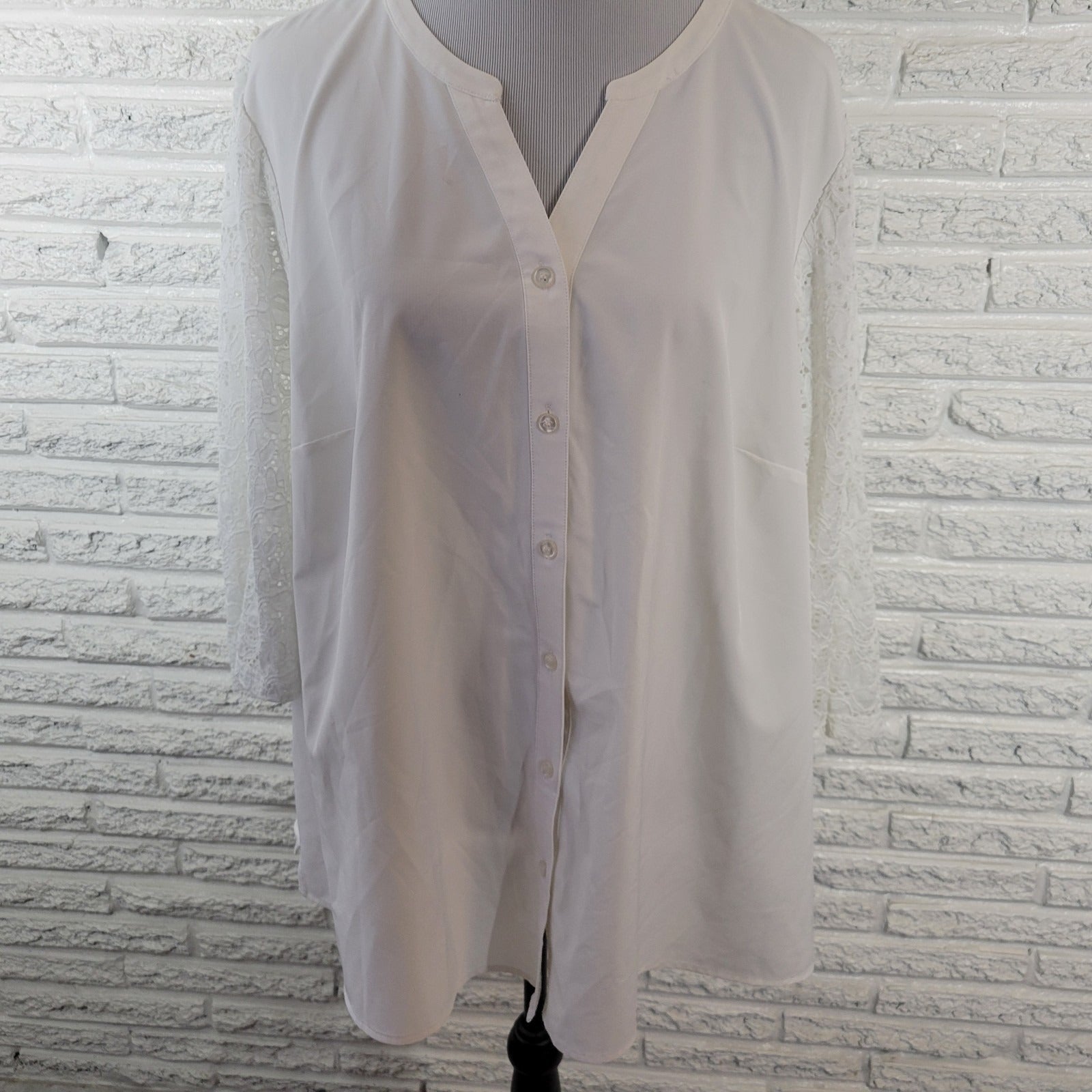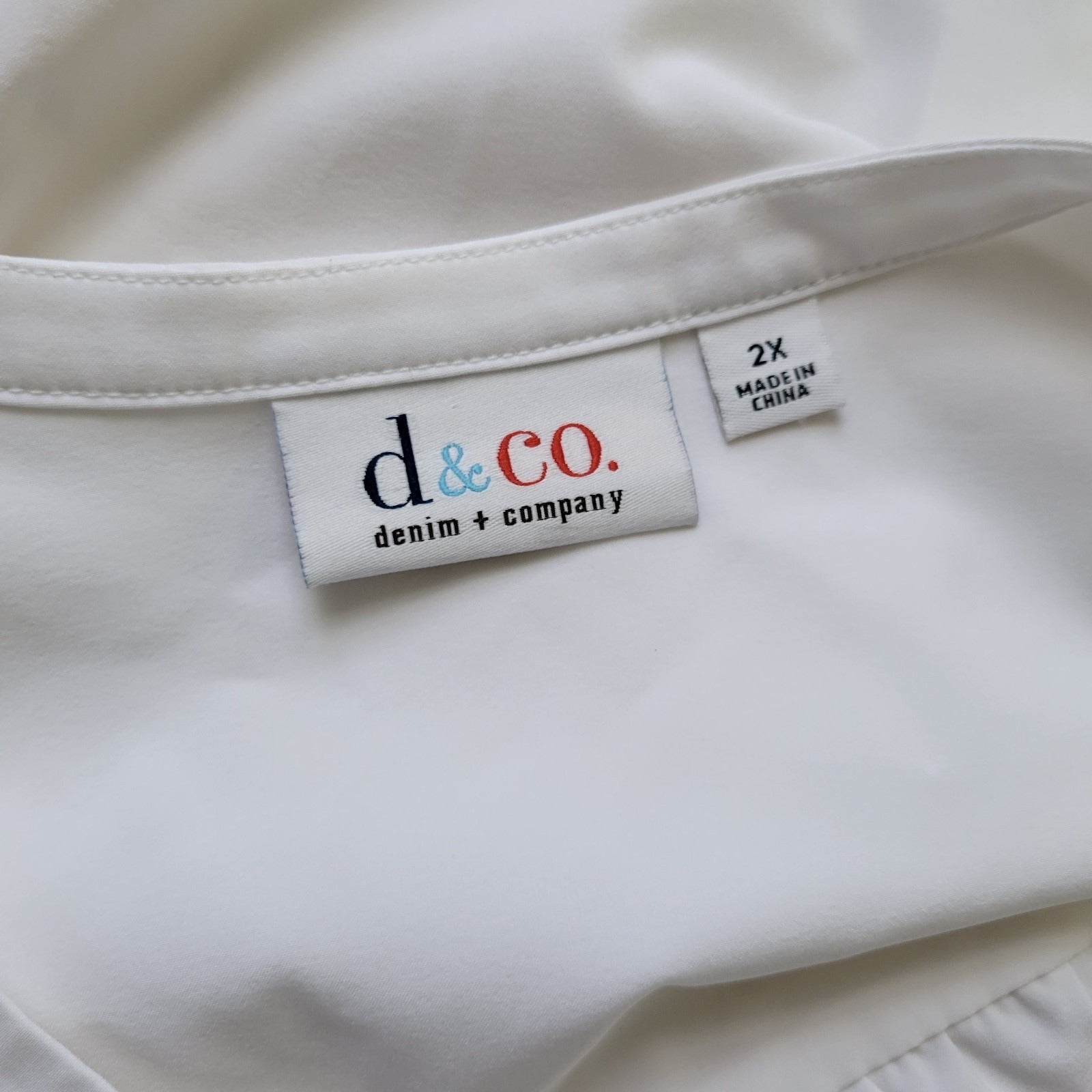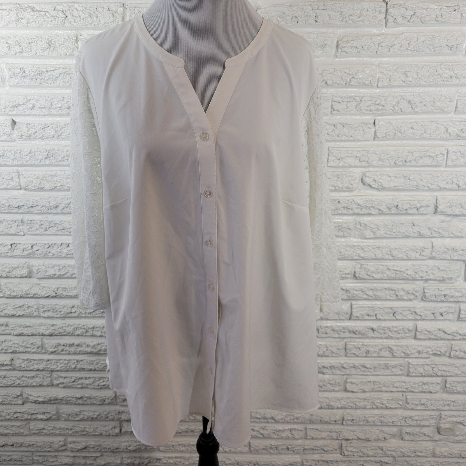 Denim Co Womens Top 2X Plus 3/4 Eyelet Embroidered Sleeve White Button Up Office