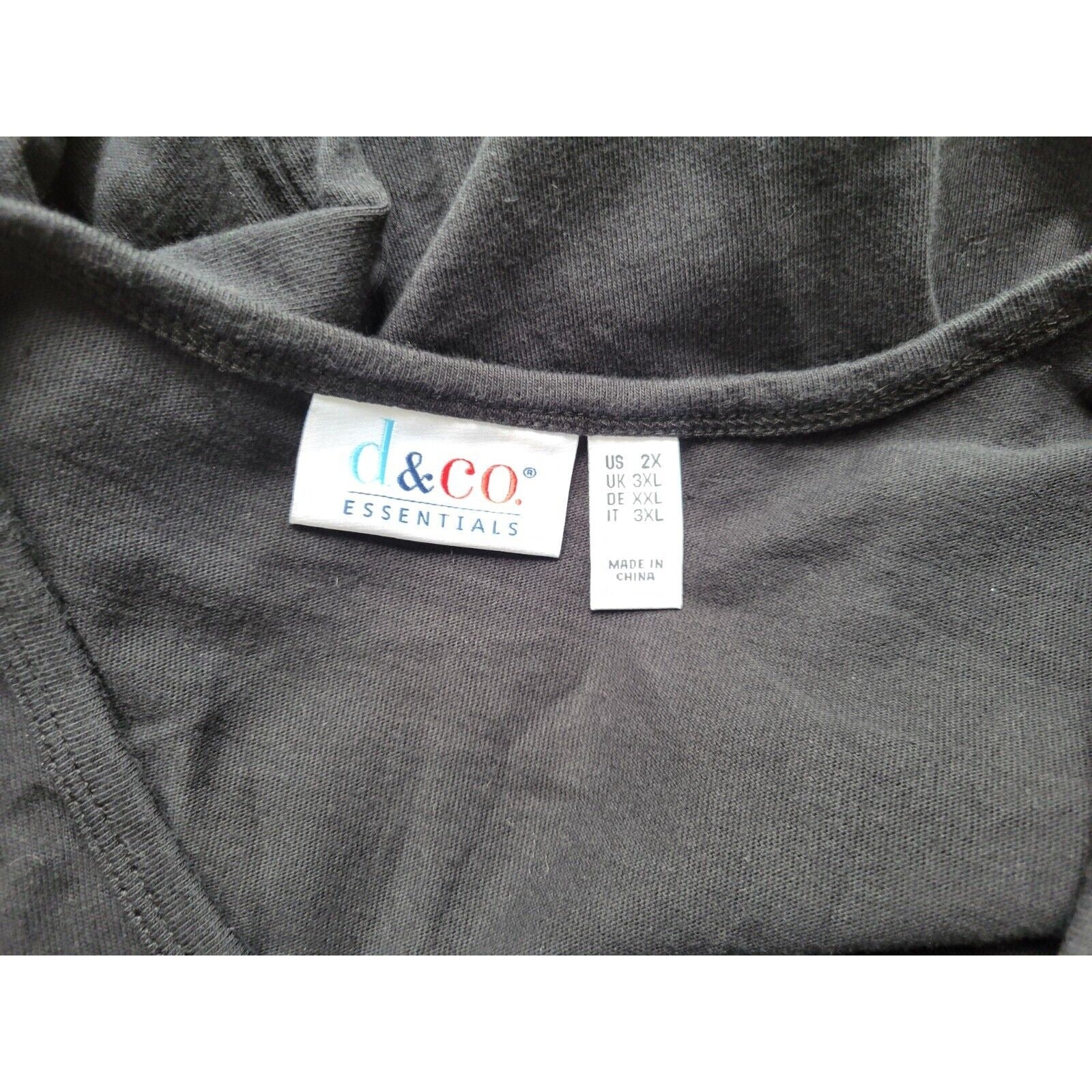 This Denim & Co. women's top is a versatile addition to your wardrobe. The black tee features a solid pattern, short sleeves, and a round neck with a casual sleeve type. It is made of 100% cotton jersey fabric and is machine washable for easy care. The pullover closure and stretchy material make it a comfortable choice for any casual occasion, while the slit detail adds a touch of style. This top is available in size 2X and is perfect for plus-size women. It can be worn in any season, including winter, summer, fall, and spring.