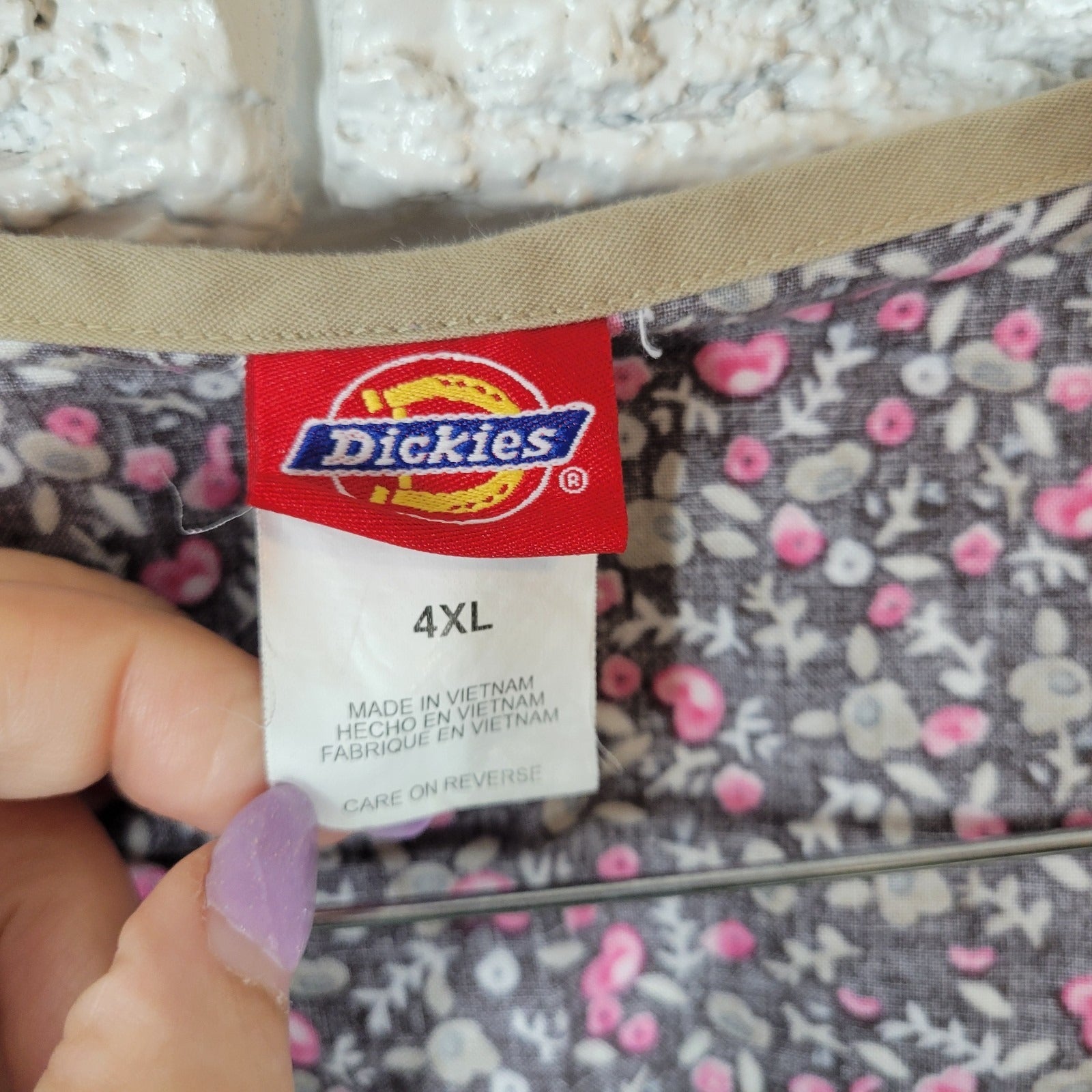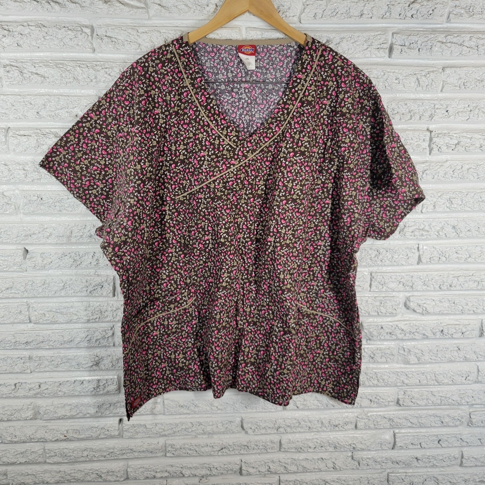 Dickies Unisex Scrub Top 4XL Plus Brown Floral Cotton Hearts Rosebuds Pockets