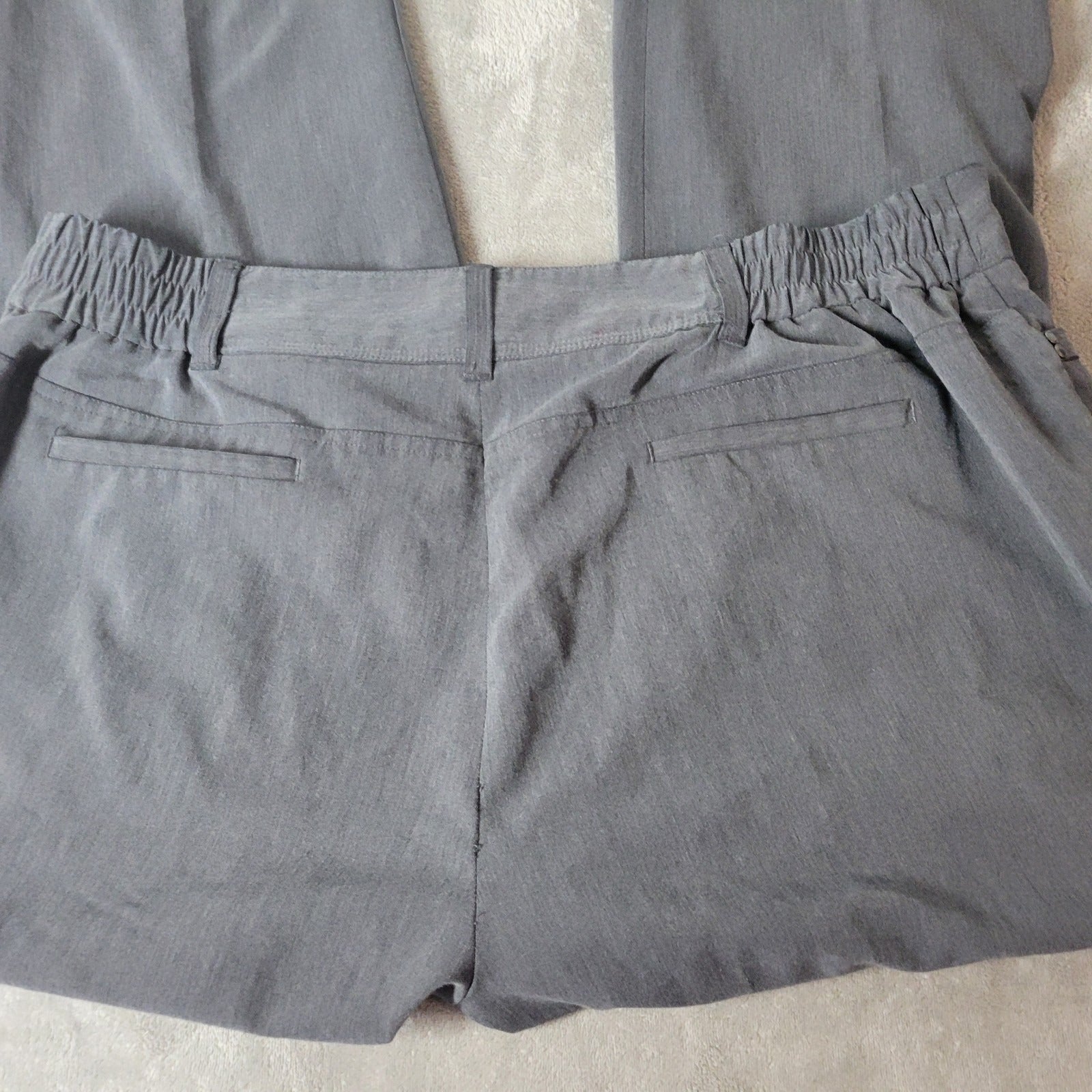 These Dressbarn women's plus size pants in gray feature a straight leg style with a zip fly closure. Made from a comfortable polyester blend material, they have an elastic waist for added comfort and stretch. With pockets for convenience, these pants are machine washable and suitable for both casual and business occasions. The sizing is 20 with a 40-inch waist size and a regular fit. Perfect for all seasons, these dress pants offer a versatile and stylish option for any wardrobe.