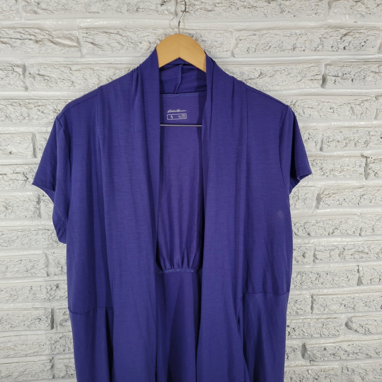 The Eddie Bauer Women's Top is a 2XL plus size cardigan with an open overlay design in a blue polyester blend. This lightweight and casual cardigan features short sleeves, a solid pattern, and a regular fit. It is machine washable and suitable for all seasons. The cardigan also includes pockets and is versatile for travel or everyday wear. With its basic style and comfortable features, this Eddie Bauer cardigan is perfect for women looking for a stylish and practical addition to their wardrobe.
