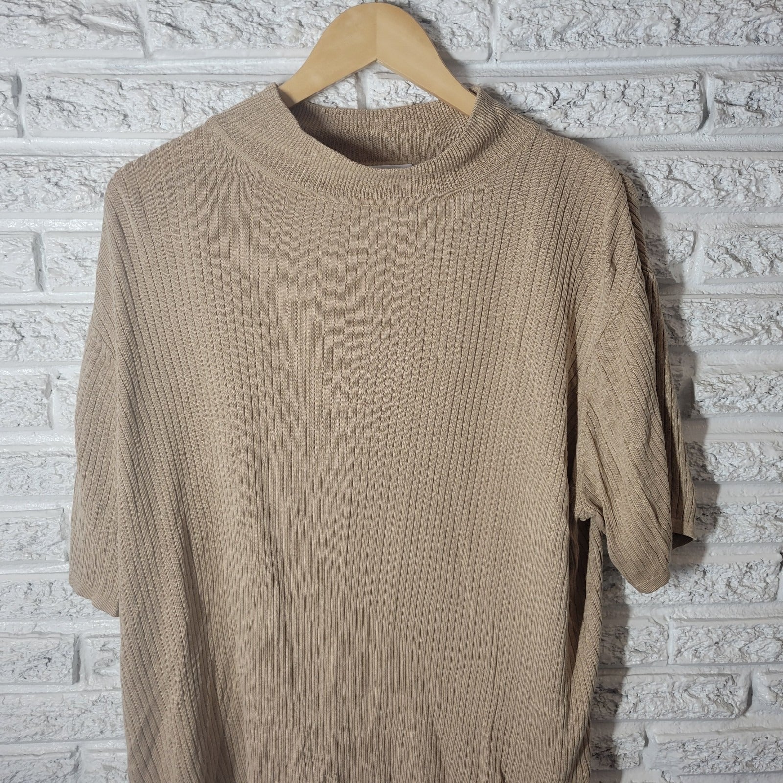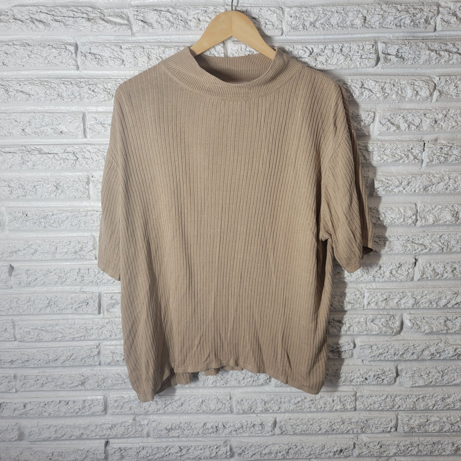 Elisabeth Women Sweater 3X Plus Short Sleeve Ribbed Beige Mock Turtleneck Office