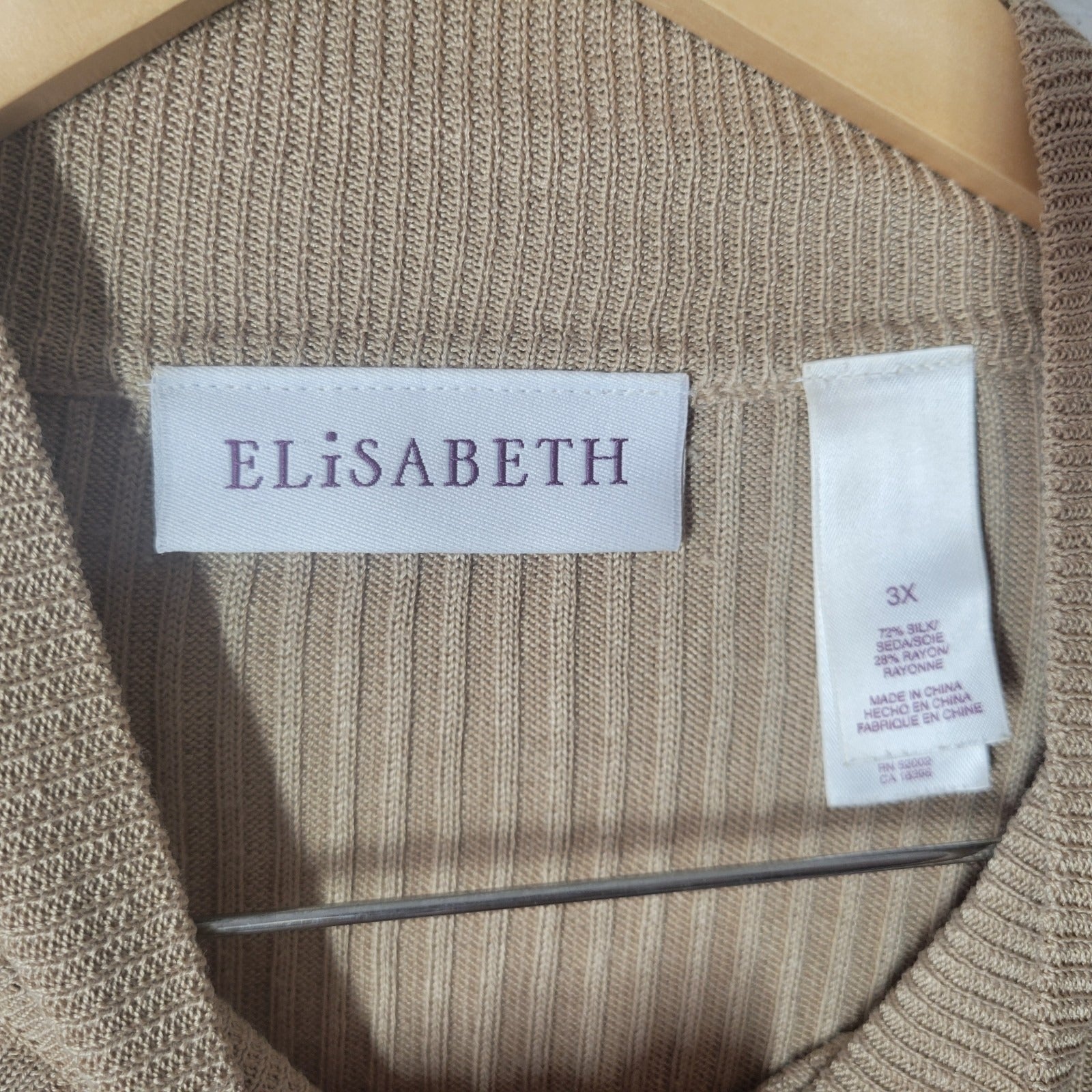 The Elisabeth Women Sweater in 3X Plus size features a solid pattern in beige color, with a mock turtleneck and ribbed detailing for a stylish look. This tight-knit sweater is made from a blend of silk and rayon, offering a comfortable and breathable fit for all seasons. With long sleeves and a pullover style, it is suitable for casual, business, and travel occasions, and should be hand washed only for garment care. Perfect for adding a touch of elegance to any outfit, this sweater from ELISABETH is designed for a regular fit and is a versatile piece for any woman's wardrobe.