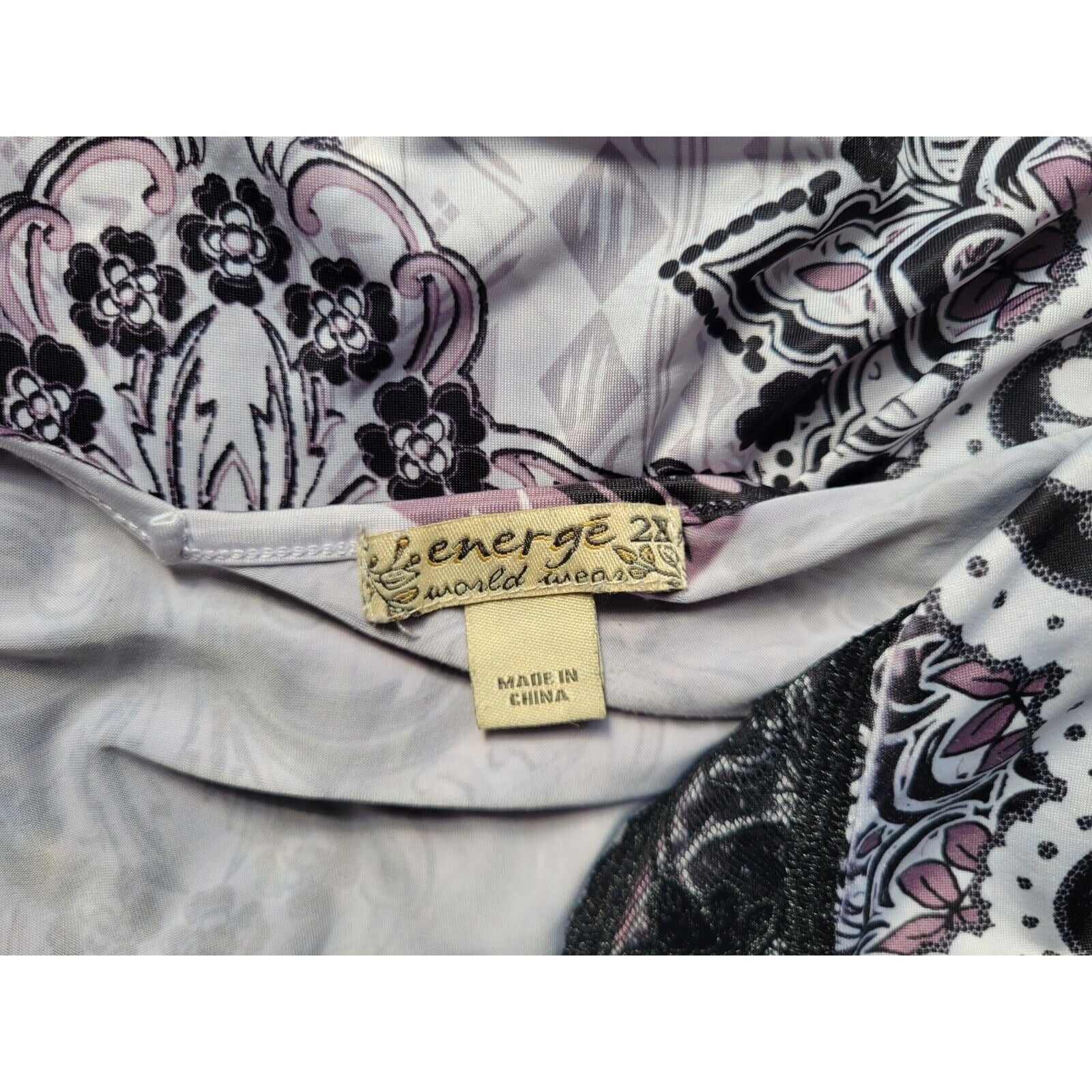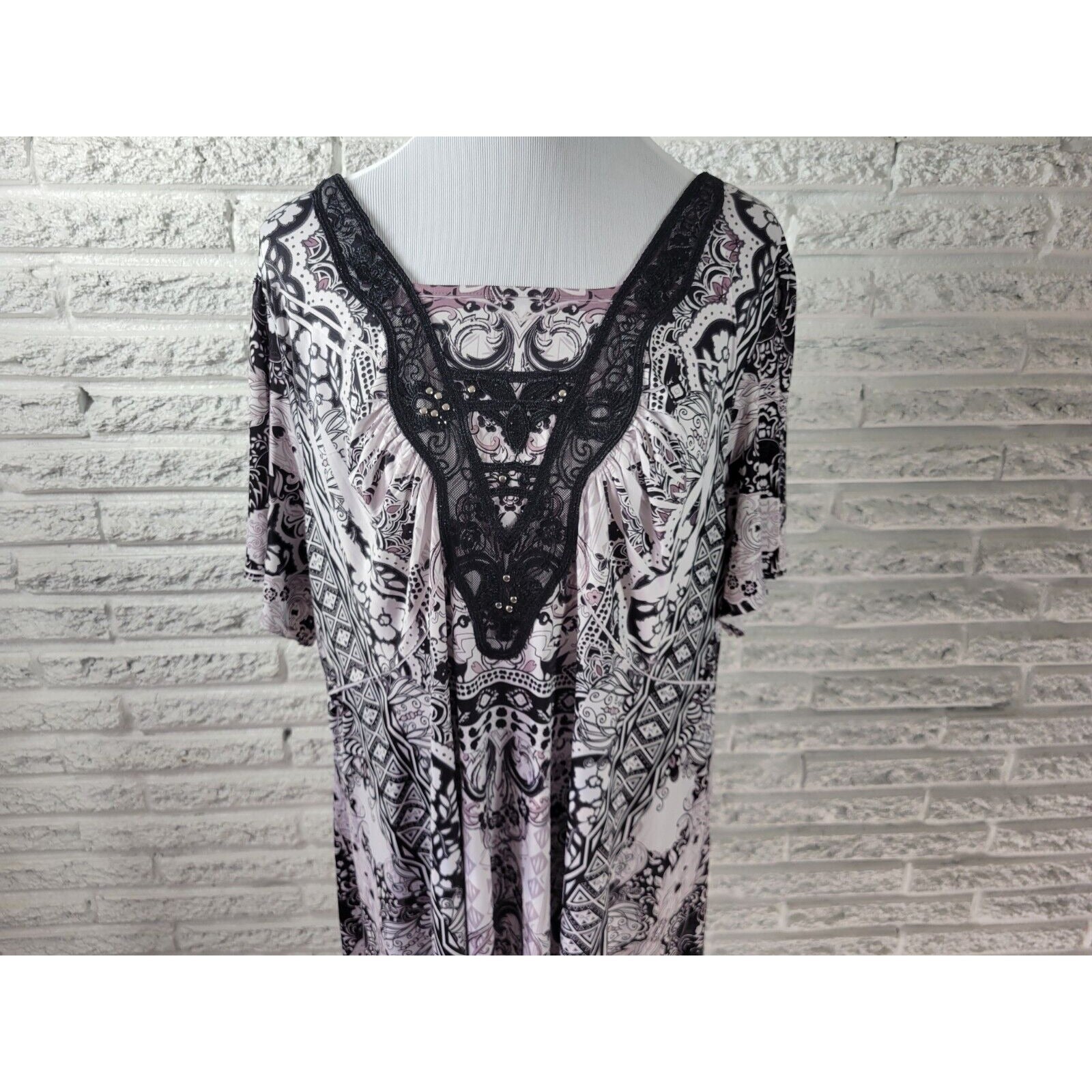 Energe Womens Top 2X Plus Tunic Short Sleeve Mandala Black Lace Trim Laser Cut