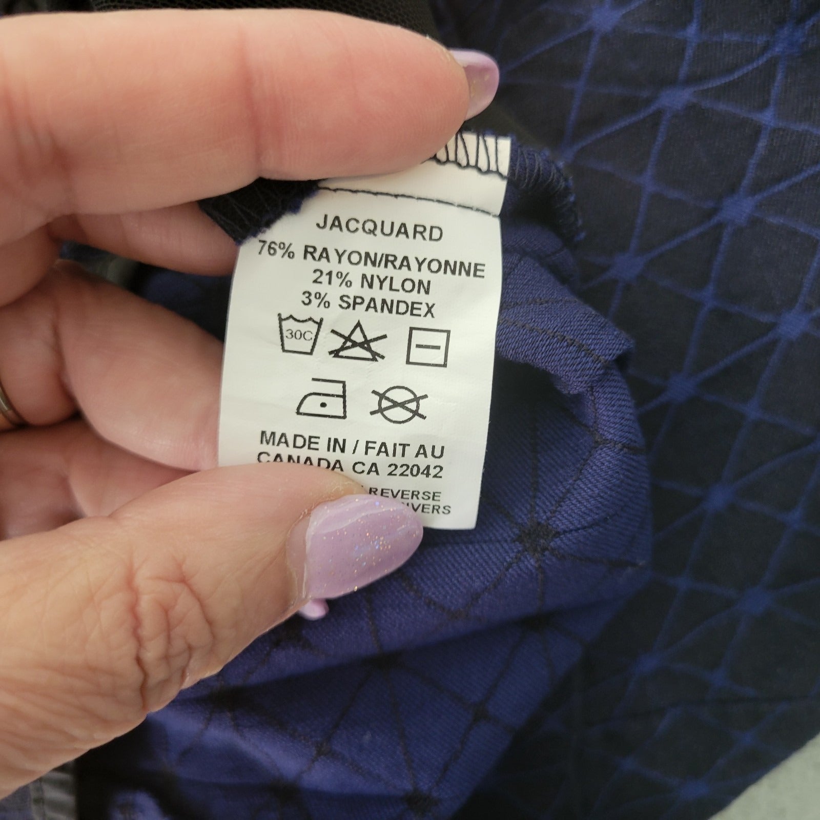 The Erica Taylor Women's Pants in size 2X Plus are a stylish and comfortable option for any office or casual setting. Featuring a trendy black and blue geometric pattern, these cropped pants have a pull-on closure and are made of a blend of nylon, spandex, and rayon for stretch and flexibility. With a regular fit and straight leg style, these pants are perfect for all seasons and can be easily machine washed for convenient care. Whether you're working in style or lounging comfortably, these pants from Erica Taylor offer both style and comfort for any occasion.