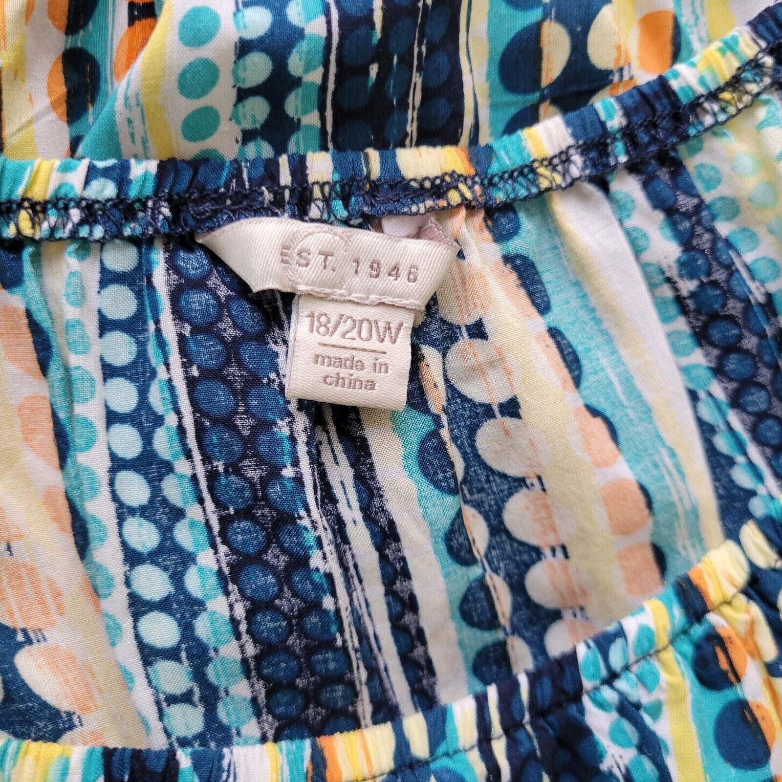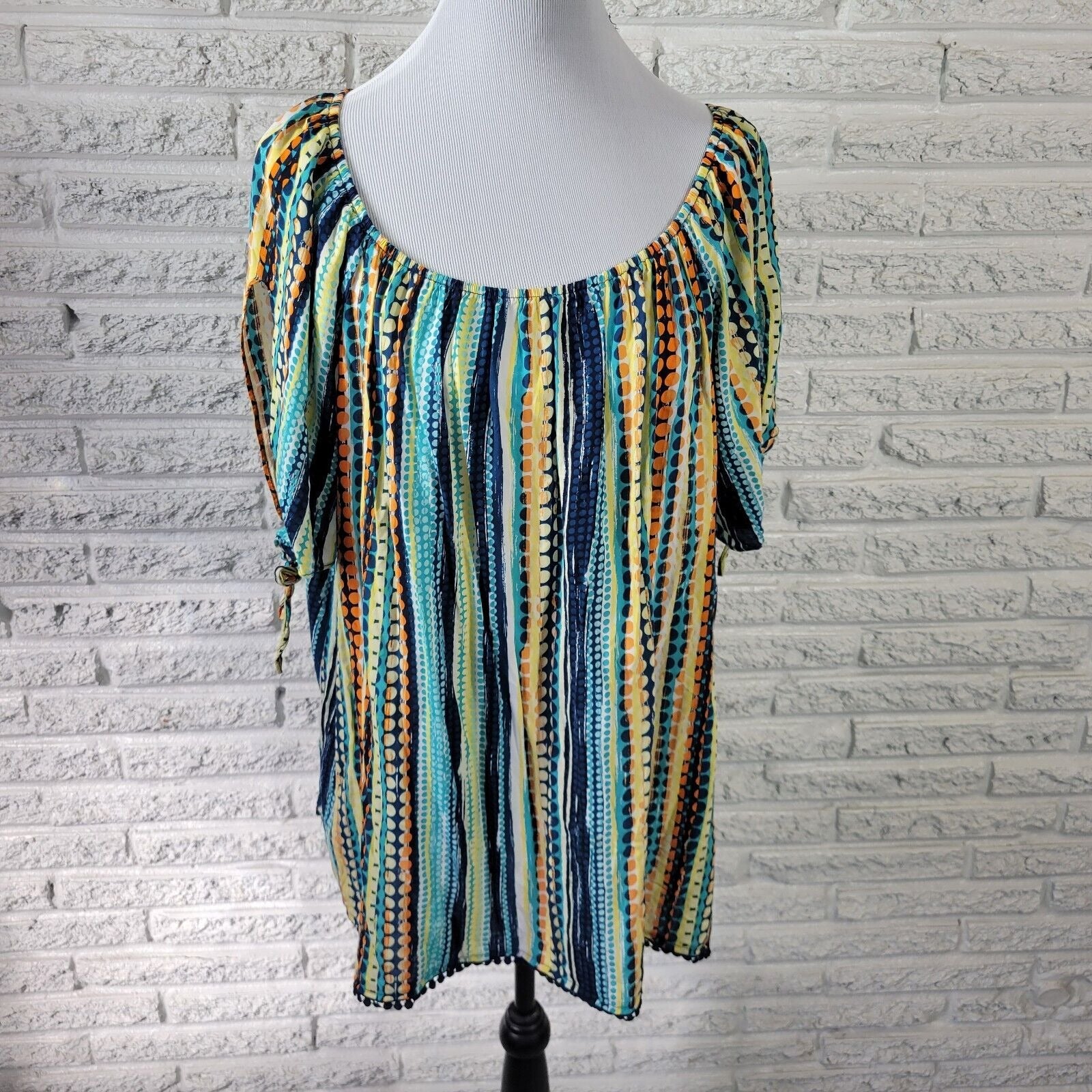 This beautiful blouse by Cato is perfect for any casual occasion. The top features an off-the-shoulder neckline and a pullover closure, with short sleeves and a lightweight, machine-washable material. The blue geometric pattern adds a touch of style, while the ric rac detailing on the hem adds a playful touch. This blouse is available in size 18W/20W and is perfect for all seasons, making it a versatile addition to any wardrobe. Whether you're dressing up or down, this top is sure to become a favorite.