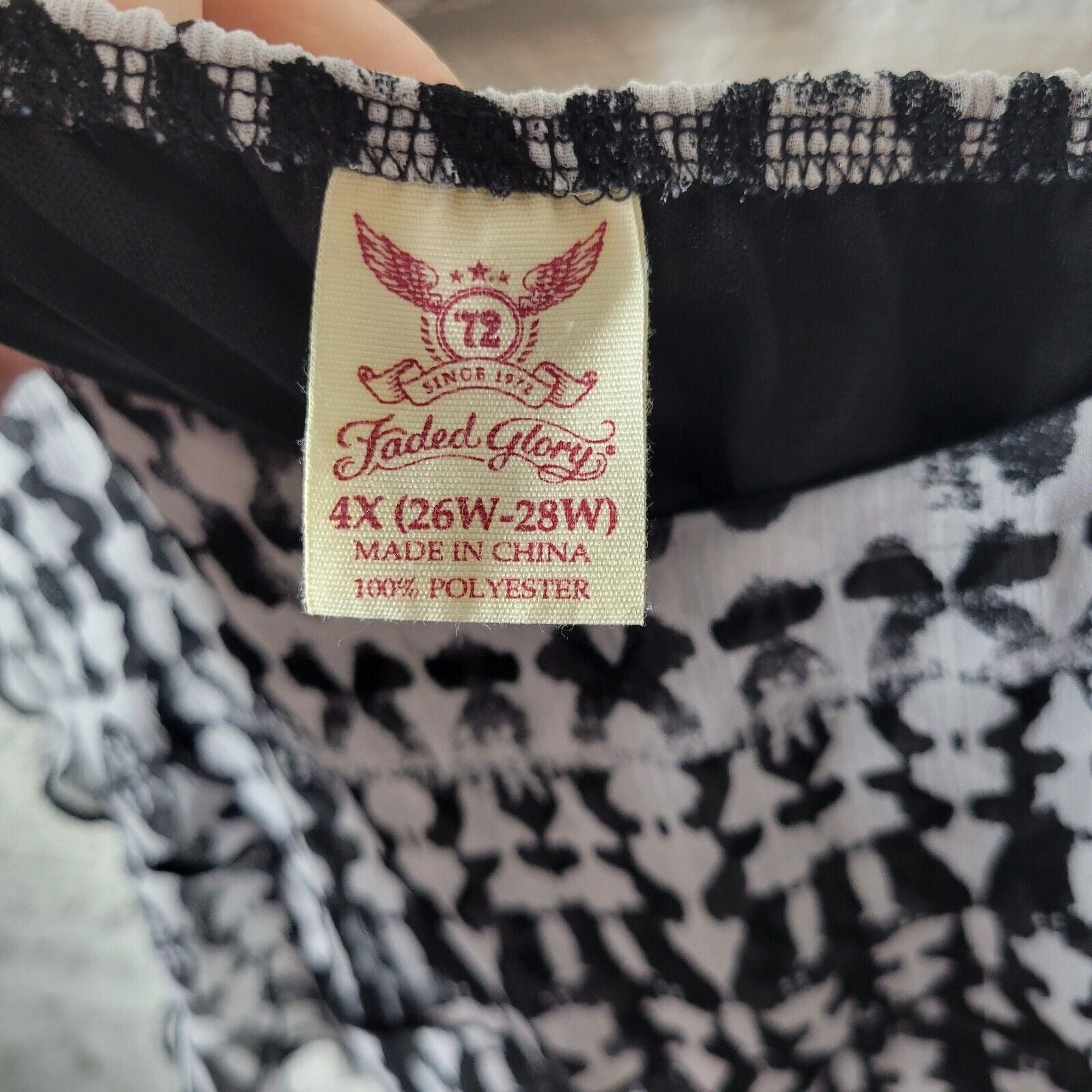 Add a touch of sophistication to your wardrobe with this Faded Glory slip sheath dress. The dress features a beautiful geometric pattern in black, perfect for any casual occasion. The sleeveless design with a round neckline and pullover closure adds to the ease of wear. Made of lightweight polyester material, this knee-length dress is perfect for all seasons - winter, summer, fall, and spring. The dress is lined and has a ruffle accent for a stylish touch. Available in size 4X, this plus-size dress is perfect for women who want to look and feel great.