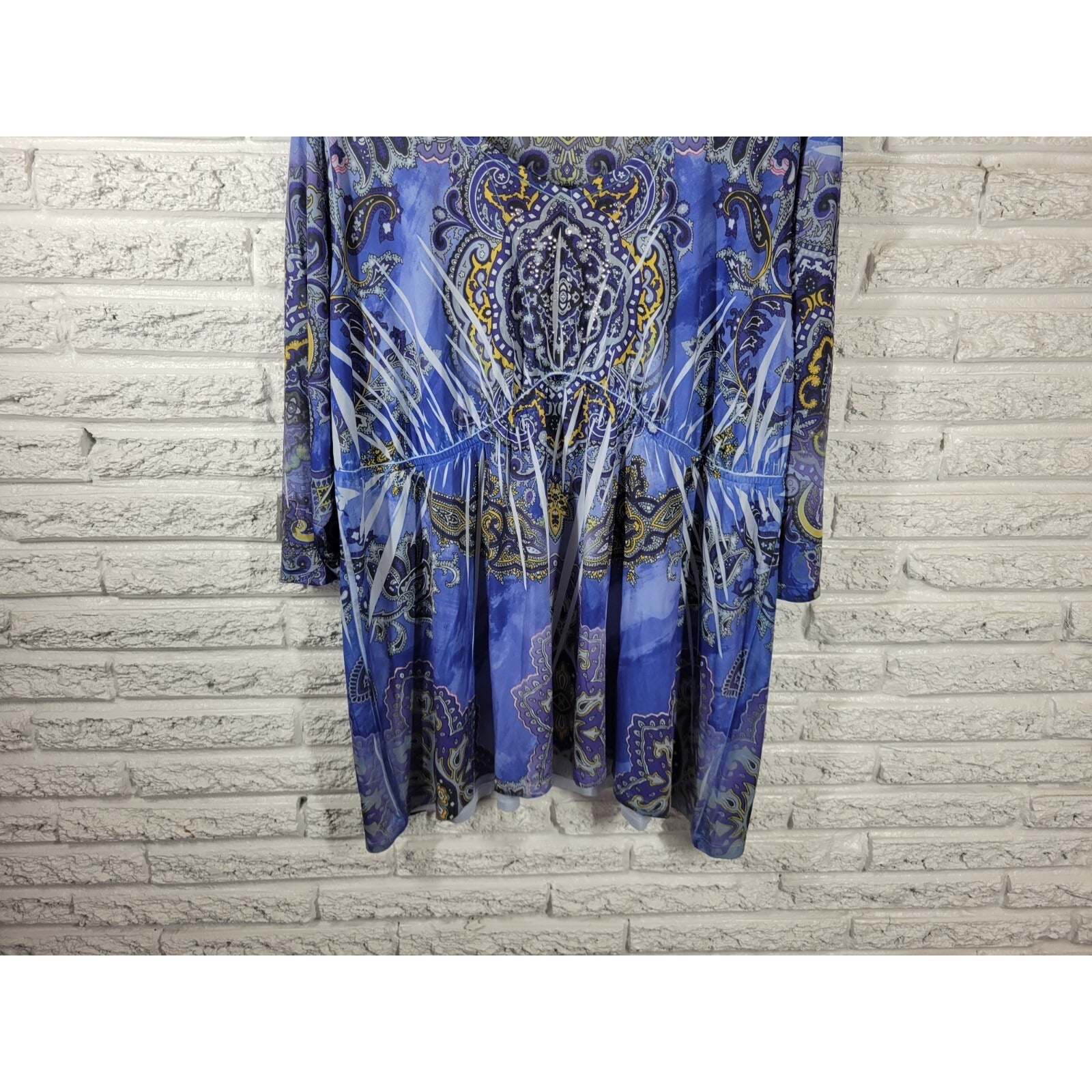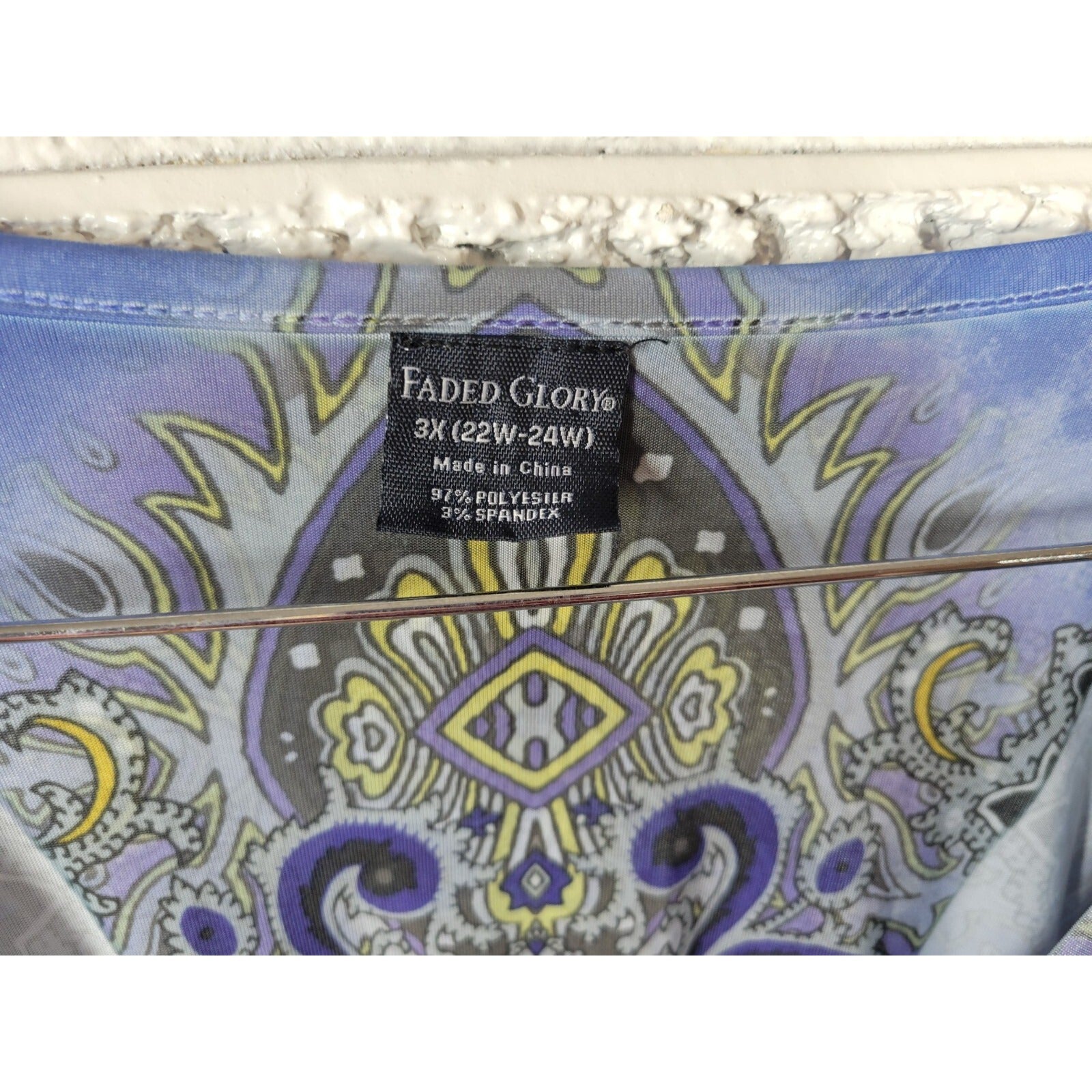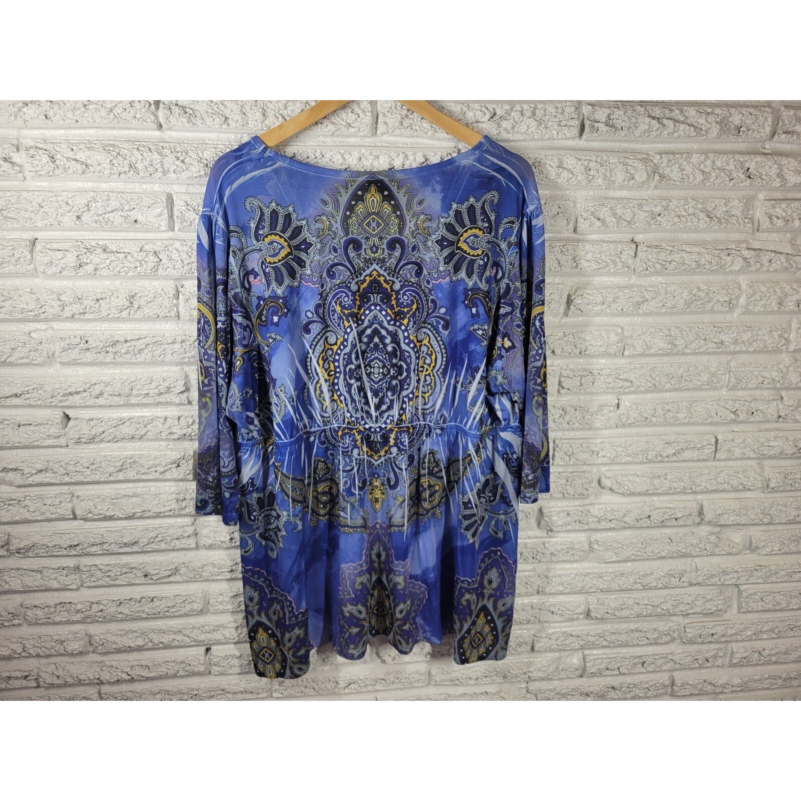 Faded Glory Womens Top 3X Plus Tunic 3/4 Sleeve Blue Paisley Laser Rhinestones