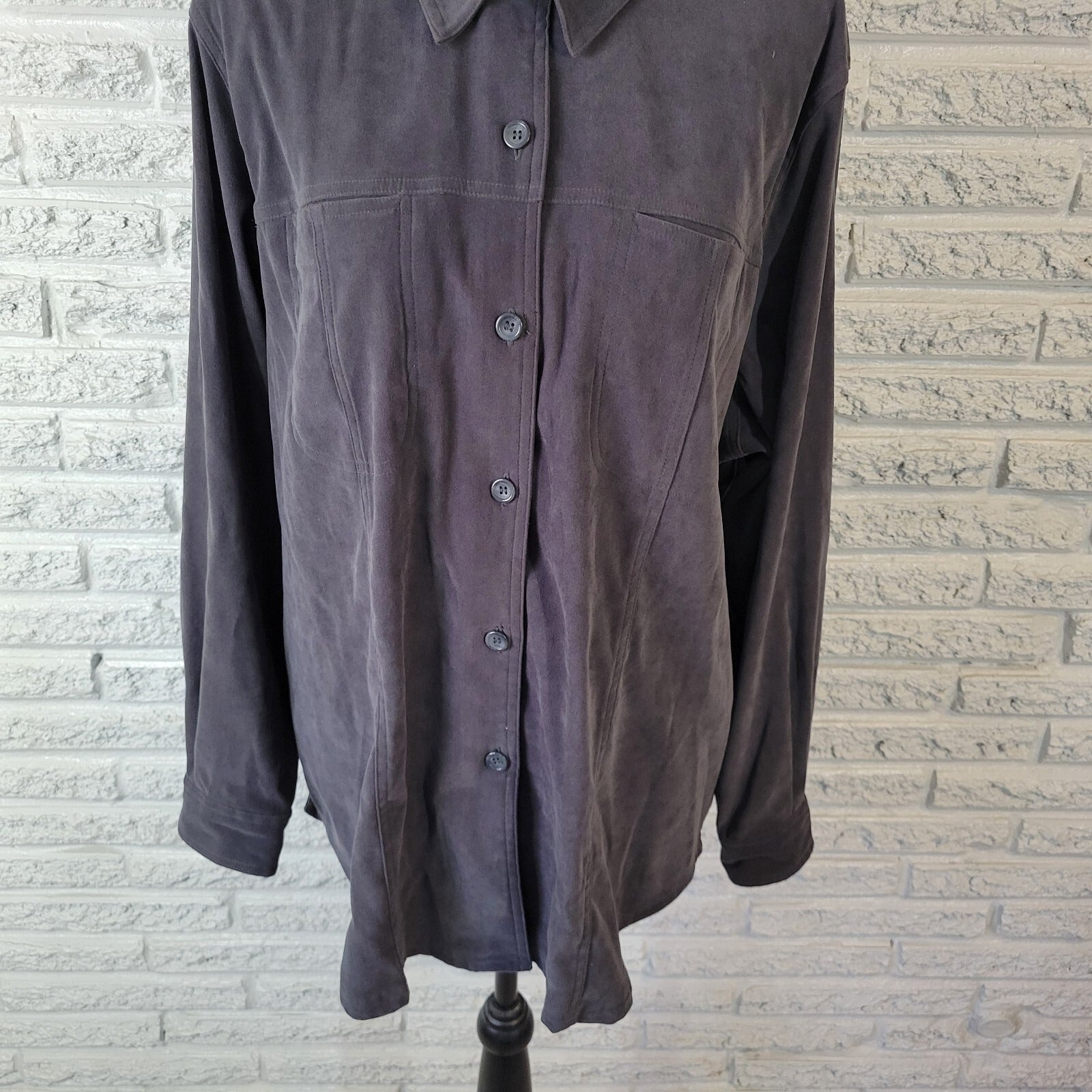 Dress up or dress down with this versatile Fashion Bug women's top, ideal for those who appreciate a blend of comfort and style. The gray velour polyester blend material offers a soft touch, while the stretch fabric ensures a snug fit for plus sizes 18/20. The classic collared neckline and long fitted sleeves make it a perfect choice for casual outings or travel, providing a polished look with a button-up closure.  This shirt is not just about its looks; it's practical too, featuring convenient pockets for your essentials. Whether you're facing the fall breeze or enjoying the spring sun, this top is designed to keep you comfortable in all seasons. Care instructions are simple—just machine wash and you're ready for your next adventure.