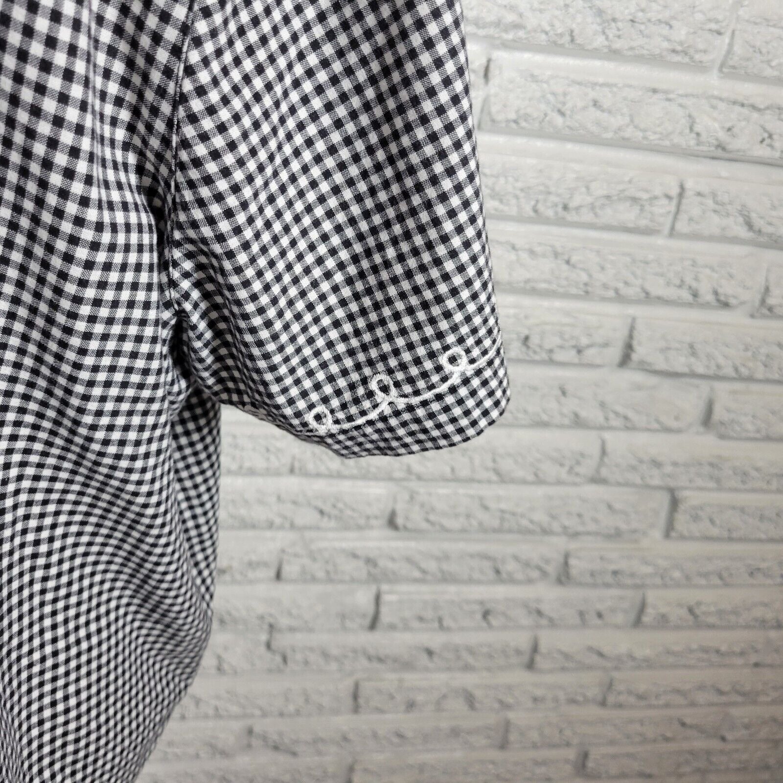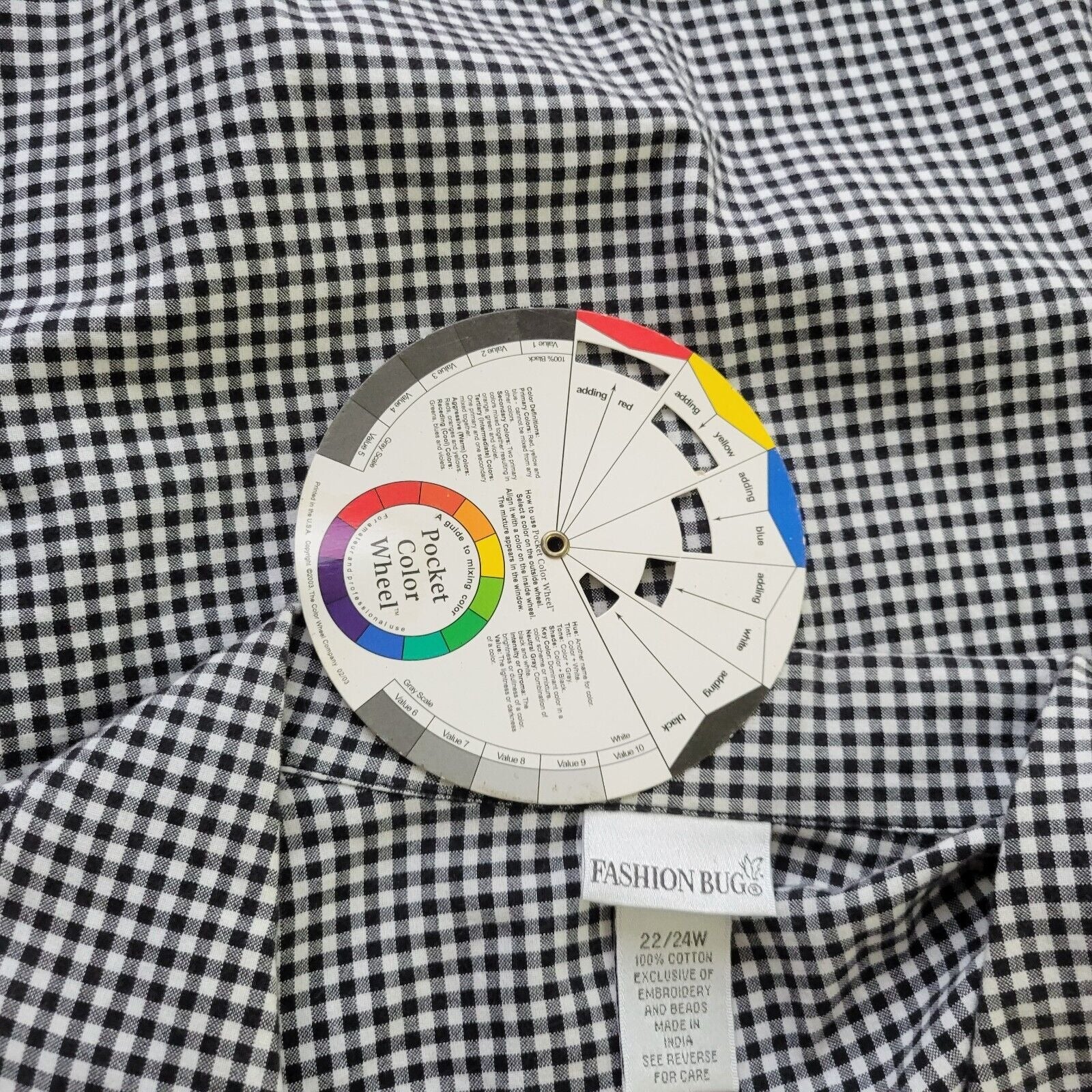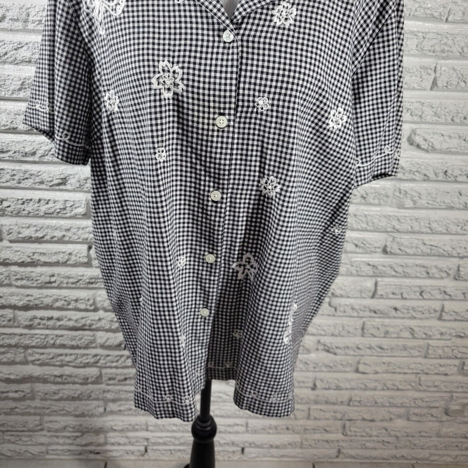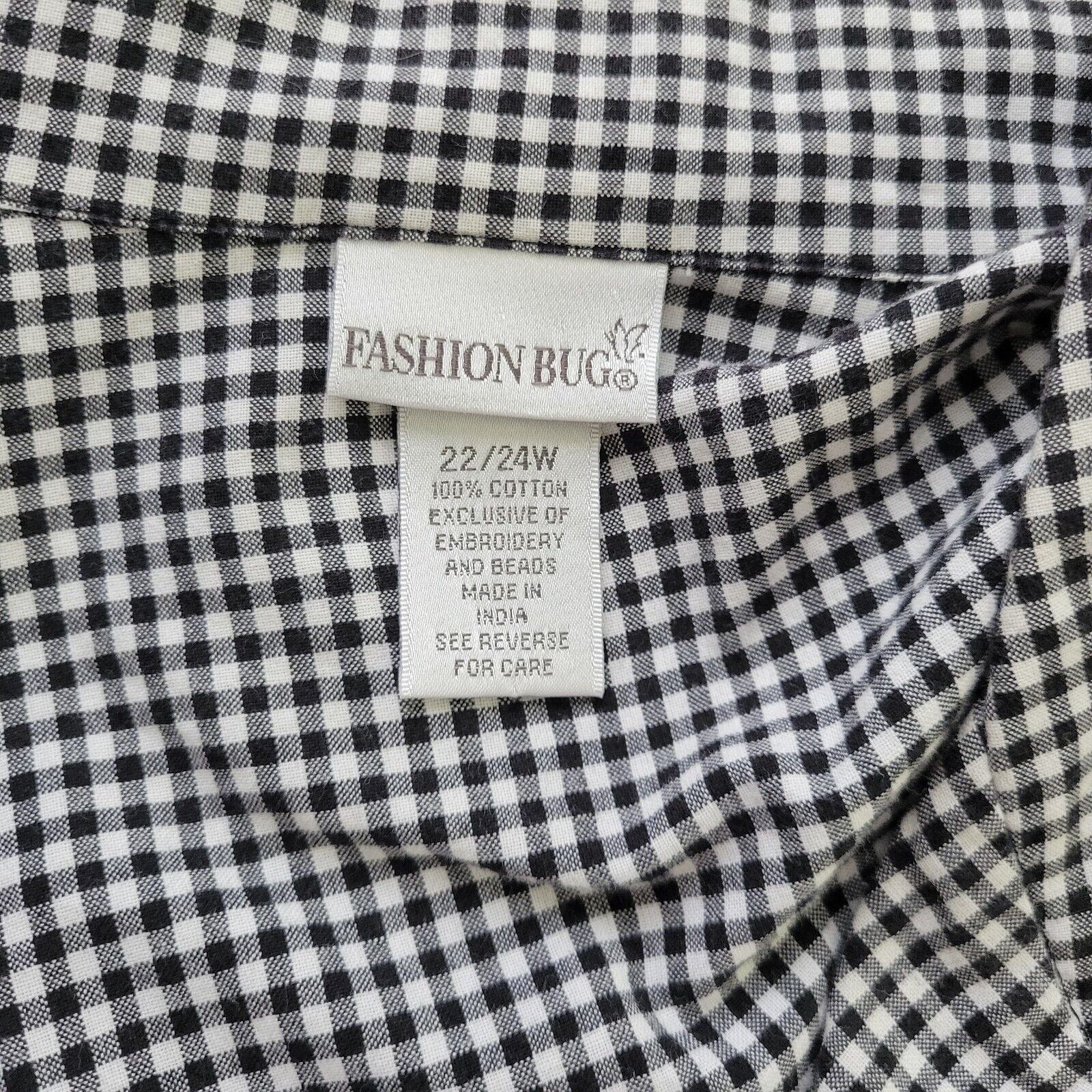 This Fashion Bug women's top is perfect for any casual occasion. The black plaid pattern, collared neckline, and button closure make it a versatile addition to your wardrobe. Short sleeves and a regular fit make it comfortable to wear, while the beaded and embroidered accents add a touch of elegance. Made from 100% cotton, this top is lightweight and suitable for all seasons. It is machine washable and easy to care for. The size is 22W/24W, and it is a plus size. This button-up top is perfect for women who want a basic but stylish piece of clothing.